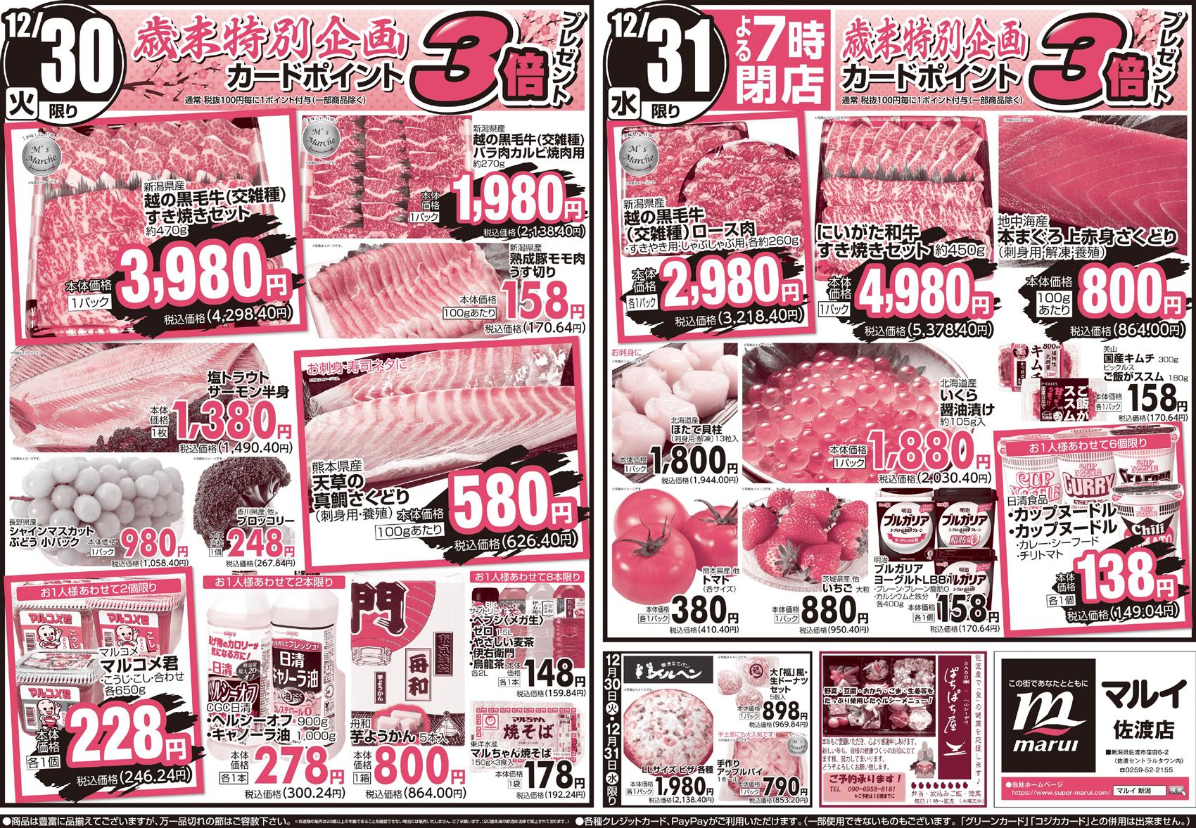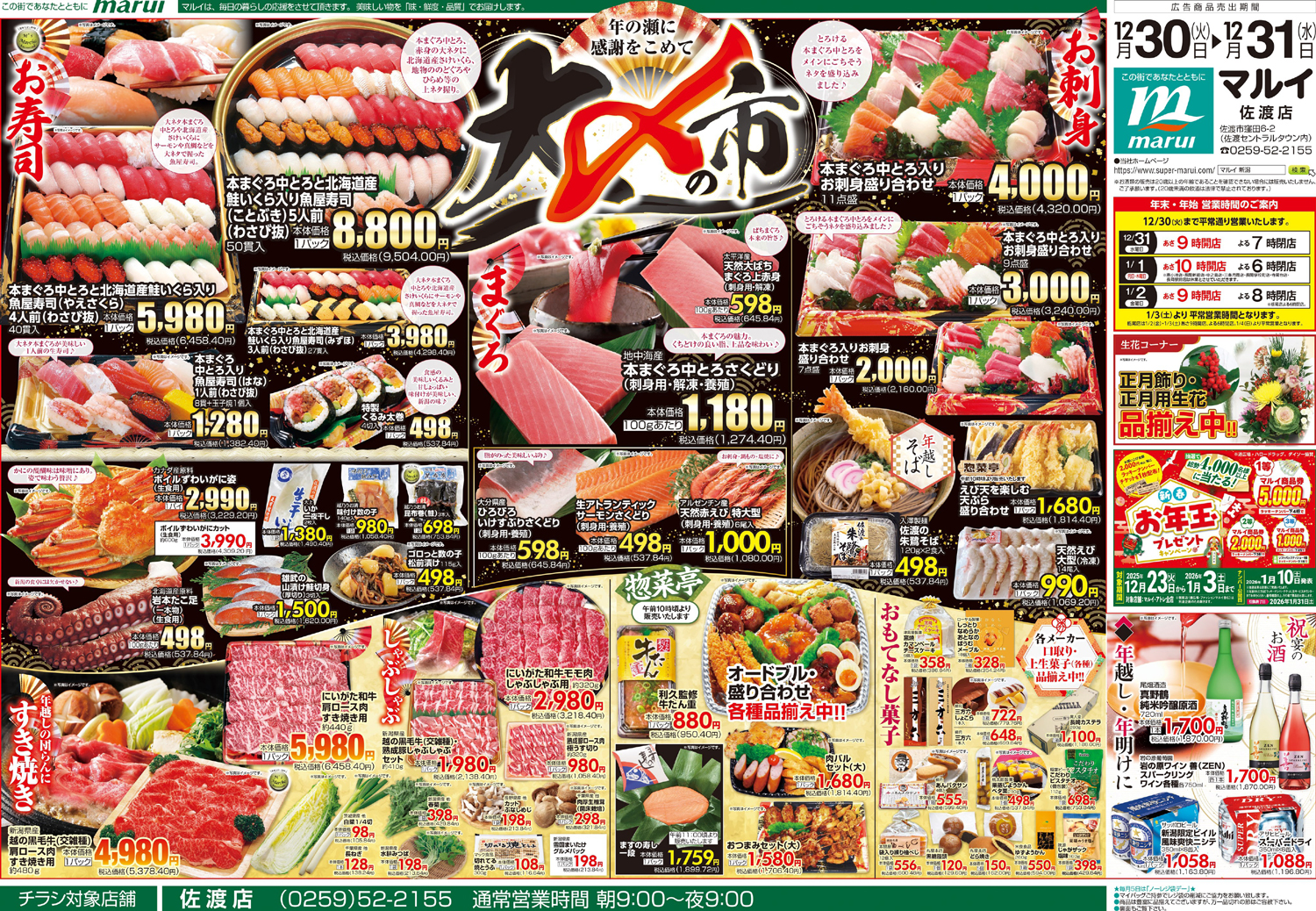 株式会社マルイ 【マルイ佐渡店チラシ】大〆の市 掲載期間:2025年12月29日〜2025年12月31日 佐渡 スーパーマルイ 画像をクリックして拡大 prev next セール・新店情報を見逃さない! ガタチラをホーム画面に追加して、 最新情報をすぐチェック▶追加方法はかんたん♪ 関連 どれもおいしそう!! 大みそかの御馳走はお寿司とお肉と贅沢しちゃおうかしら⁈