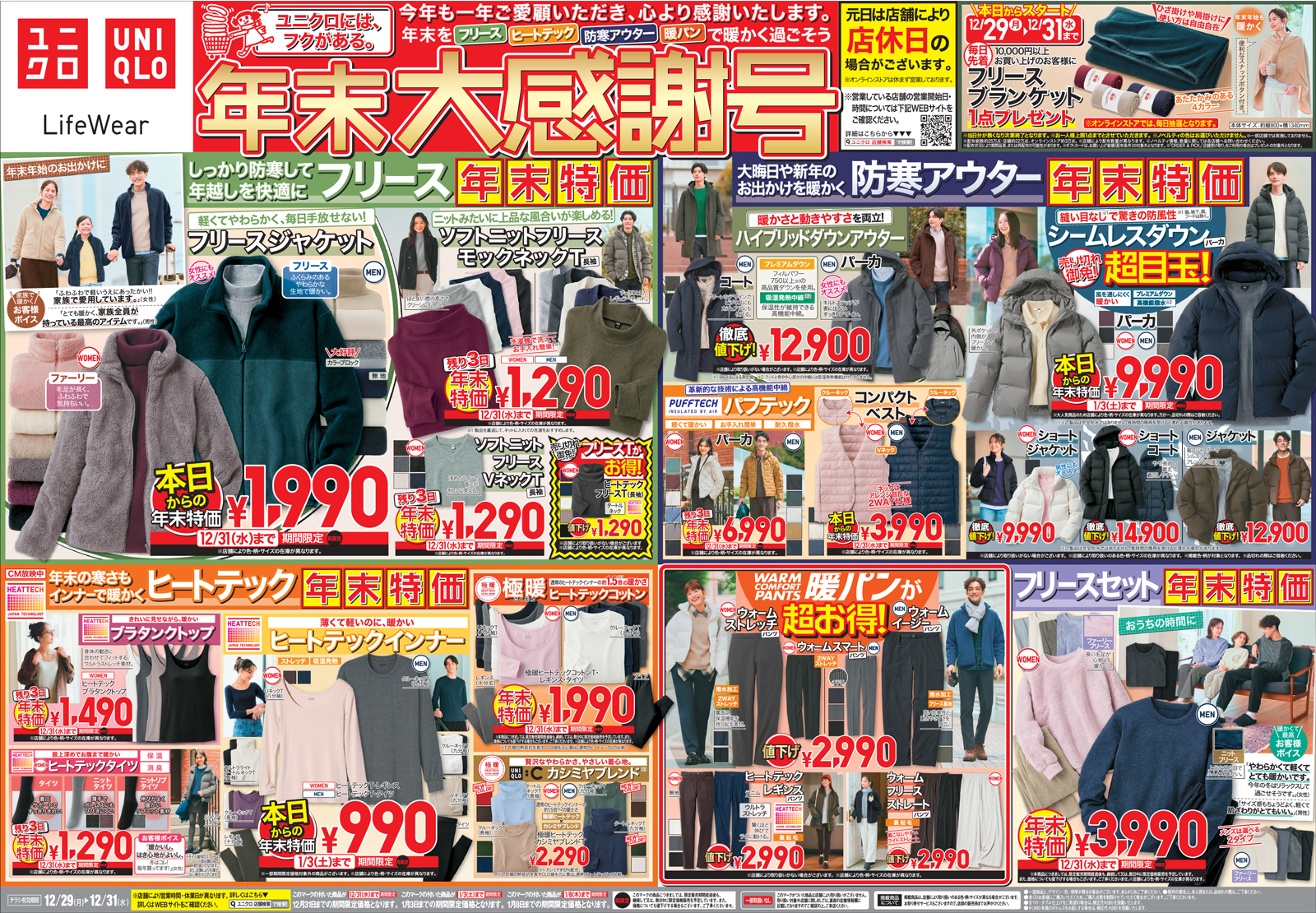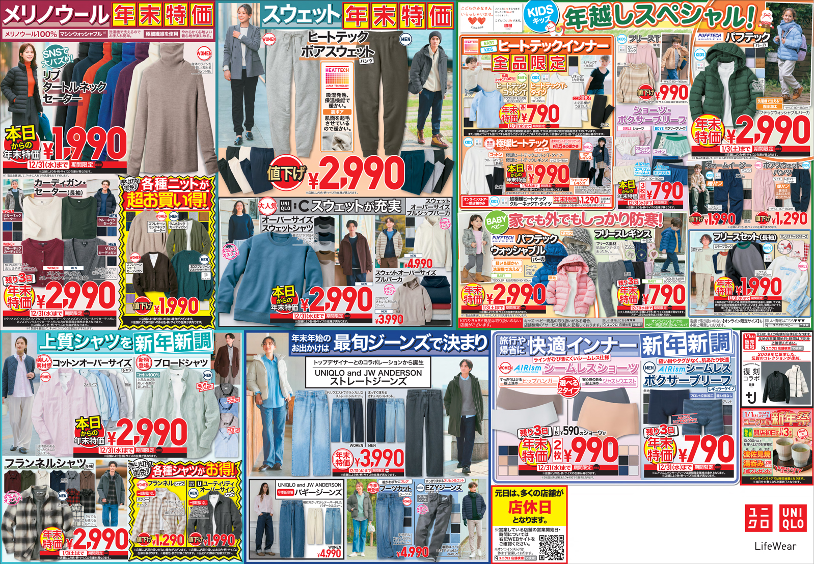 ユニクロ 【ユニクロチラシ】年末大感謝号 掲載期間:2025年12月29日〜2025年12月31日 上越中越新潟市下越 ファッション 画像をクリックして拡大 prev next セール・新店情報を見逃さない! ガタチラをホーム画面に追加して、 最新情報をすぐチェック▶追加方法はかんたん♪ 関連 初詣は暖かくて軽いコートで出かけたいわ!