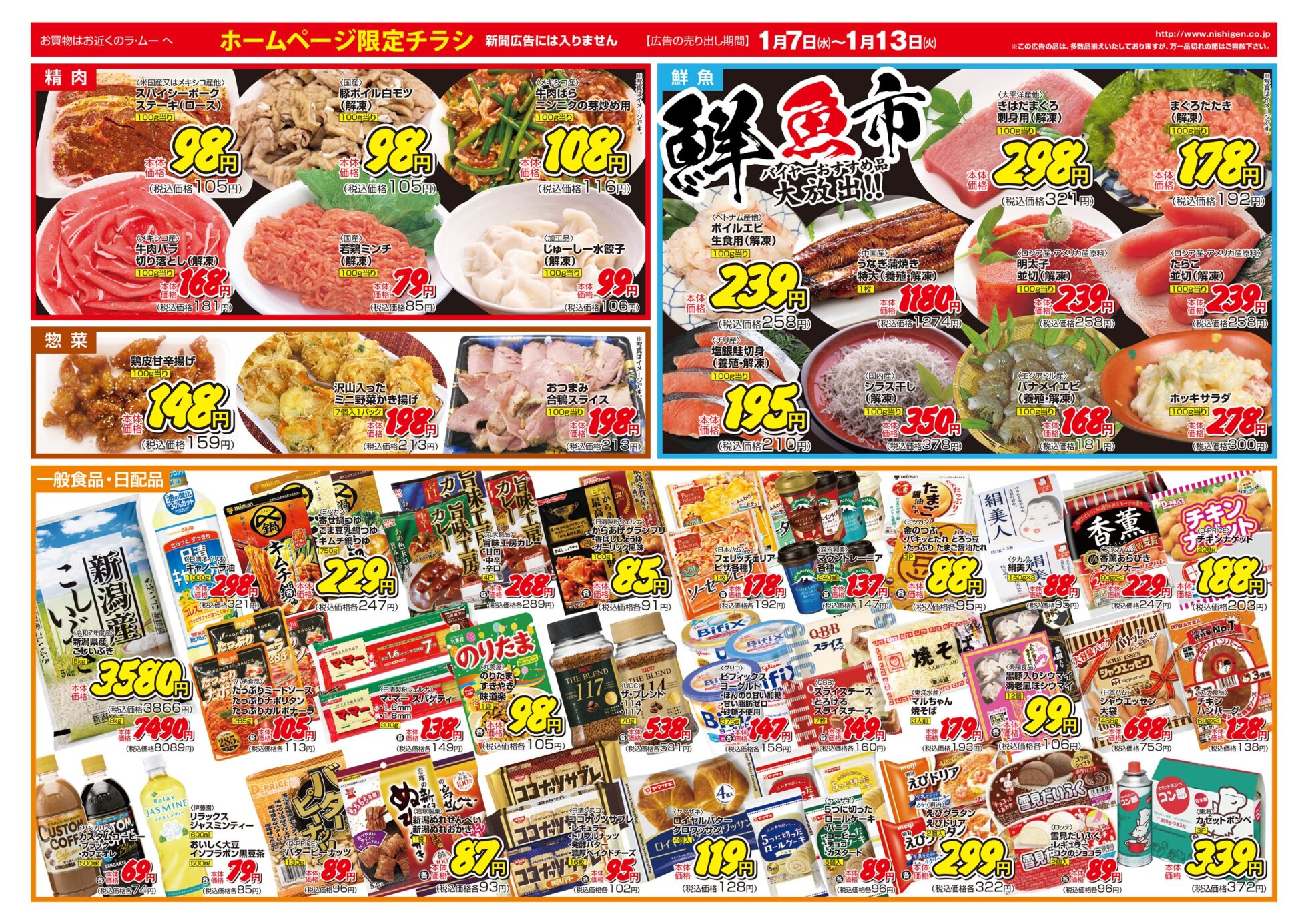 西源 【ラ・ムーチラシ】本気で価格に挑戦!! 掲載期間:2026年1月7日〜2026年1月13日 上越中越新潟市下越 スーパーラ・ムー 画像をクリックして拡大 prev next セール・新店情報を見逃さない! ガタチラをホーム画面に追加して、 最新情報をすぐチェック▶追加方法はかんたん♪ 関連 バイヤーが選んだ美味しいものをぜひいただいてみたいわ♪