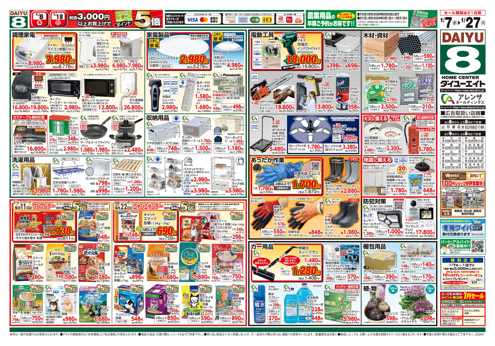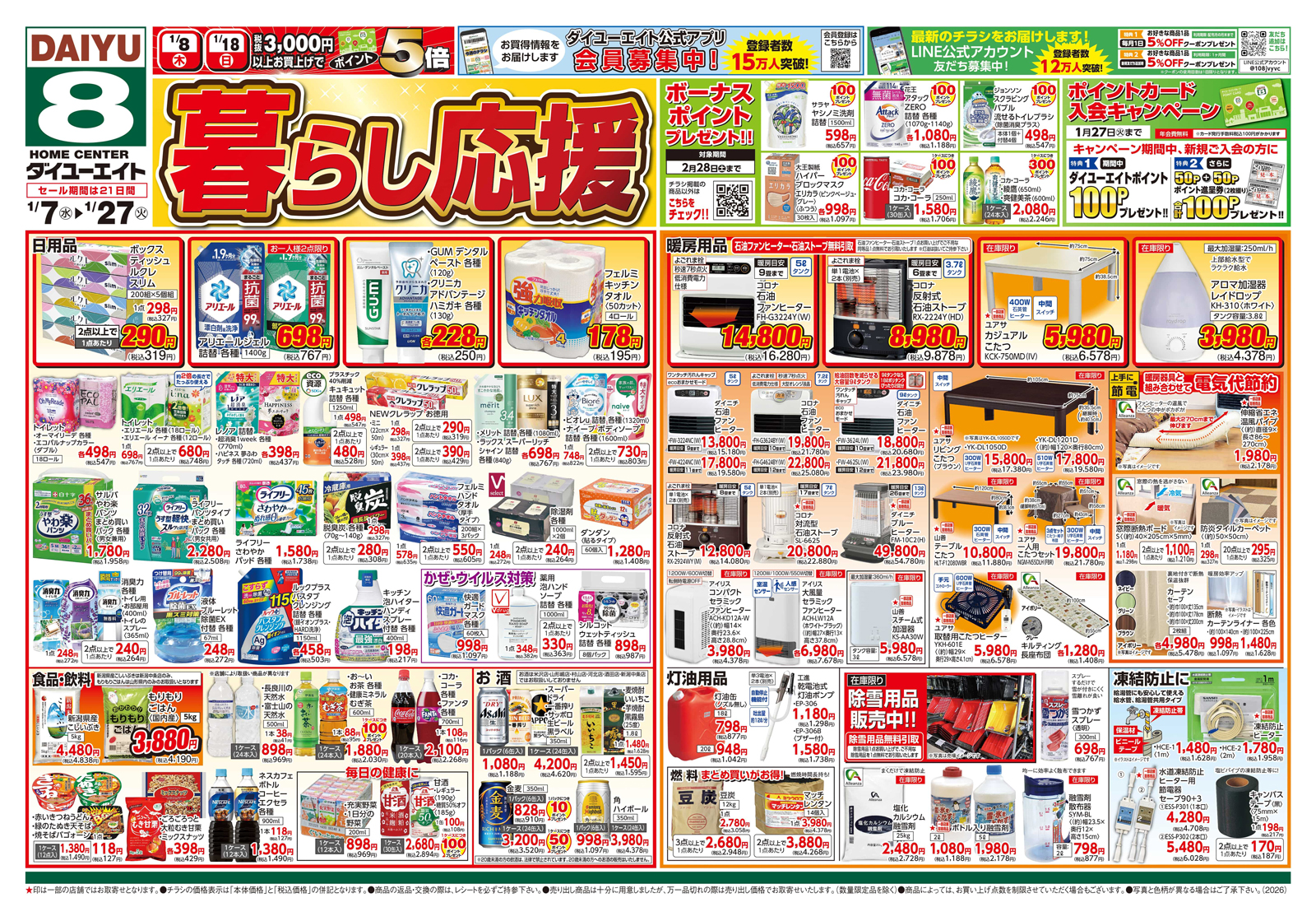 ダイユーエイト 【ダイユーエイトチラシ】暮らし応援 掲載期間:2026年1月7日〜2026年1月27日 下越 ホームセンター 画像をクリックして拡大 prev next セール・新店情報を見逃さない! ガタチラをホーム画面に追加して、 最新情報をすぐチェック▶追加方法はかんたん♪ 関連 ポイントを貯めて上手に節約しましょう!