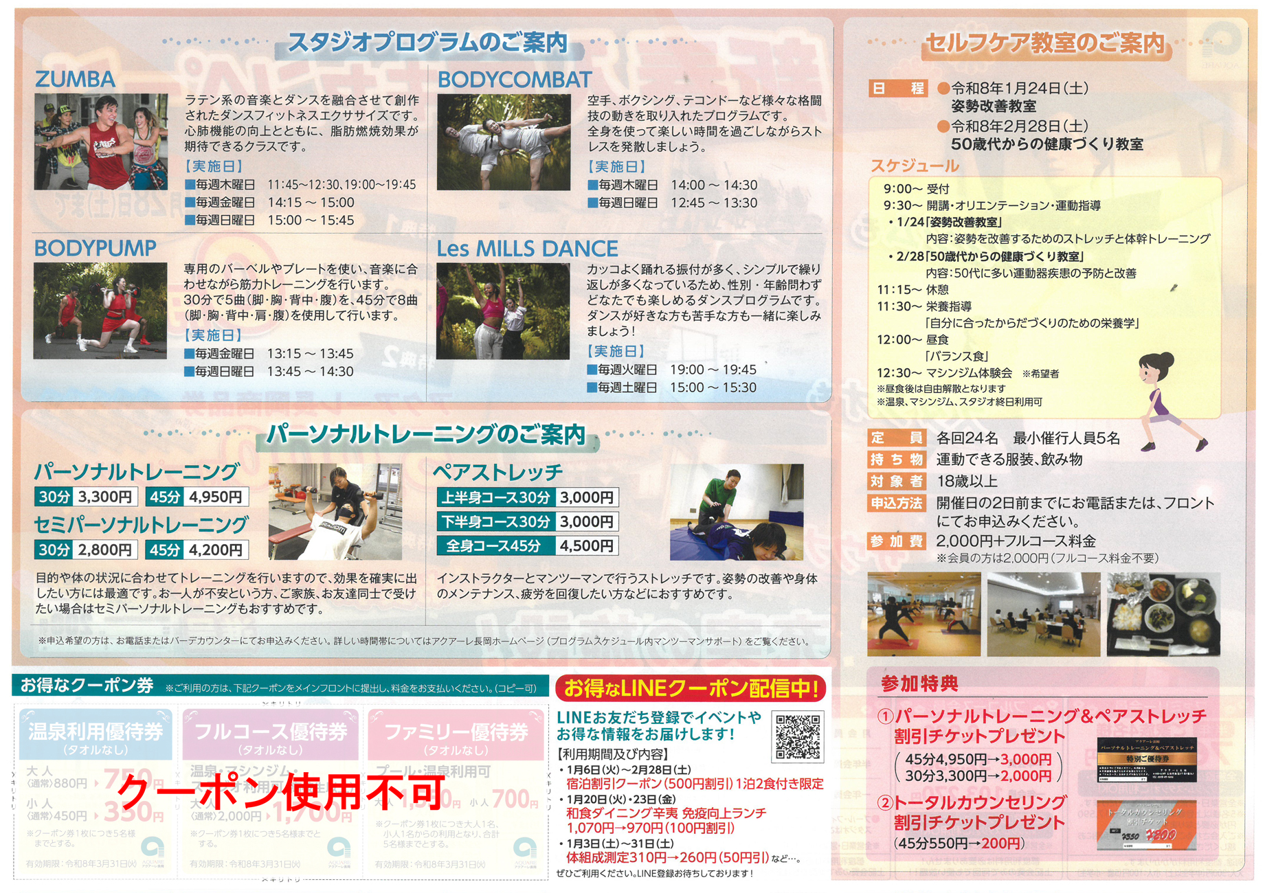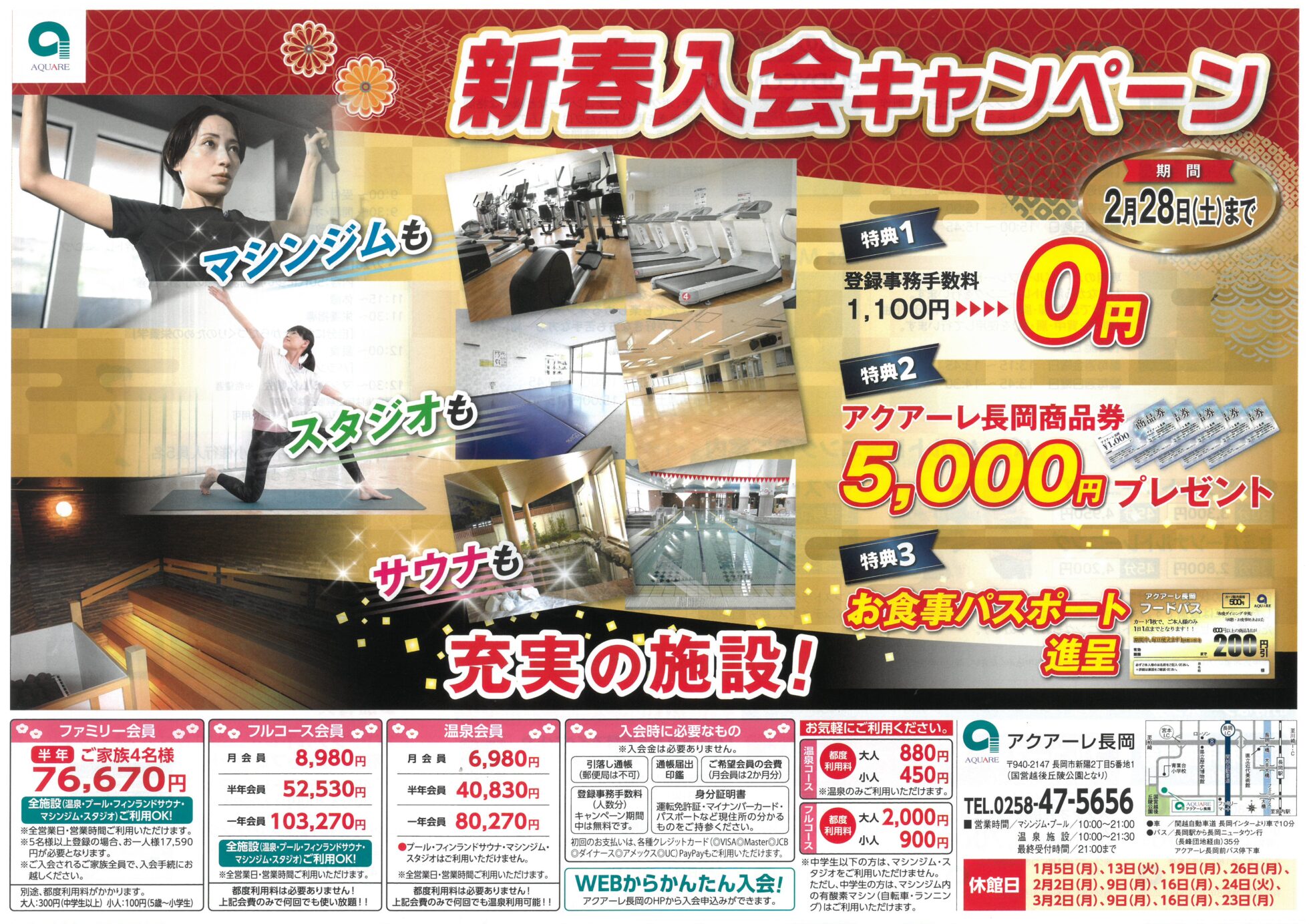 アクアーレ長岡 【アクアーレ長岡チラシ】新春入会キャンペーン商品券5,000円プレゼント 掲載期間:2026年1月3日〜2026年2月28日 中越 入浴・スパスポーツジム 画像をクリックして拡大 prev next ※クーポン使用不可 セール・新店情報を見逃さない! ガタチラをホーム画面に追加して、 最新情報をすぐチェック▶追加方法はかんたん♪ 関連 温泉会員は温泉入り放題ね!
