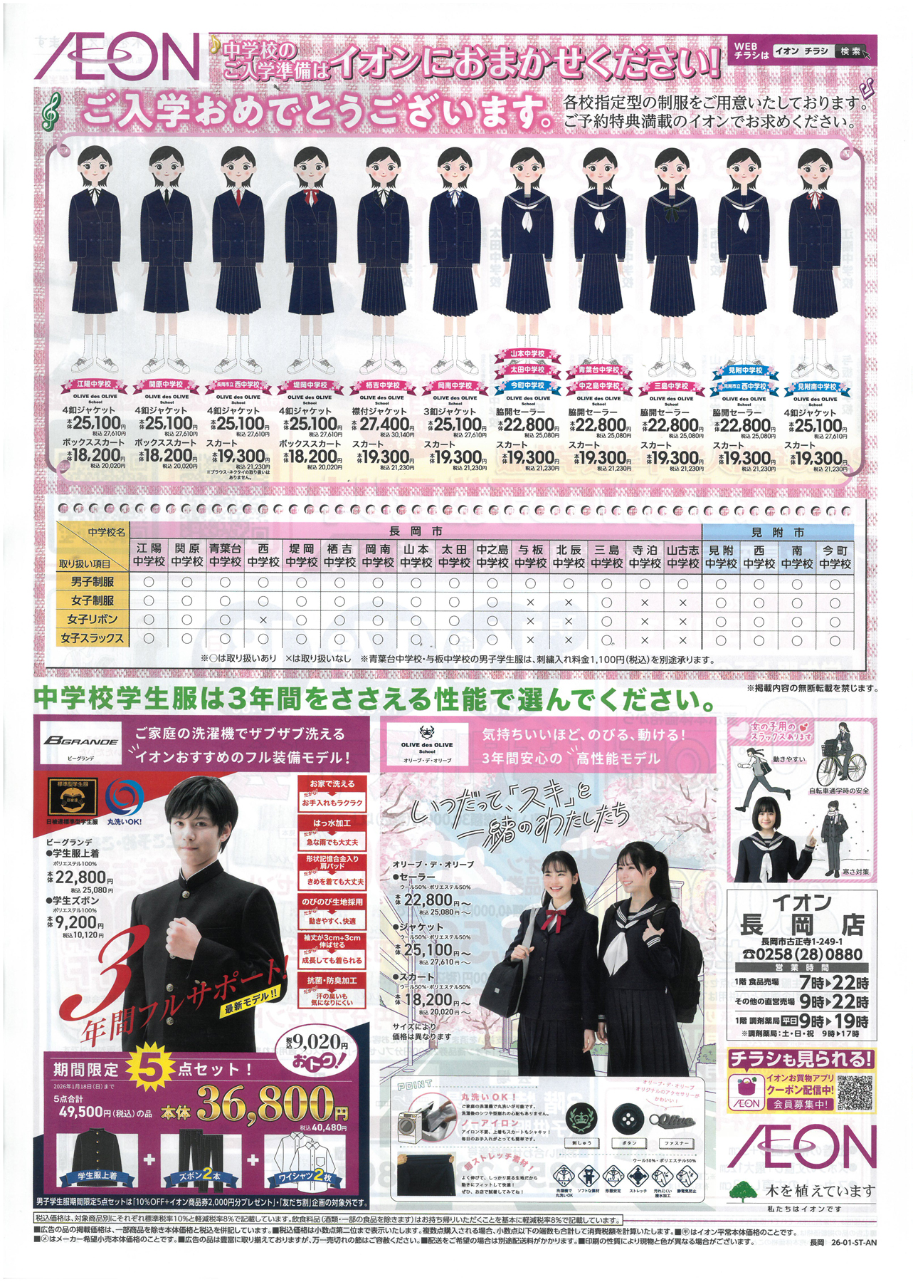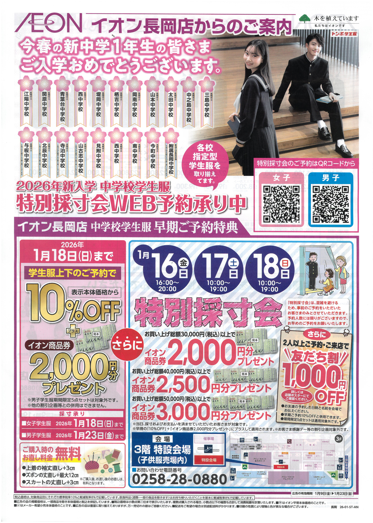 イオン長岡店 【イオン長岡店チラシ】中学校学生服WEB予約承り中/特別採寸会 掲載期間:2026年1月9日〜2026年1月23日 中越 イオンファッション 画像をクリックして拡大 prev next セール・新店情報を見逃さない! ガタチラをホーム画面に追加して、 最新情報をすぐチェック▶追加方法はかんたん♪ 関連 1月18日までに予約して、お得に制服を購入しましょう♪