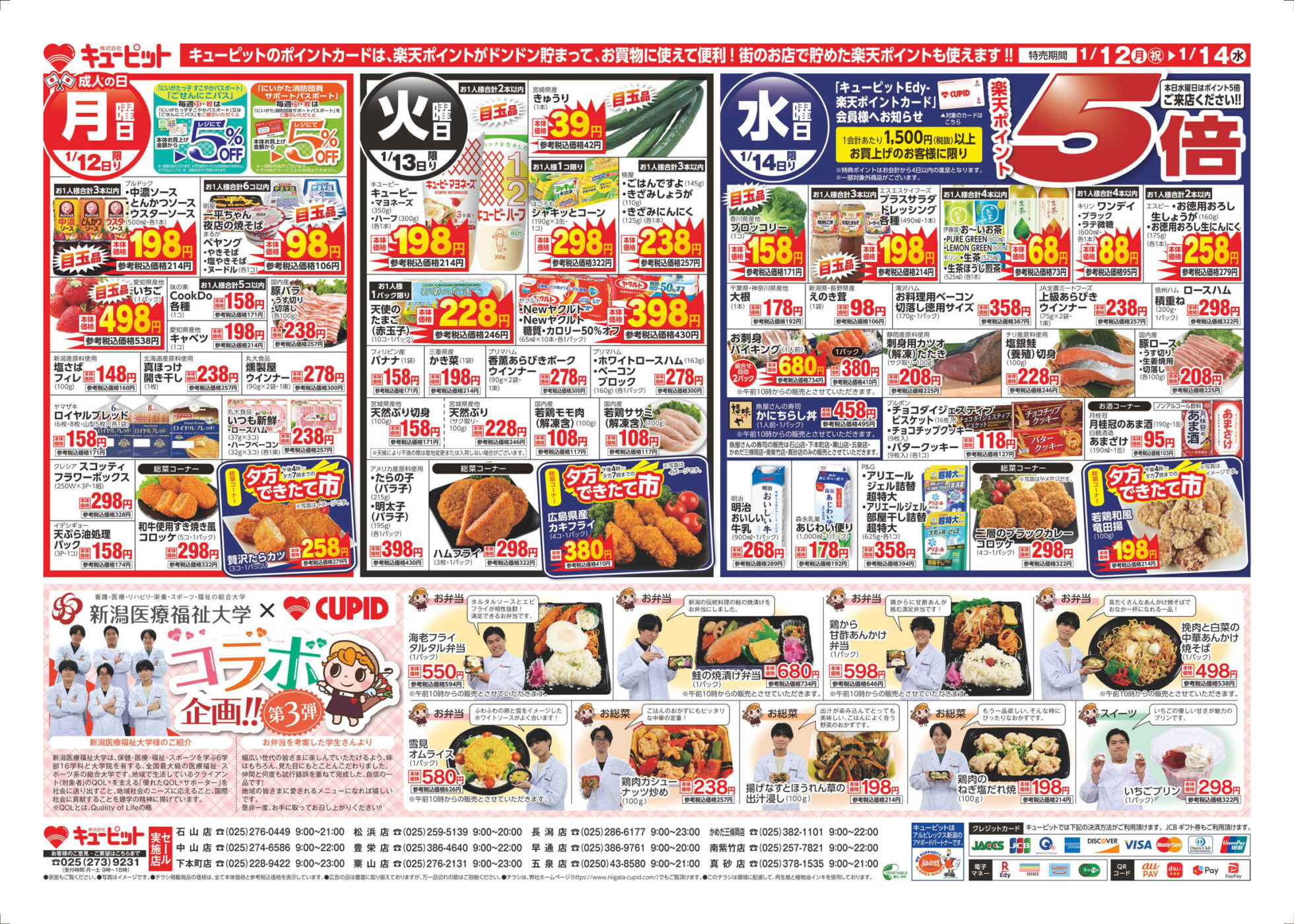キューピット 【キューピットチラシ】SUPER ゾロ目市 掲載期間:2026年1月12日〜2026年1月14日 新潟市下越 スーパーキューピット 画像をクリックして拡大 prev next セール・新店情報を見逃さない! ガタチラをホーム画面に追加して、 最新情報をすぐチェック▶追加方法はかんたん♪ 関連 お買得品がたくさんあるわ~♪