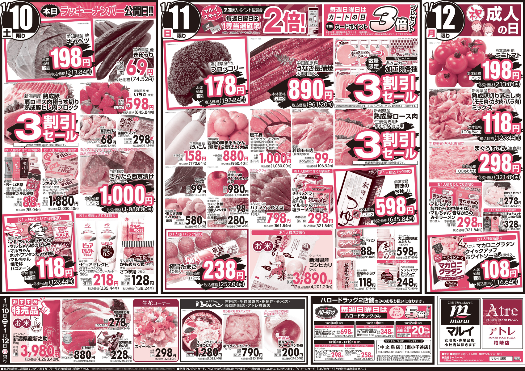 株式会社マルイ 【アトレ柏崎店チラシ】3連休のごちそう日和 掲載期間:2026年1月10日〜2026年1月12日 中越 スーパーマルイ 画像をクリックして拡大 prev next セール・新店情報を見逃さない! ガタチラをホーム画面に追加して、 最新情報をすぐチェック▶追加方法はかんたん♪ 関連 ステーキ食べたいわね~♪