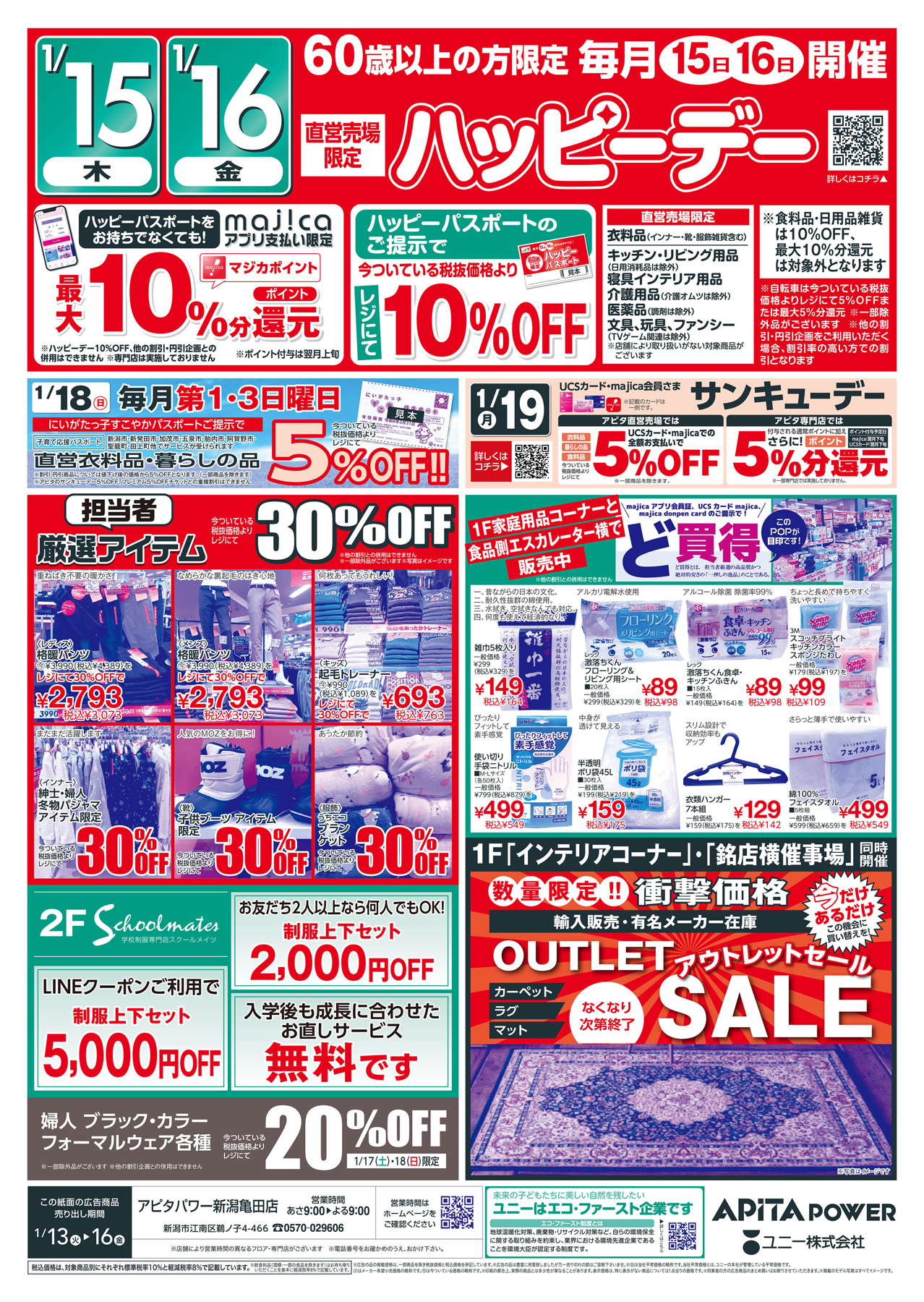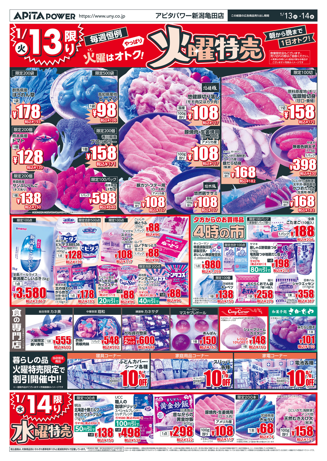 アピタパワー新潟亀田店 【アピタパワー新潟亀田店チラシ】火曜はオトク!火曜特売 掲載期間:2026年1月13日〜2026年1月16日 新潟市 スーパーアピタ 画像をクリックして拡大 prev next セール・新店情報を見逃さない! ガタチラをホーム画面に追加して、 最新情報をすぐチェック▶追加方法はかんたん♪ 関連 ピーマンの肉詰めでも 作ろうかしら~♪