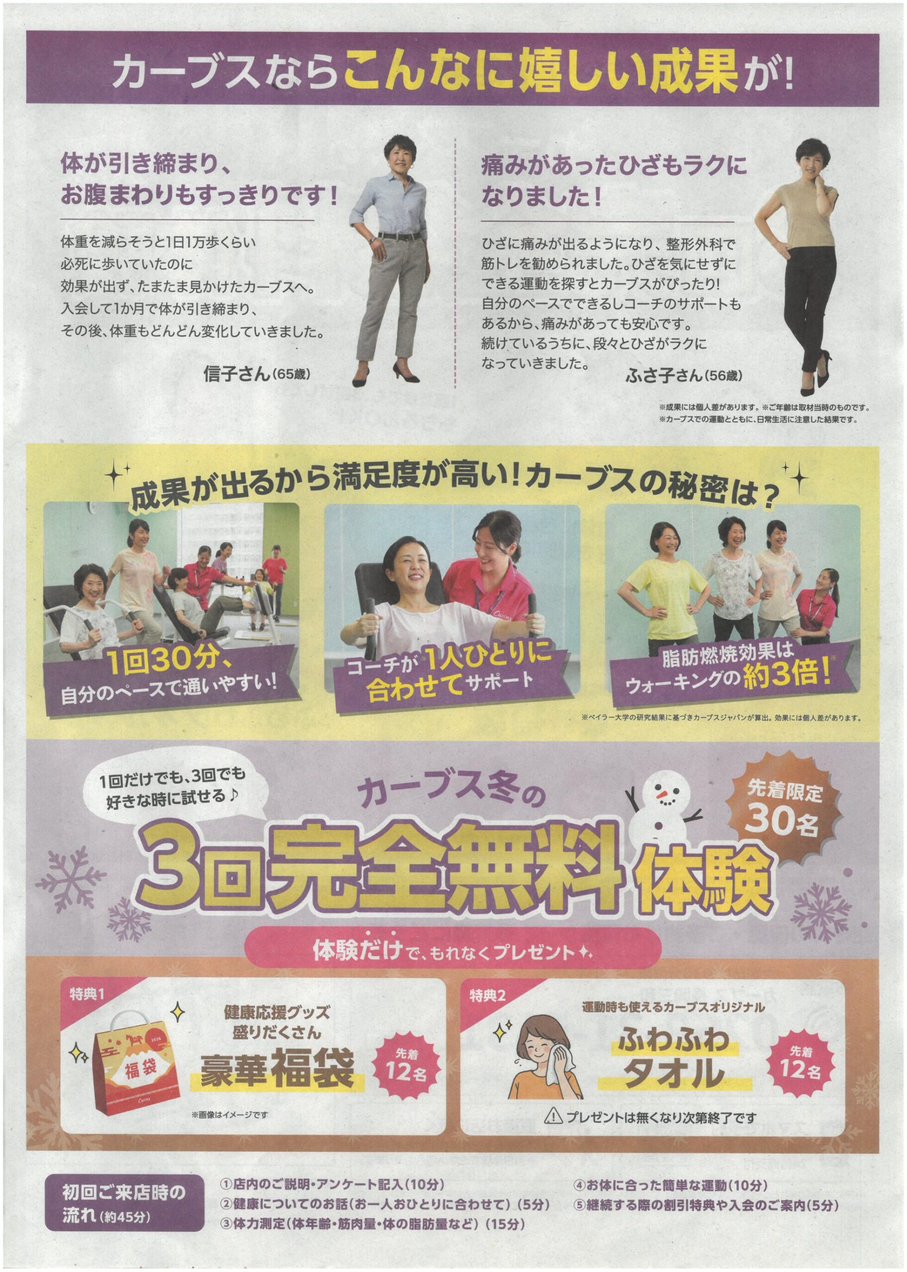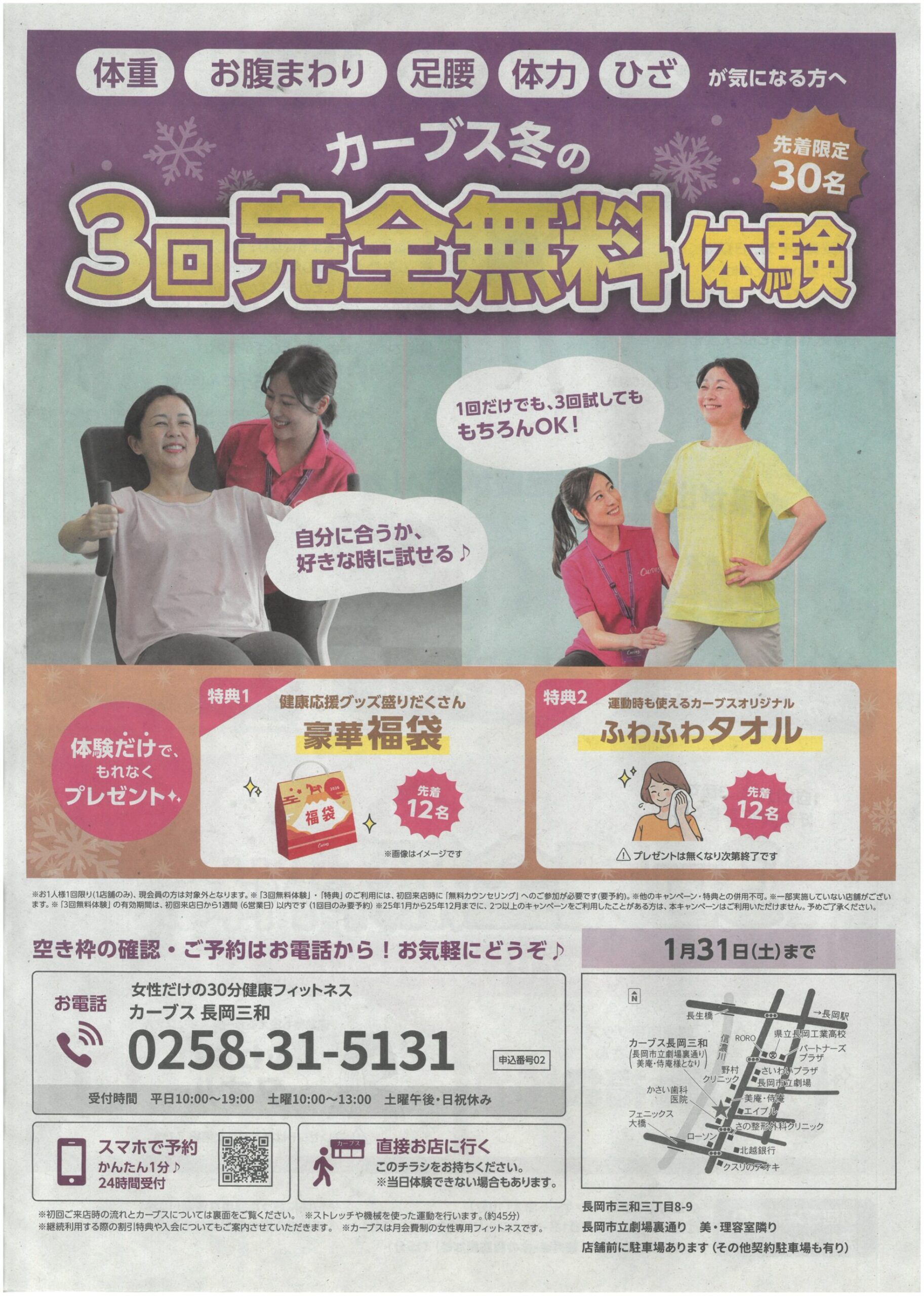 カーブス長岡三和 【カーブス長岡三和チラシ】カーブス冬の3回完全無料体験 掲載期間:2026年1月13日〜2026年1月31日 中越 スポーツジム 画像をクリックして拡大 prev next セール・新店情報を見逃さない! ガタチラをホーム画面に追加して、 最新情報をすぐチェック▶追加方法はかんたん♪ 関連 3回も無料でうれしいわね♪