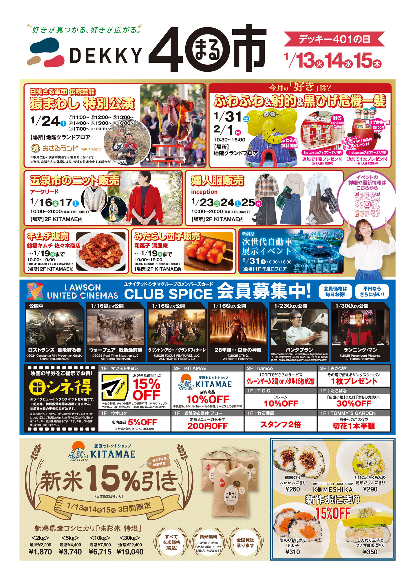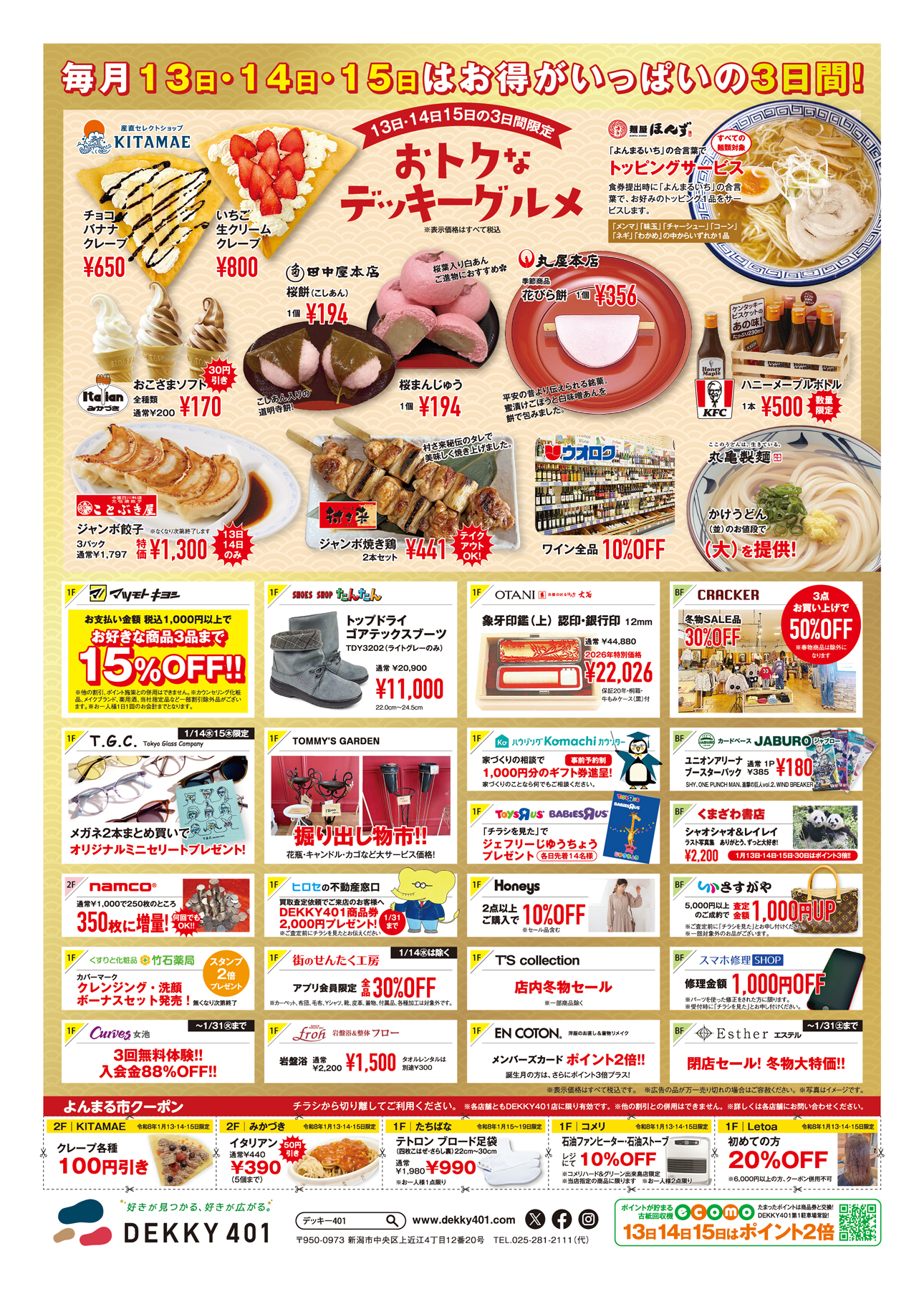 DEKKY401 【DEKKY401チラシ】よんまる市 掲載期間:2026年1月13日〜2026年2月12日 新潟市 百貨店・ショッピングセンター 画像をクリックして拡大 prev next ・クーポン利用不可 ・1Fトイザらス脇インフォメーションに設置の当チラシ(数量限定)をご利用いただけます セール・新店情報を見逃さない! ガタチラをホーム画面に追加して、 最新情報をすぐチェック▶追加方法はかんたん♪ 関連 新米がお得に買えるのね♪