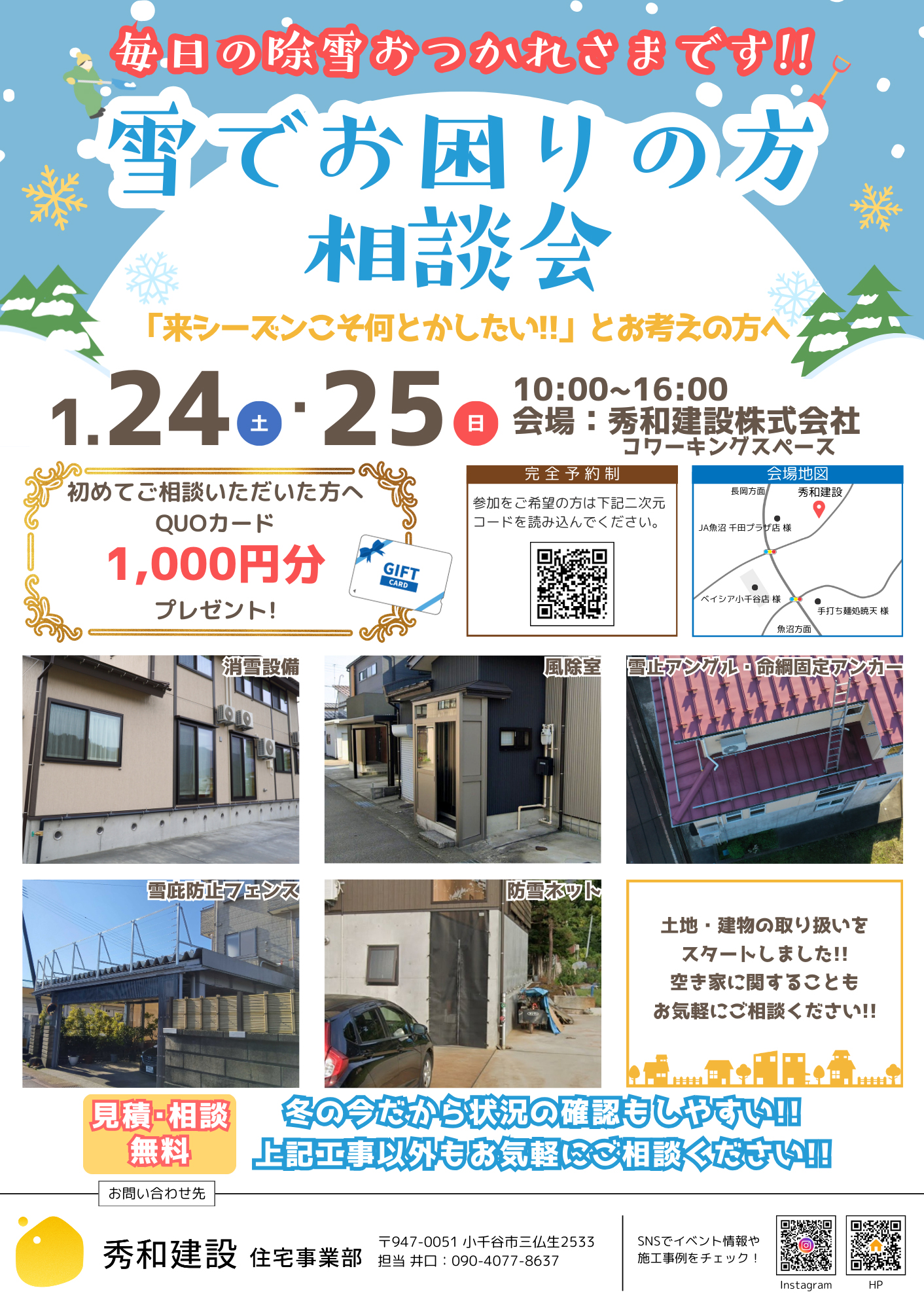 秀和建設 【秀和建設チラシ】雪にお困りの方相談会 掲載期間:2026年1月20日〜2026年1月25日 中越 生活サービス 画像をクリックして拡大 prev next セール・新店情報を見逃さない! ガタチラをホーム画面に追加して、 最新情報をすぐチェック▶追加方法はかんたん♪ 関連 雪の悩み事に幅広く 対応しているのね♪