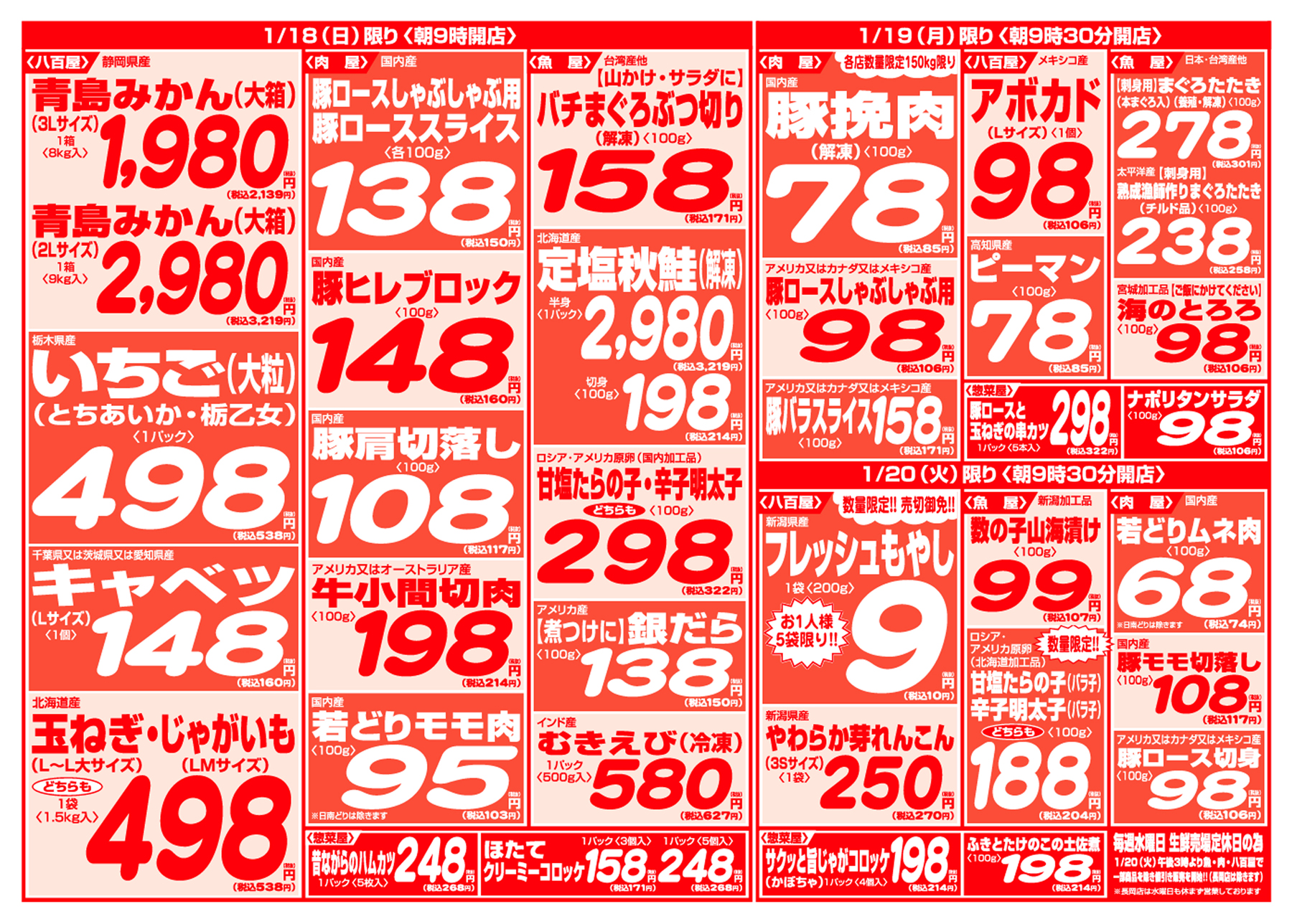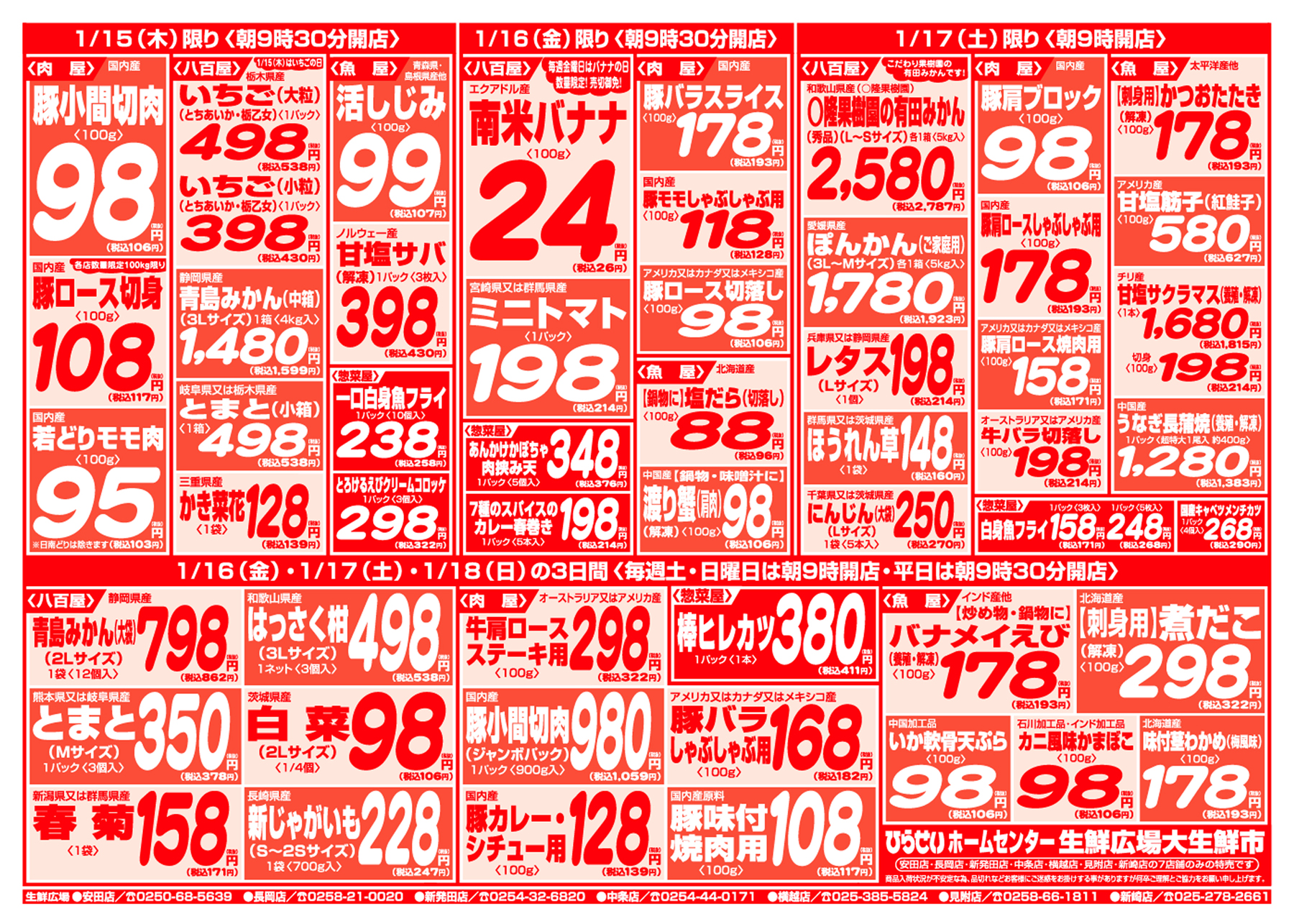 川松食品 【ひらせいホームセンター生鮮広場チラシ】大生鮮市 掲載期間:2026年1月15日〜2026年1月20日 中越新潟市下越 スーパーひらせい生鮮広場 画像をクリックして拡大 prev next セール・新店情報を見逃さない! ガタチラをホーム画面に追加して、 最新情報をすぐチェック▶追加方法はかんたん♪ 関連 ミニトマトがお買得ね♪