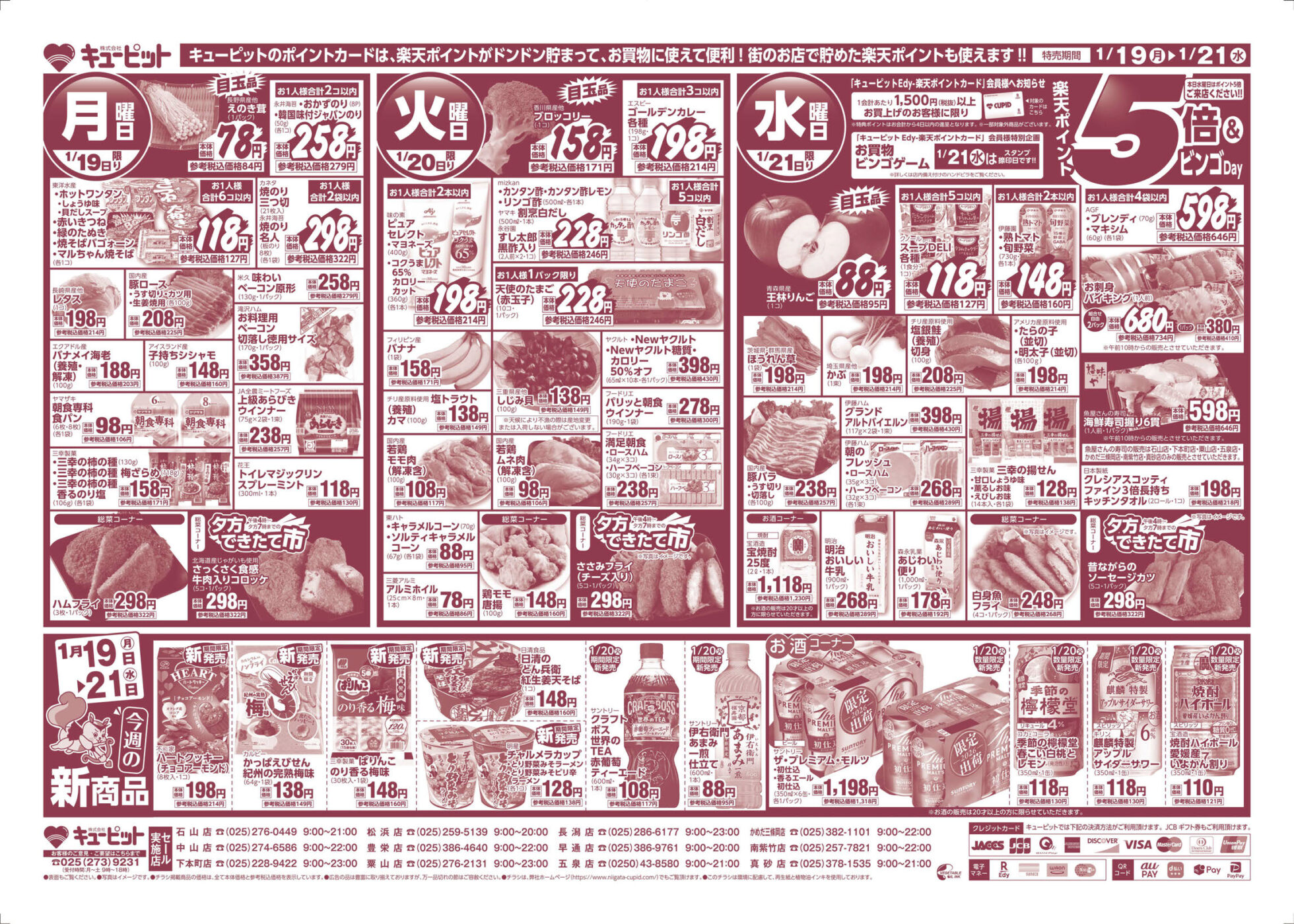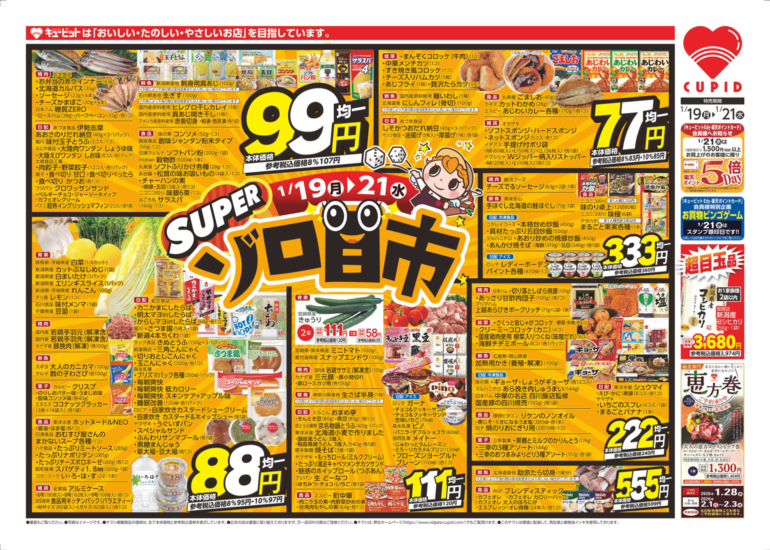 キューピット 【キューピットチラシ】SUPERゾロ目市 掲載期間:2026年1月19日〜2026年1月21日 新潟市下越 スーパーキューピット 画像をクリックして拡大 prev next セール・新店情報を見逃さない! ガタチラをホーム画面に追加して、 最新情報をすぐチェック▶追加方法はかんたん♪ 関連 お買い得品がたくさんね! この機会にまとめ買いよ!!