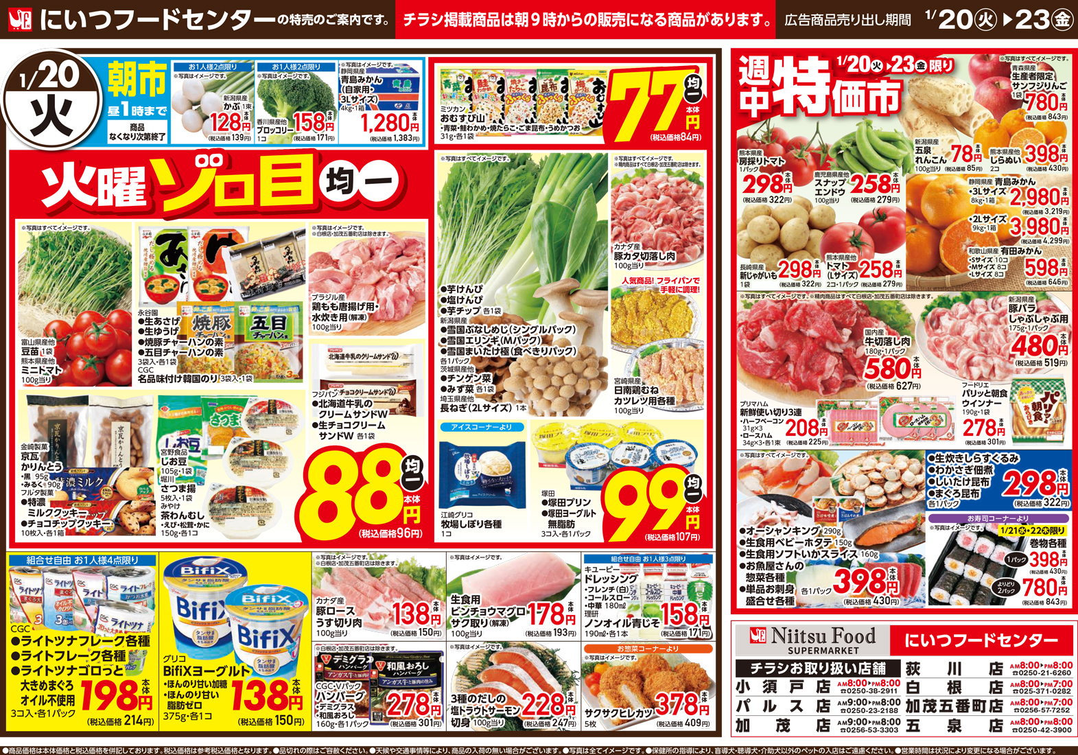 にいつフードセンター 【にいつフードセンターチラシ】火曜ゾロ目均一 掲載期間:2026年1月20日〜2026年1月23日 中越新潟市下越 スーパーにいつフードセンター 画像をクリックして拡大 prev next セール・新店情報を見逃さない! ガタチラをホーム画面に追加して、 最新情報をすぐチェック▶追加方法はかんたん♪ 関連 お買い得品を見逃さないようにしなきゃ!