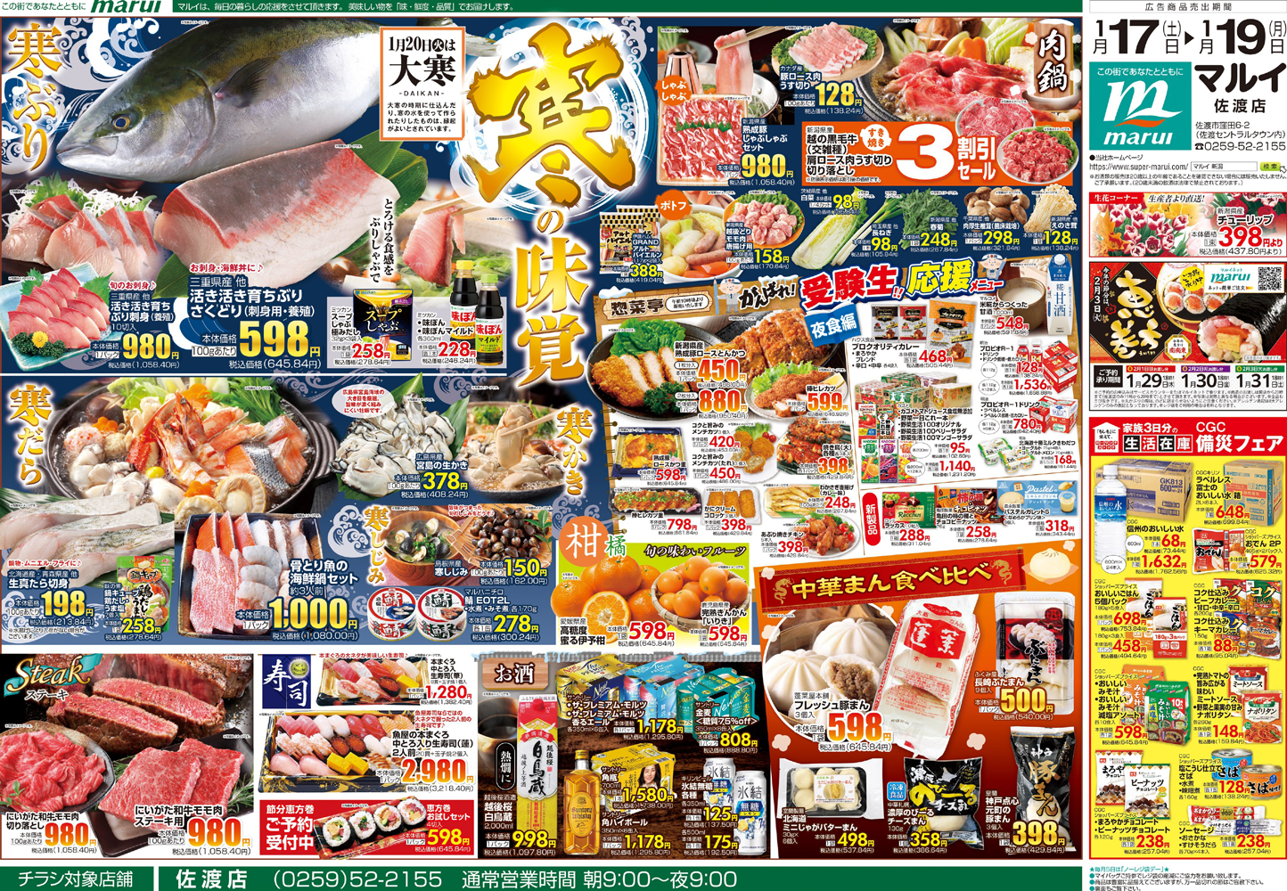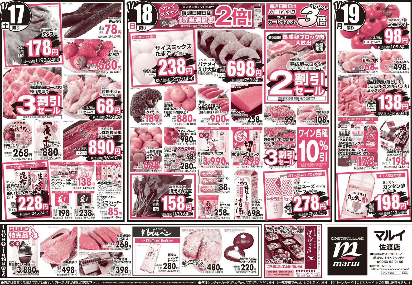株式会社マルイ 【マルイ佐渡店チラシ】寒の味覚 掲載期間:2026年1月16日〜2026年1月19日 佐渡 スーパーマルイ 画像をクリックして拡大 prev next セール・新店情報を見逃さない! ガタチラをホーム画面に追加して、 最新情報をすぐチェック▶追加方法はかんたん♪ 関連 ブリのお刺身がおいしそうね! 越の黒毛牛も3割引でお買い得♡