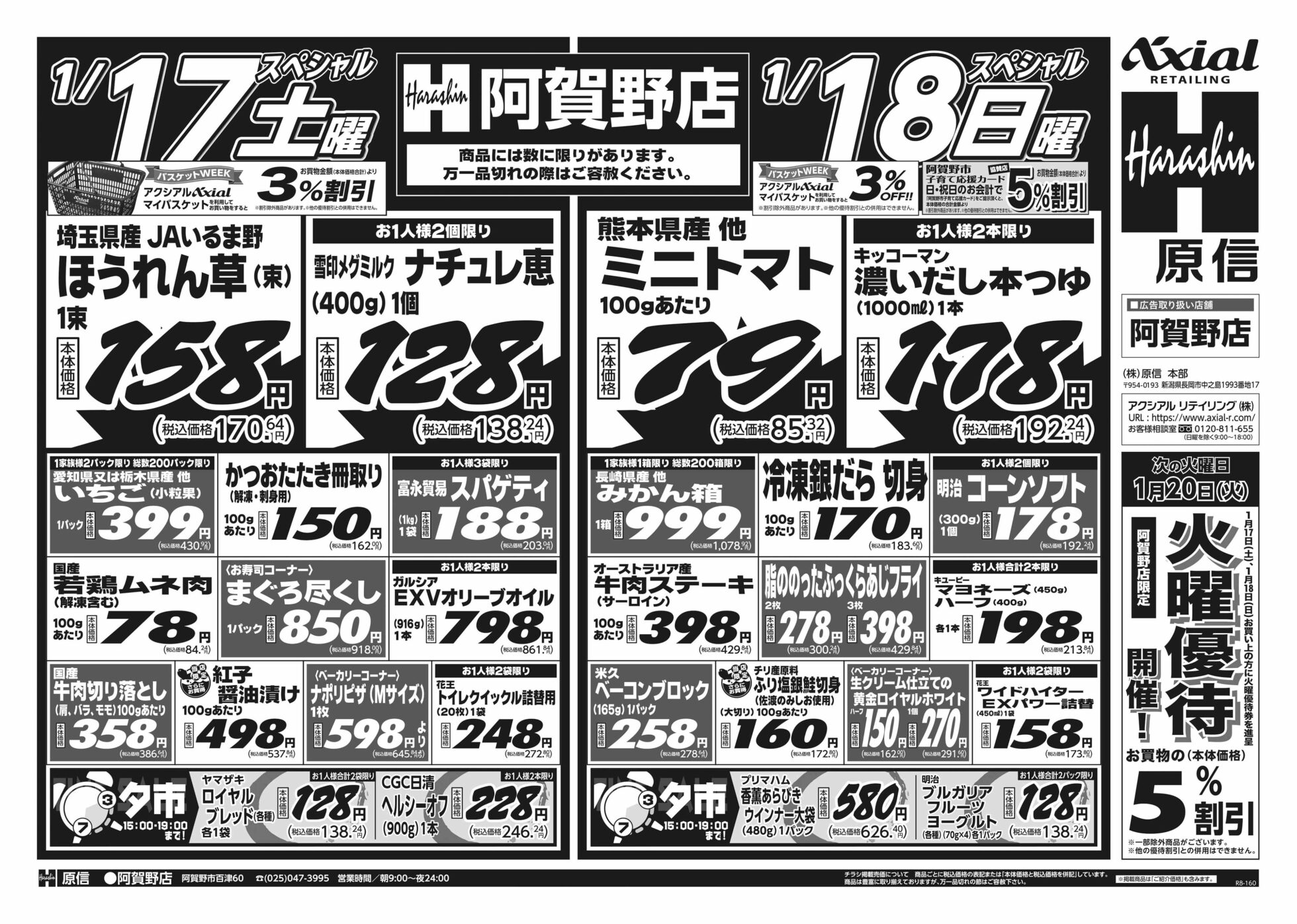 原信ナルス 【原信ナルス阿賀野店チラシ】土曜スペシャル/日曜スペシャル/月曜スペシャル 掲載期間:2026年1月17日〜2026年1月19日 下越 スーパー原信ナルス 画像をクリックして拡大 prev next 対象:阿賀野店 セール・新店情報を見逃さない! ガタチラをホーム画面に追加して、 最新情報をすぐチェック▶追加方法はかんたん♪ 関連 お買い得商品を見逃さないようにしないと!