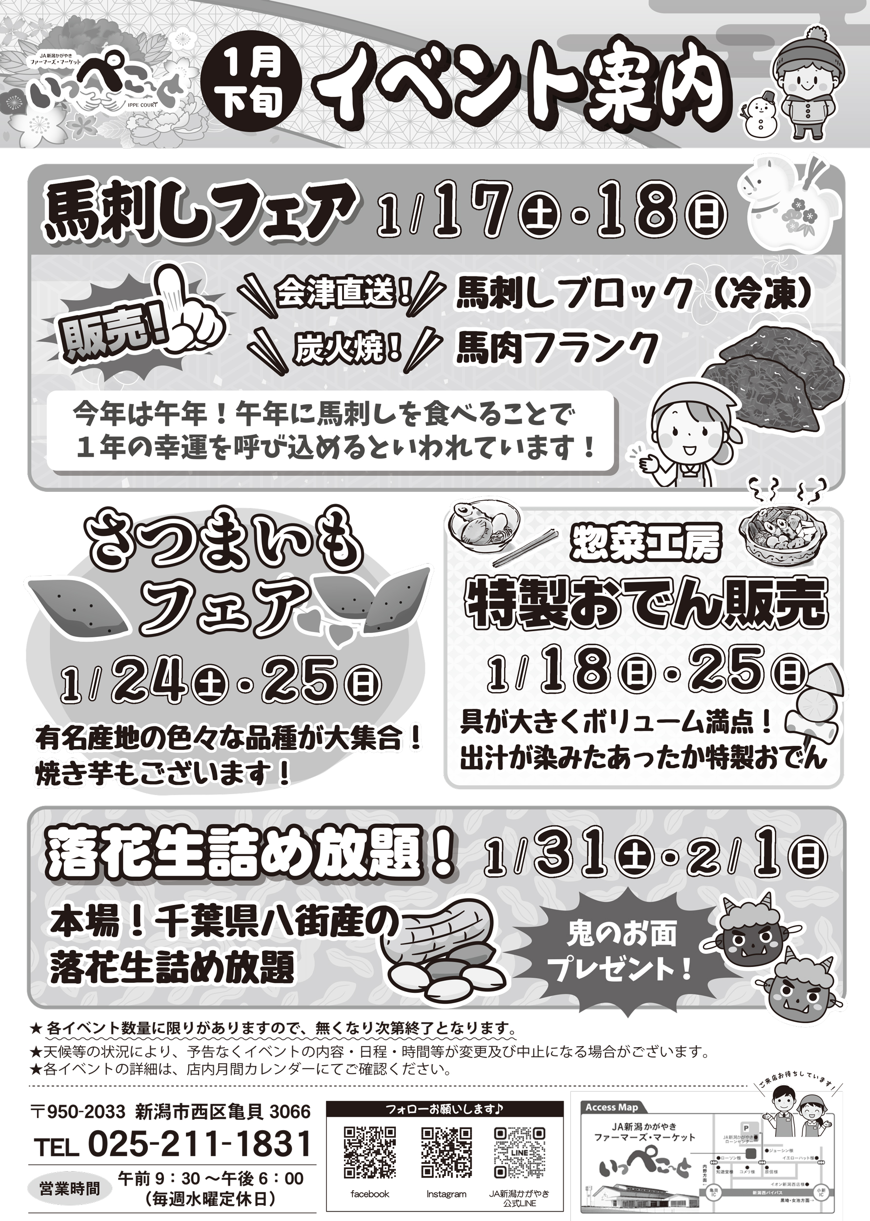 JA新潟かがやき 【いっぺこ~とチラシ】1月イベント案内 掲載期間:2026年1月17日〜2026年2月1日 新潟市 生活サービス 画像をクリックして拡大 prev next セール・新店情報を見逃さない! ガタチラをホーム画面に追加して、 最新情報をすぐチェック▶追加方法はかんたん♪ 関連 会津直送の馬刺しですって! ぜひいただきたいわ!!