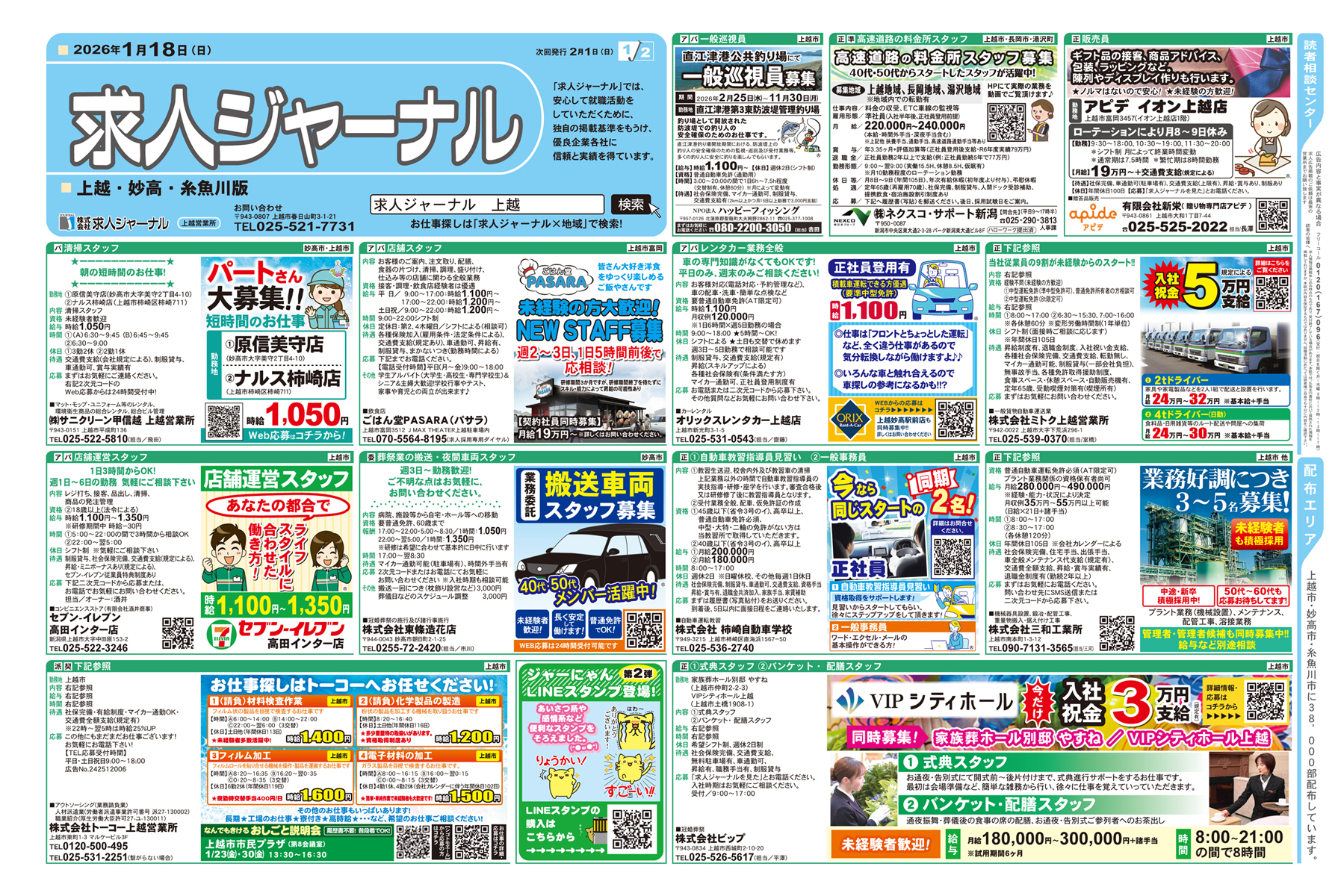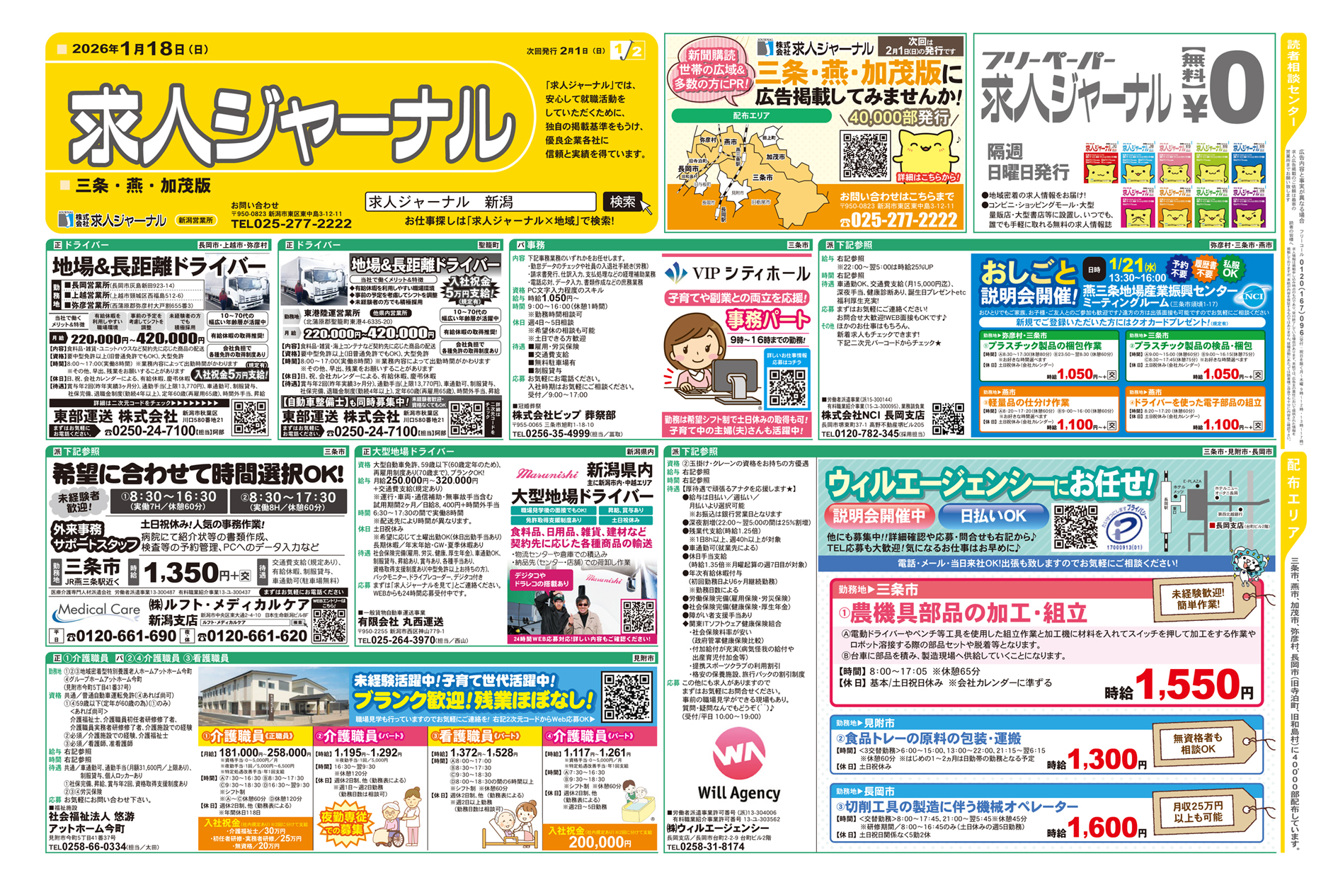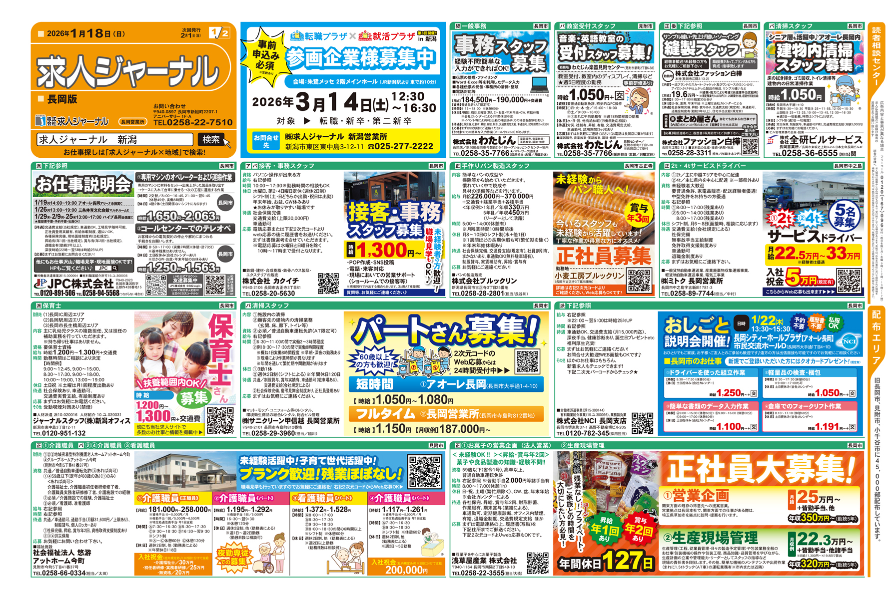求人ジャーナル 【求人ジャーナルチラシ】1月18日号 掲載期間:2026年1月18日〜2026年1月24日 上越中越新潟市下越 求人 目次 新潟版 長岡・柏崎版 上越・妙高版 三条・燕・加茂版 新潟版 画像をクリックして拡大 prev next 長岡・柏崎版 画像をクリックして拡大 prev next 上越・妙高版 画像をクリックして拡大 prev next 三条・燕・加茂版 画像をクリックして拡大 prev next セール・新店情報を見逃さない! ガタチラをホーム画面に追加して、 最新情報をすぐチェック▶追加方法はかんたん♪ 関連 ライフスタイルに合わせて色々選べるわね!