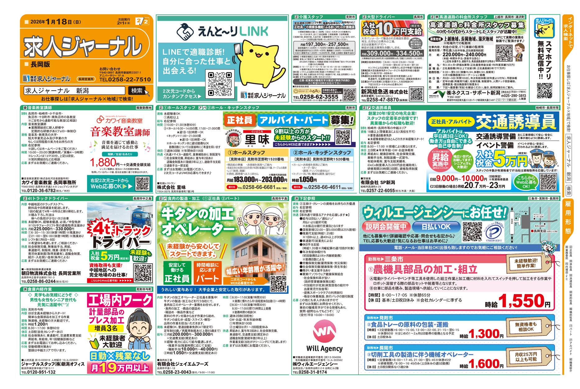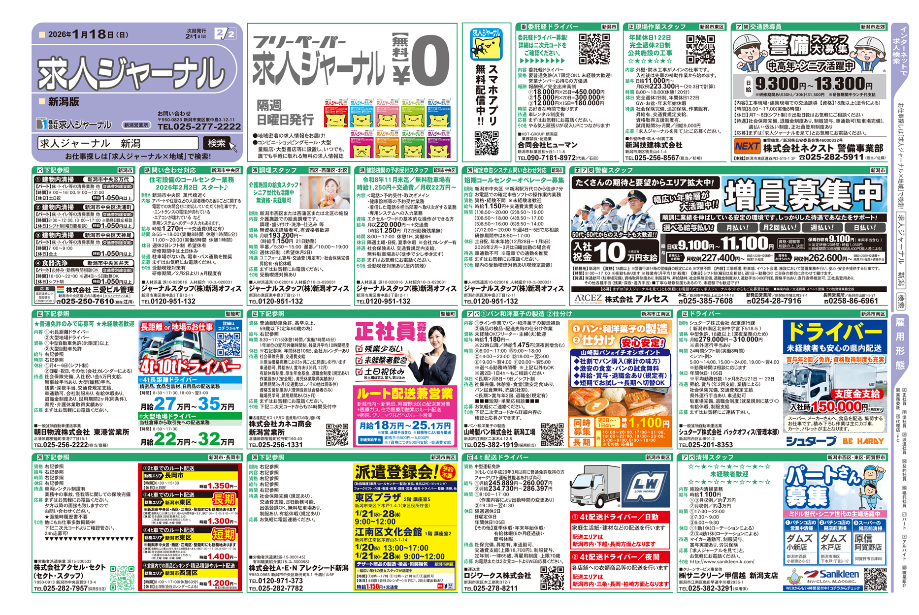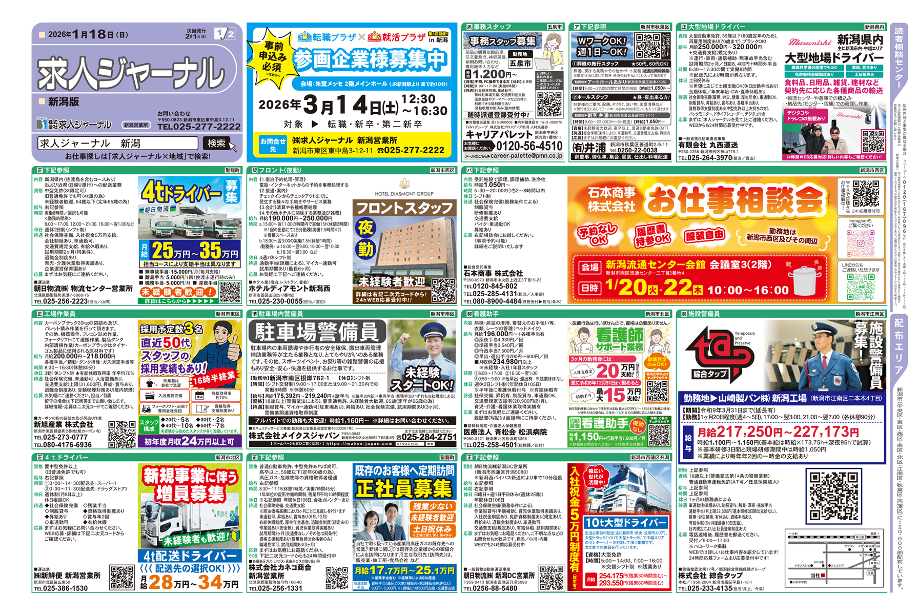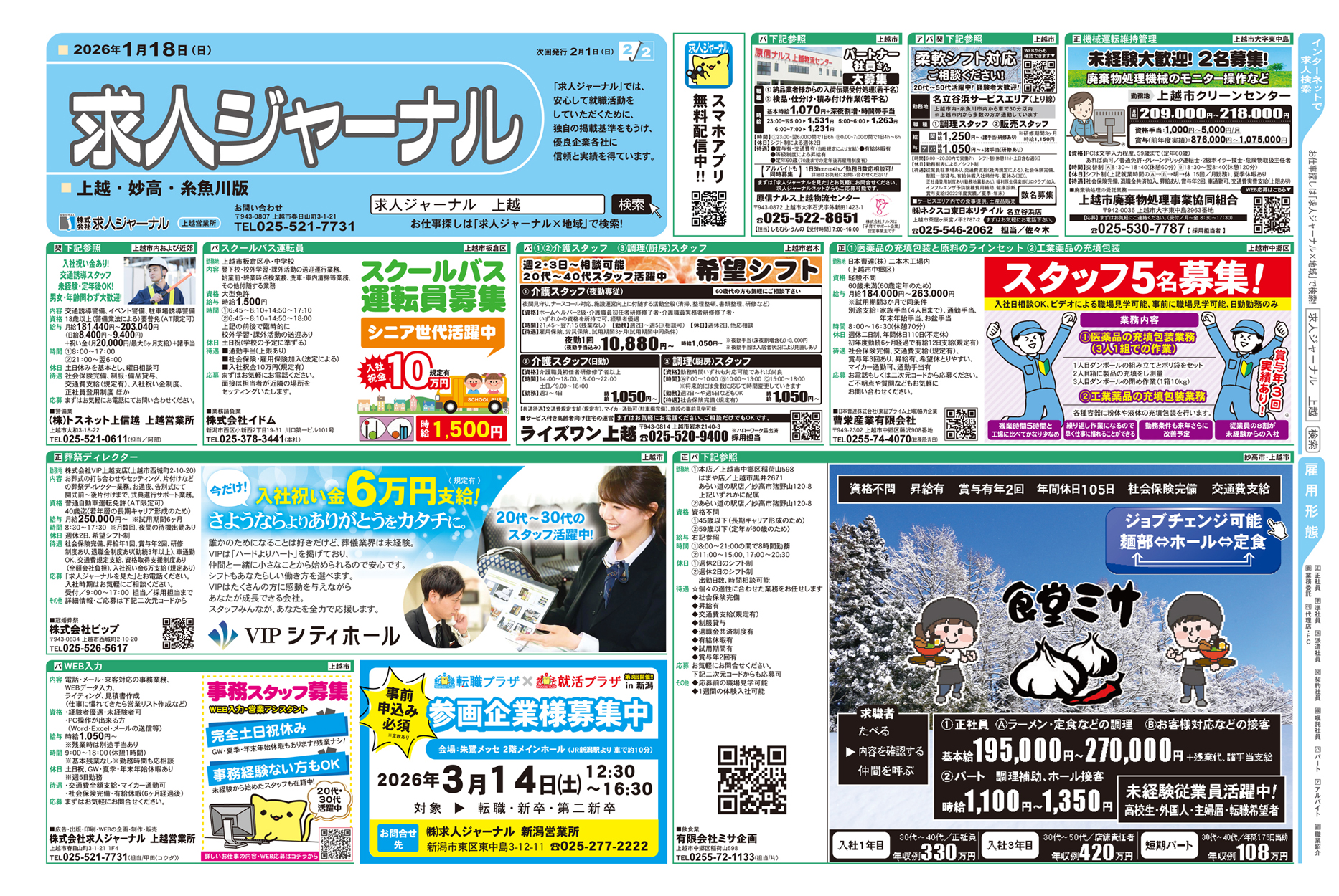 求人ジャーナル 【求人ジャーナルチラシ】1月18日号 掲載期間:2026年1月18日〜2026年1月24日 上越中越新潟市下越 求人 目次 新潟版 長岡・柏崎版 上越・妙高版 三条・燕・加茂版 新潟版 画像をクリックして拡大 prev next 長岡・柏崎版 画像をクリックして拡大 prev next 上越・妙高版 画像をクリックして拡大 prev next 三条・燕・加茂版 画像をクリックして拡大 prev next セール・新店情報を見逃さない! ガタチラをホーム画面に追加して、 最新情報をすぐチェック▶追加方法はかんたん♪ 関連 ライフスタイルに合わせて色々選べるわね!