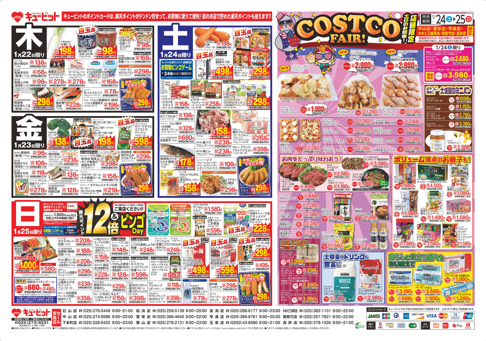 キューピット 【キューピットチラシ】旬の生鮮大市 掲載期間:2026年1月22日〜2026年1月25日 新潟市下越 スーパーキューピット 画像をクリックして拡大 prev next セール・新店情報を見逃さない! ガタチラをホーム画面に追加して、 最新情報をすぐチェック▶追加方法はかんたん♪ 関連 お買い得品を見逃さないようにしないと! 輸入食品フェアも楽しそう!!