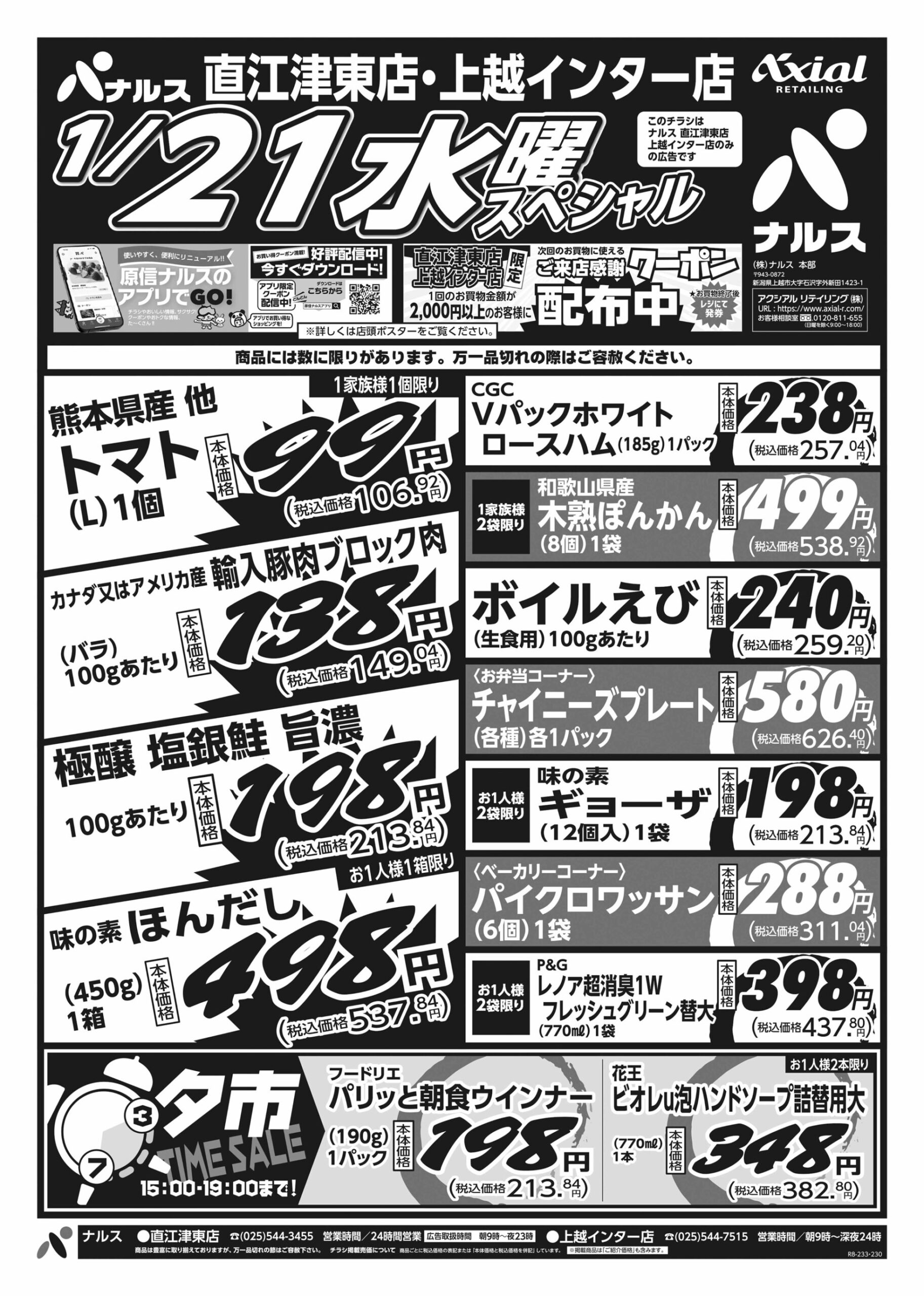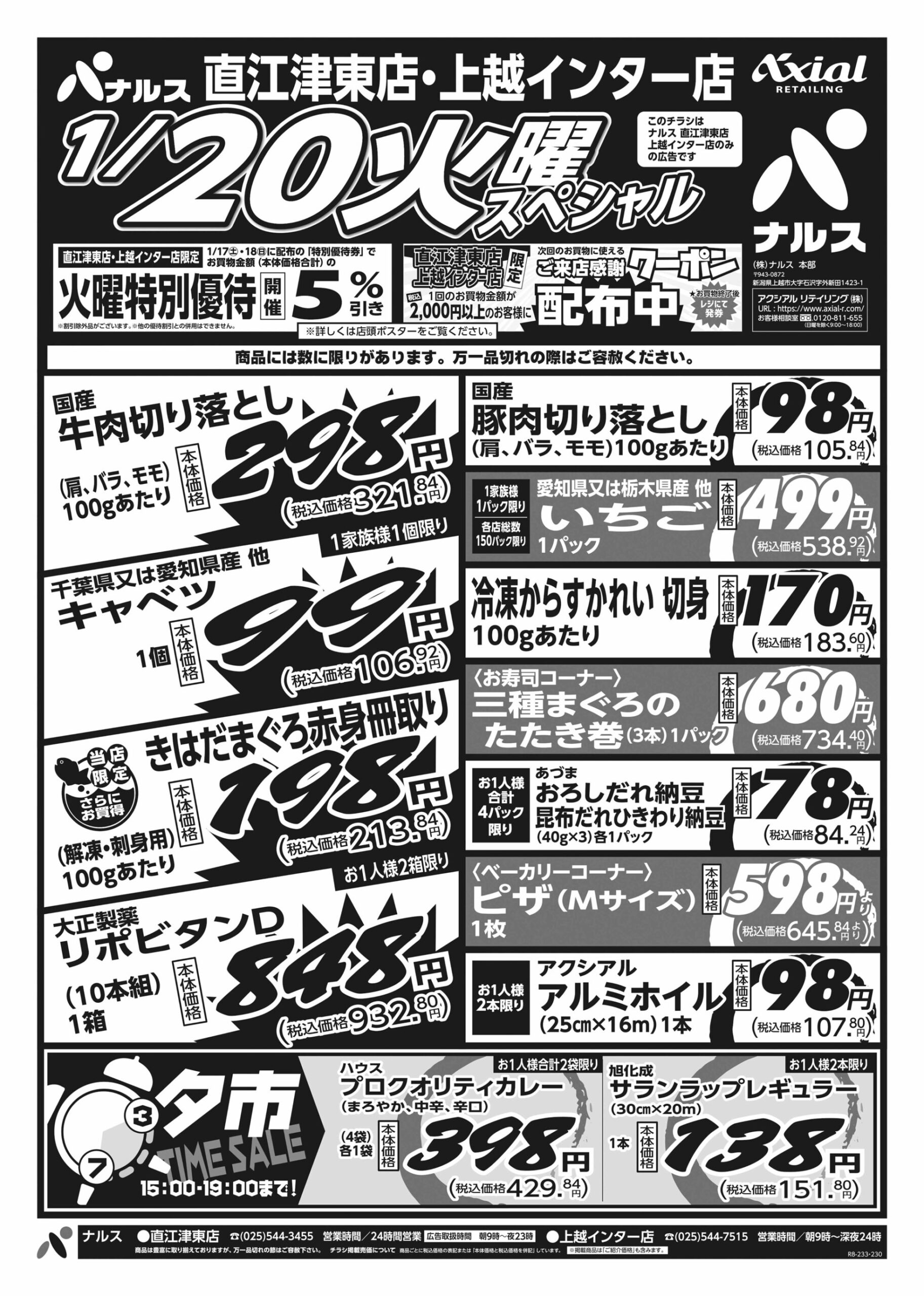 原信ナルス 【原信ナルス直江津東店・上越インター店チラシ】火曜スペシャル/水曜スペシャル 掲載期間:2026年1月20日〜2026年1月21日 上越 スーパー原信ナルス 画像をクリックして拡大 prev next 対象:直江津東店・上越インター店 セール・新店情報を見逃さない! ガタチラをホーム画面に追加して、 最新情報をすぐチェック▶追加方法はかんたん♪ 関連 20日はリポビタンDがお買い得! 雪除け用に買っておきましょう!!
