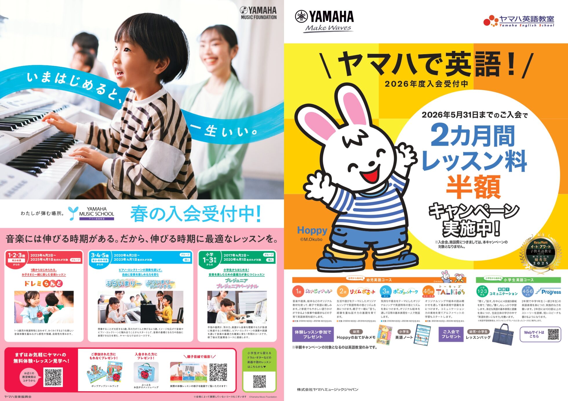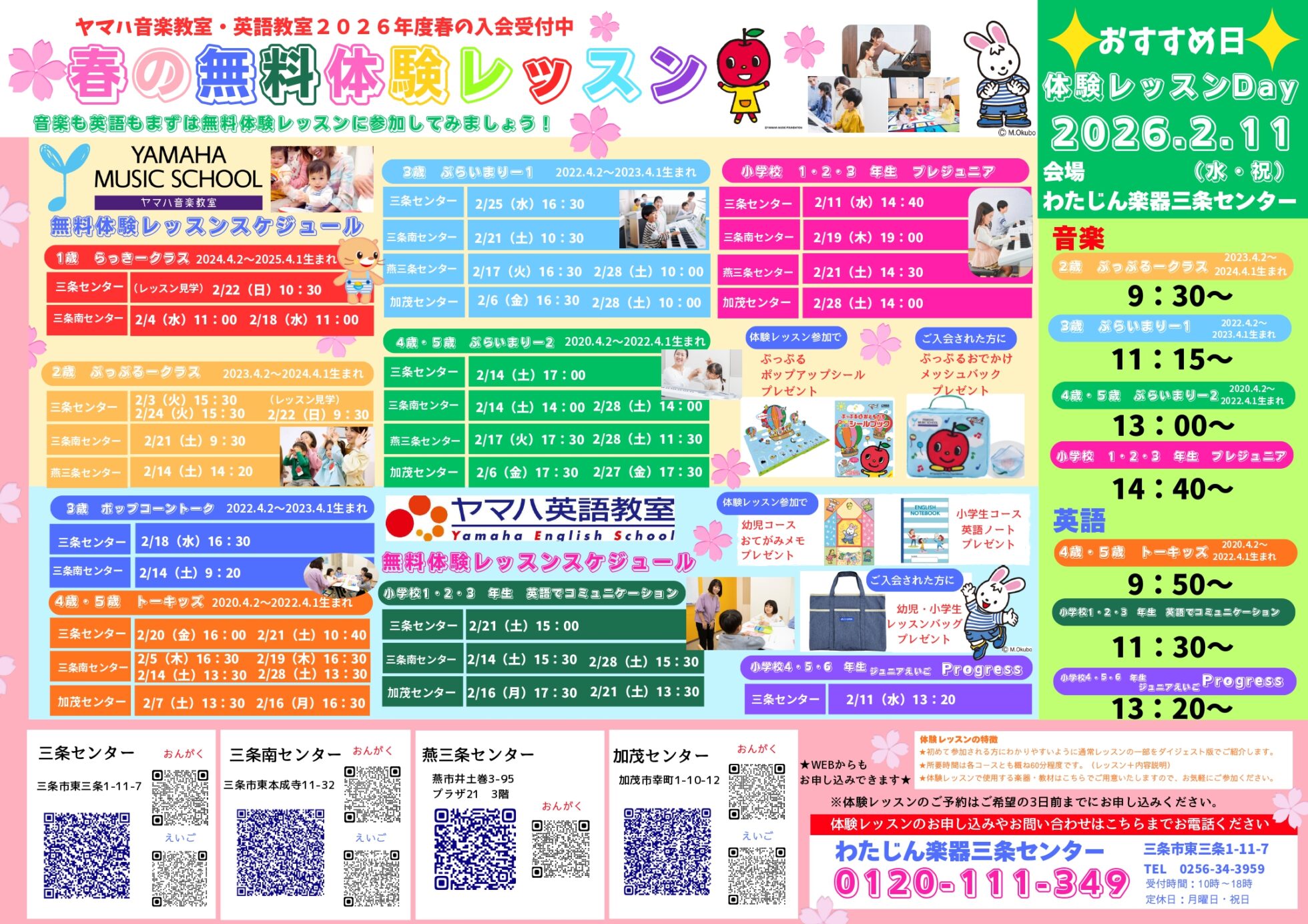 わたじん楽器三条センター 【わたじん楽器三条センターチラシ】ヤマハで英語!/春の無料体験レッスン 掲載期間:2026年1月24日〜2026年2月28日 中越下越 生活サービス 画像をクリックして拡大 prev next セール・新店情報を見逃さない! ガタチラをホーム画面に追加して、 最新情報をすぐチェック▶追加方法はかんたん♪ 関連 レッスン料2ヶ月間半額! 嬉しいわね~♪