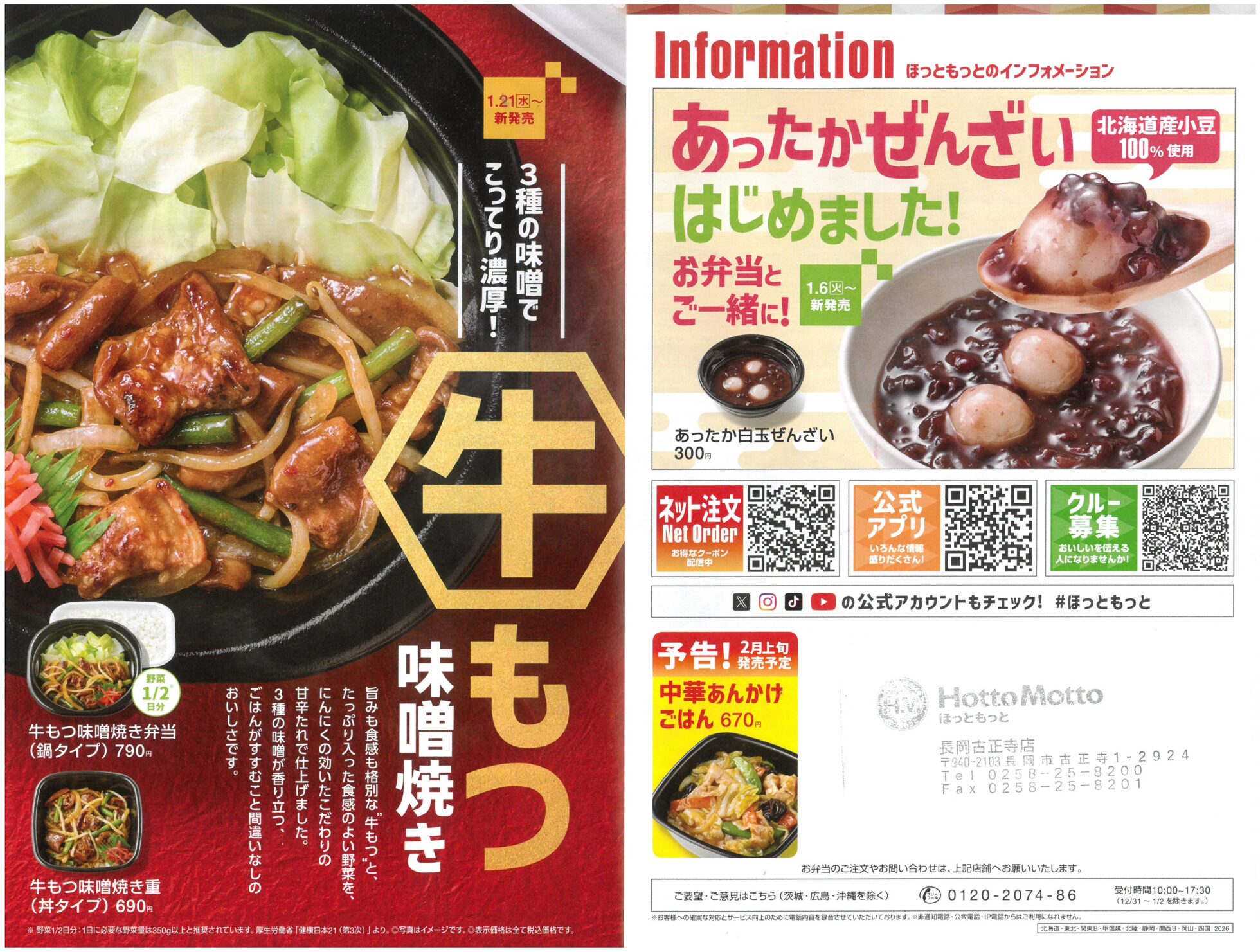 ほっともっと長岡古正寺店 【ほっともっと長岡古正寺店チラシ】カニコロ、食べごろ!/牛もつ味噌焼き 掲載期間:2026年1月23日〜2026年2月10日 中越 グルメ 画像をクリックして拡大 prev next セール・新店情報を見逃さない! ガタチラをホーム画面に追加して、 最新情報をすぐチェック▶追加方法はかんたん♪ 関連 カニコロおいしそ~♪