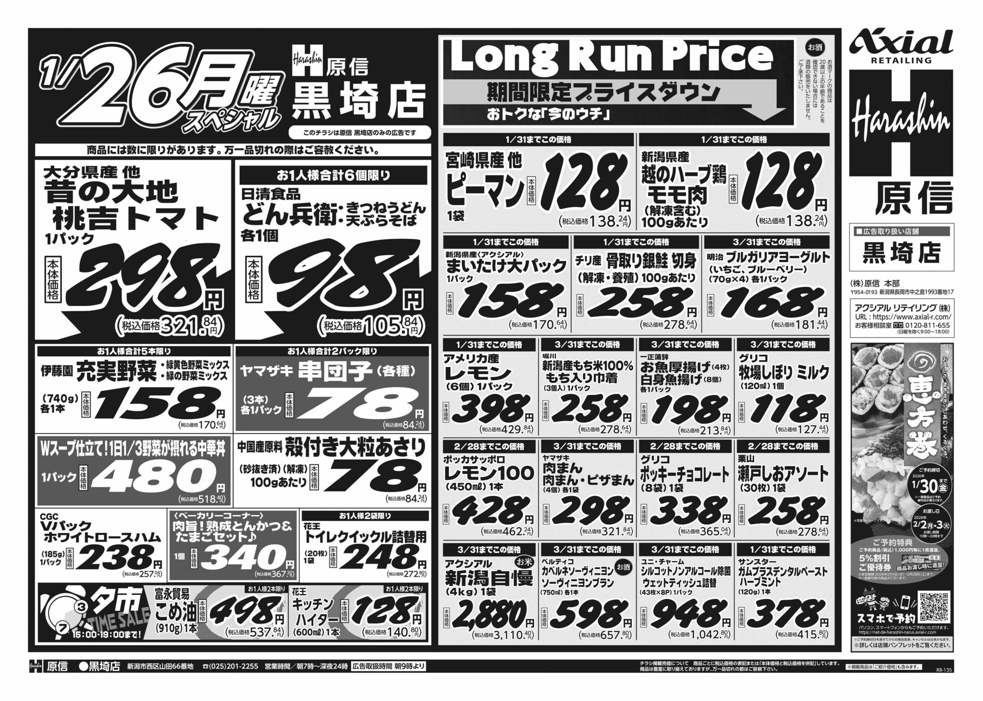 原信ナルス 【原信ナルス黒埼店チラシ】土曜スペシャル / 日曜スペシャル / 月曜スペシャル 掲載期間:2026年1月24日〜2026年1月26日 新潟市 スーパー原信ナルス 画像をクリックして拡大 prev next 対象:黒埼店 セール・新店情報を見逃さない! ガタチラをホーム画面に追加して、 最新情報をすぐチェック▶追加方法はかんたん♪ 関連 みかん買いに行こうかしら~♪