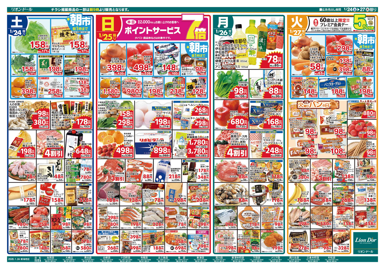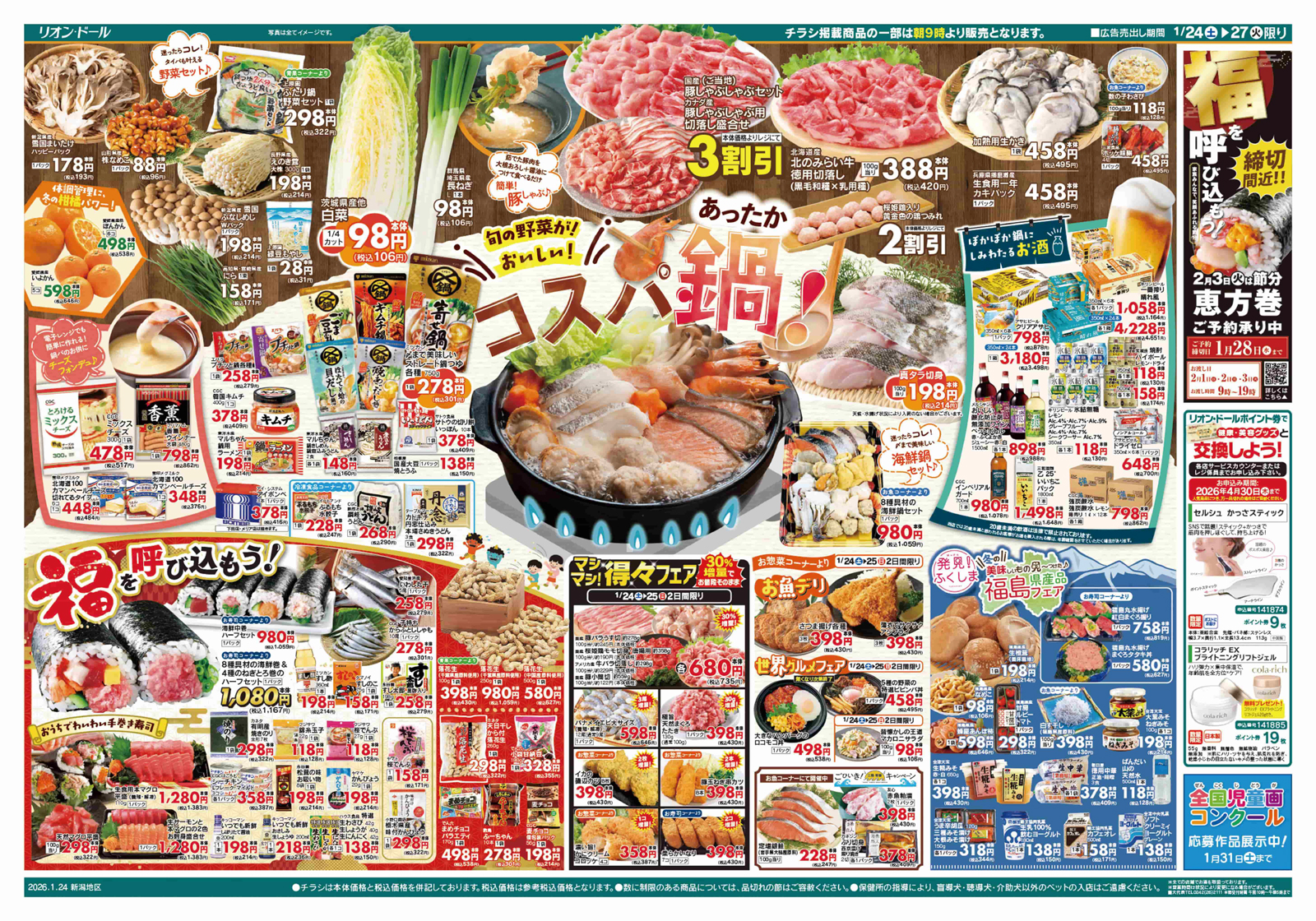 株式会社リオン・ドールコーポレーション 【リオン・ドールチラシ】旬の野菜が!おいしい! コスパ鍋 掲載期間:2026年1月24日〜2026年1月27日 中越新潟市下越 スーパーリオン・ドール 画像をクリックして拡大 prev next 「リオン・ドール」のホームページはこちらから セール・新店情報を見逃さない! ガタチラをホーム画面に追加して、 最新情報をすぐチェック▶追加方法はかんたん♪ 関連 冬はやっぱりお鍋よね~♪