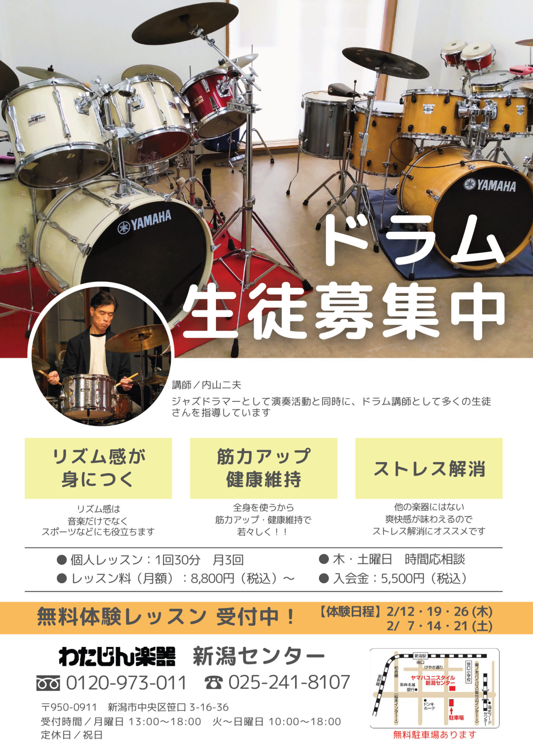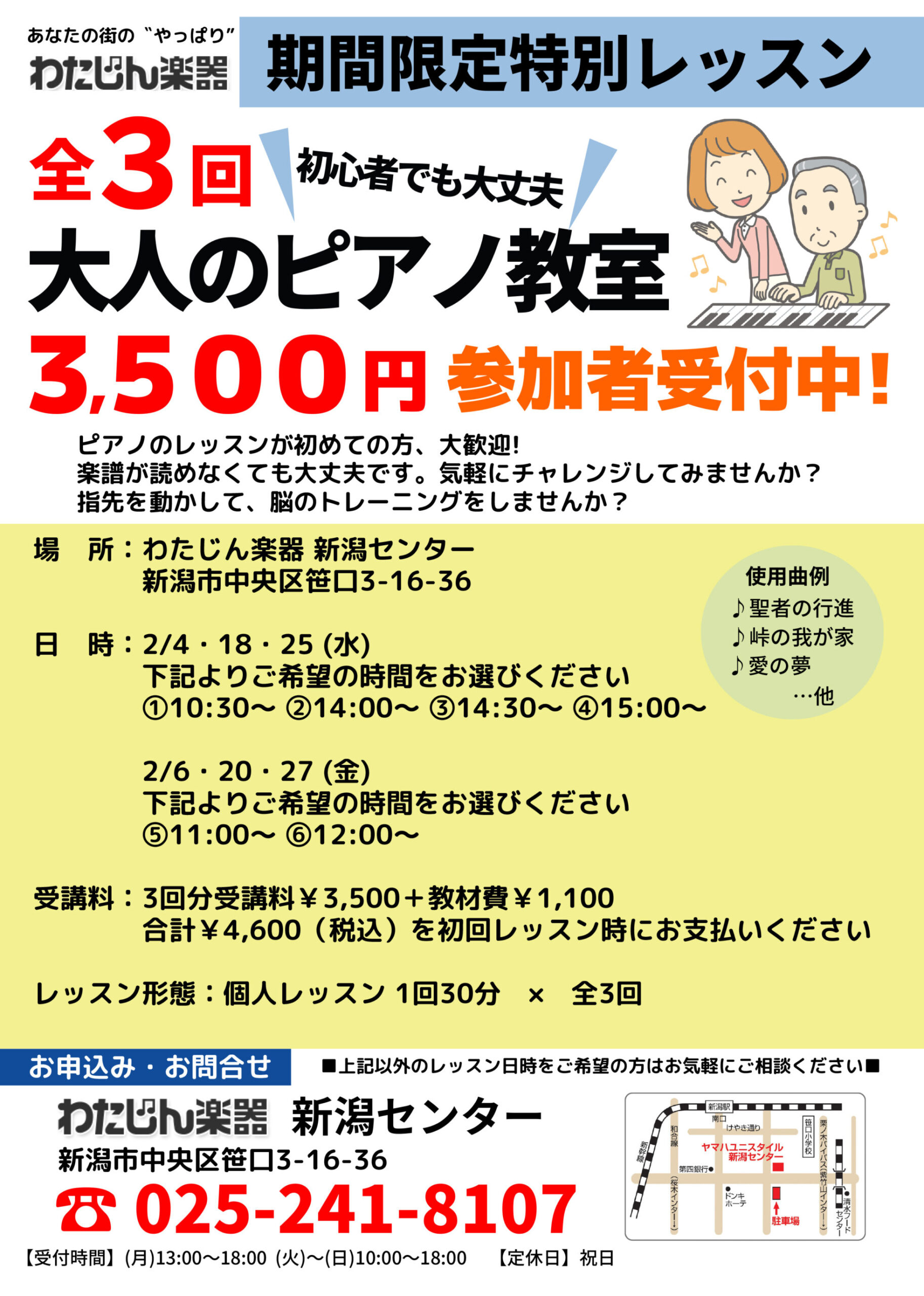 わたじん楽器新潟センター 【わたじん楽器新潟センターチラシ】大人のピアノ教室&ドラム生徒募集中 掲載期間:2026年1月29日〜2026年2月27日 新潟市 生活サービス 画像をクリックして拡大 prev next セール・新店情報を見逃さない! ガタチラをホーム画面に追加して、 最新情報をすぐチェック▶追加方法はかんたん♪ 関連 私でもピアノ弾けるようになるかしら~♪