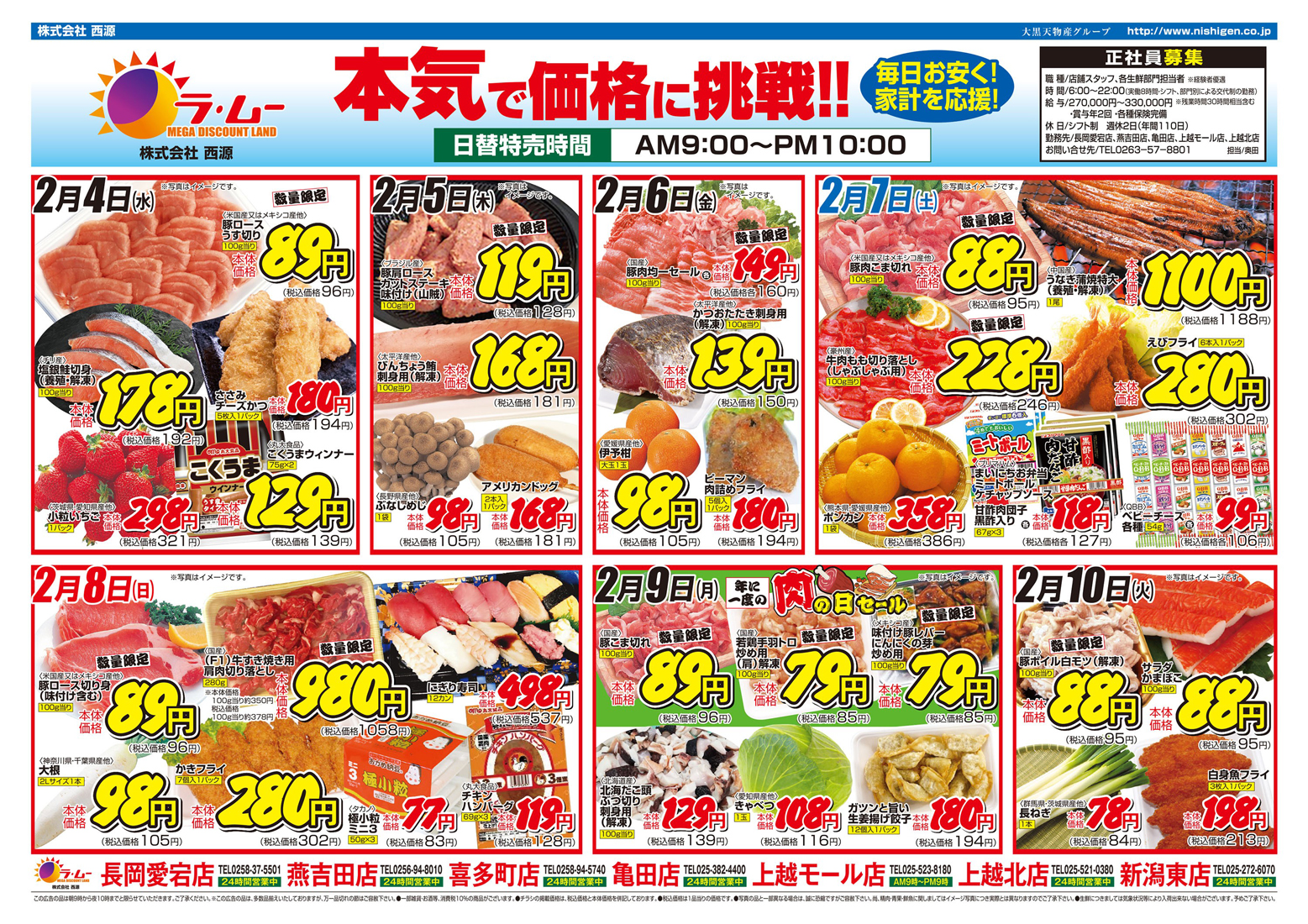 西源 【ラ・ムーチラシ】本気で価格に挑戦!! 掲載期間:2026年2月4日〜2026年2月10日 上越中越新潟市下越 スーパーラ・ムー 画像をクリックして拡大 prev next セール・新店情報を見逃さない! ガタチラをホーム画面に追加して、 最新情報をすぐチェック▶追加方法はかんたん♪ 関連 お買い得品がたくさん! 2月9日は肉の日セールですって!