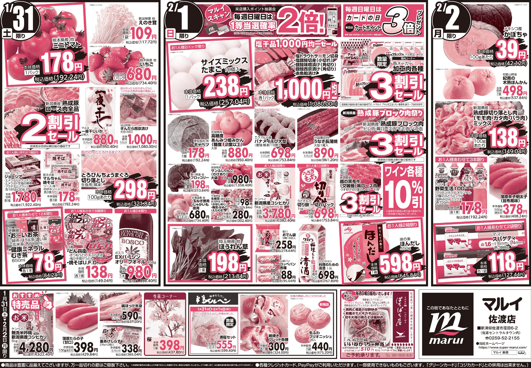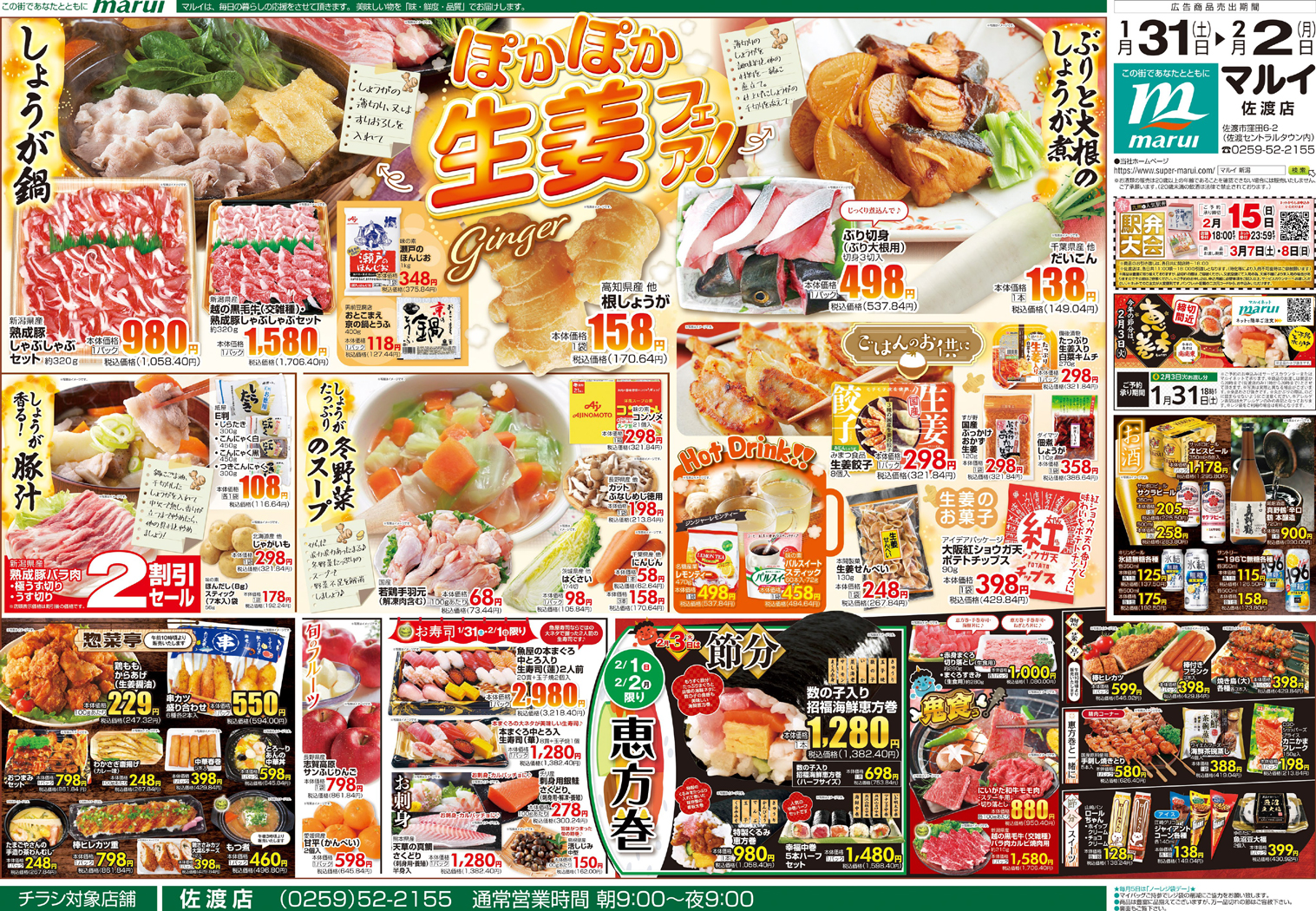 株式会社マルイ 【マルイ佐渡店チラシ】ぽかぽか生姜フェア! 掲載期間:2026年1月30日〜2026年2月2日 佐渡 スーパーマルイ 画像をクリックして拡大 prev next セール・新店情報を見逃さない! ガタチラをホーム画面に追加して、 最新情報をすぐチェック▶追加方法はかんたん♪ 関連 生姜料理で寒さを吹き飛ばしましょう!