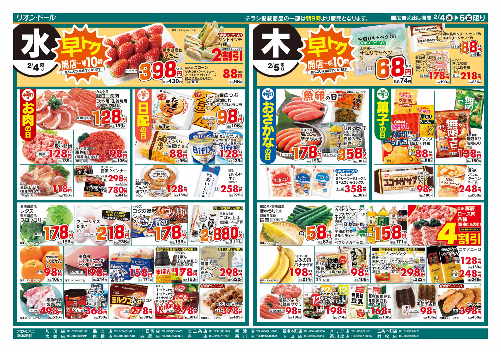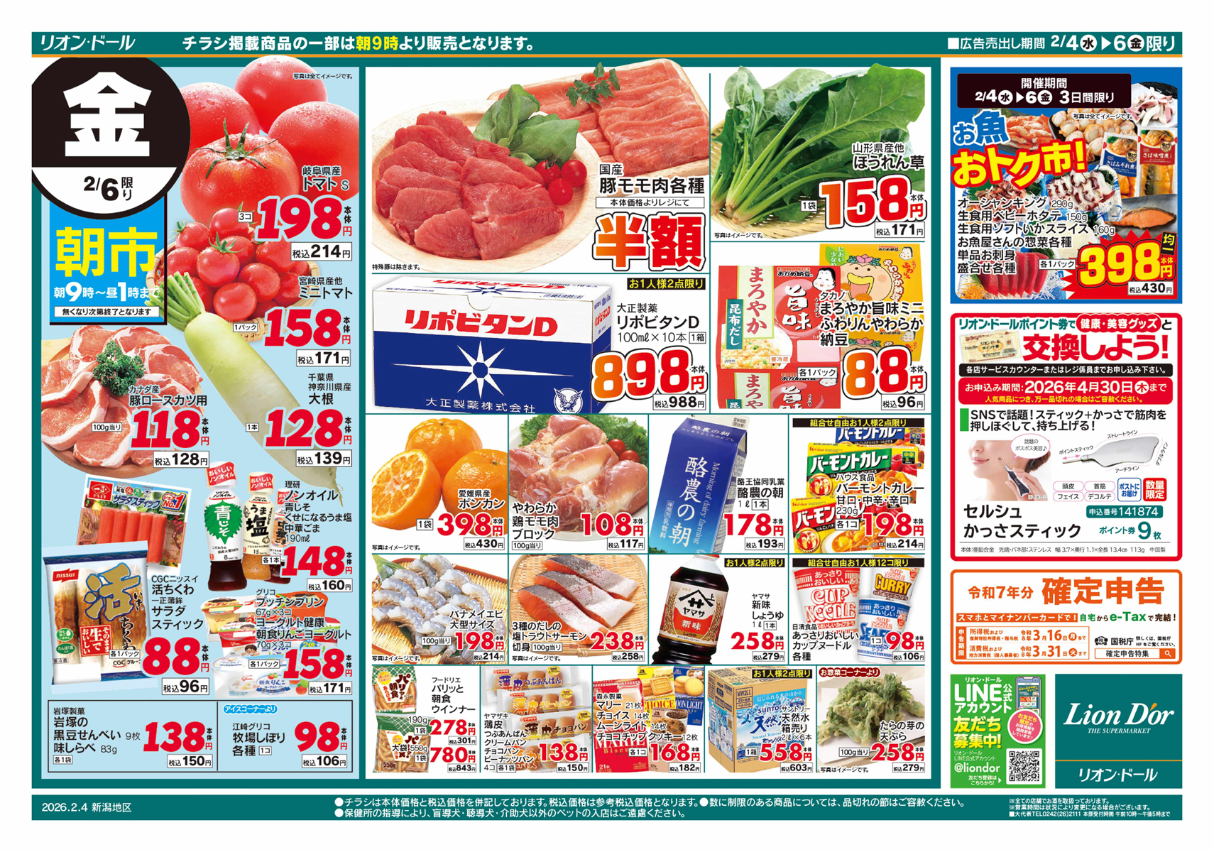(株)リオン・ドールコーポレーション 【リオン・ドールチラシ】お魚おトク市! 掲載期間:2026年2月4日〜2026年2月6日 中越新潟市下越 スーパーリオン・ドール 画像をクリックして拡大 prev next 「リオン・ドール」のホームページはこちらから セール・新店情報を見逃さない! ガタチラをホーム画面に追加して、 最新情報をすぐチェック▶追加方法はかんたん♪ 関連 お刺身もお魚屋さんの総菜も1パック398円ですって!