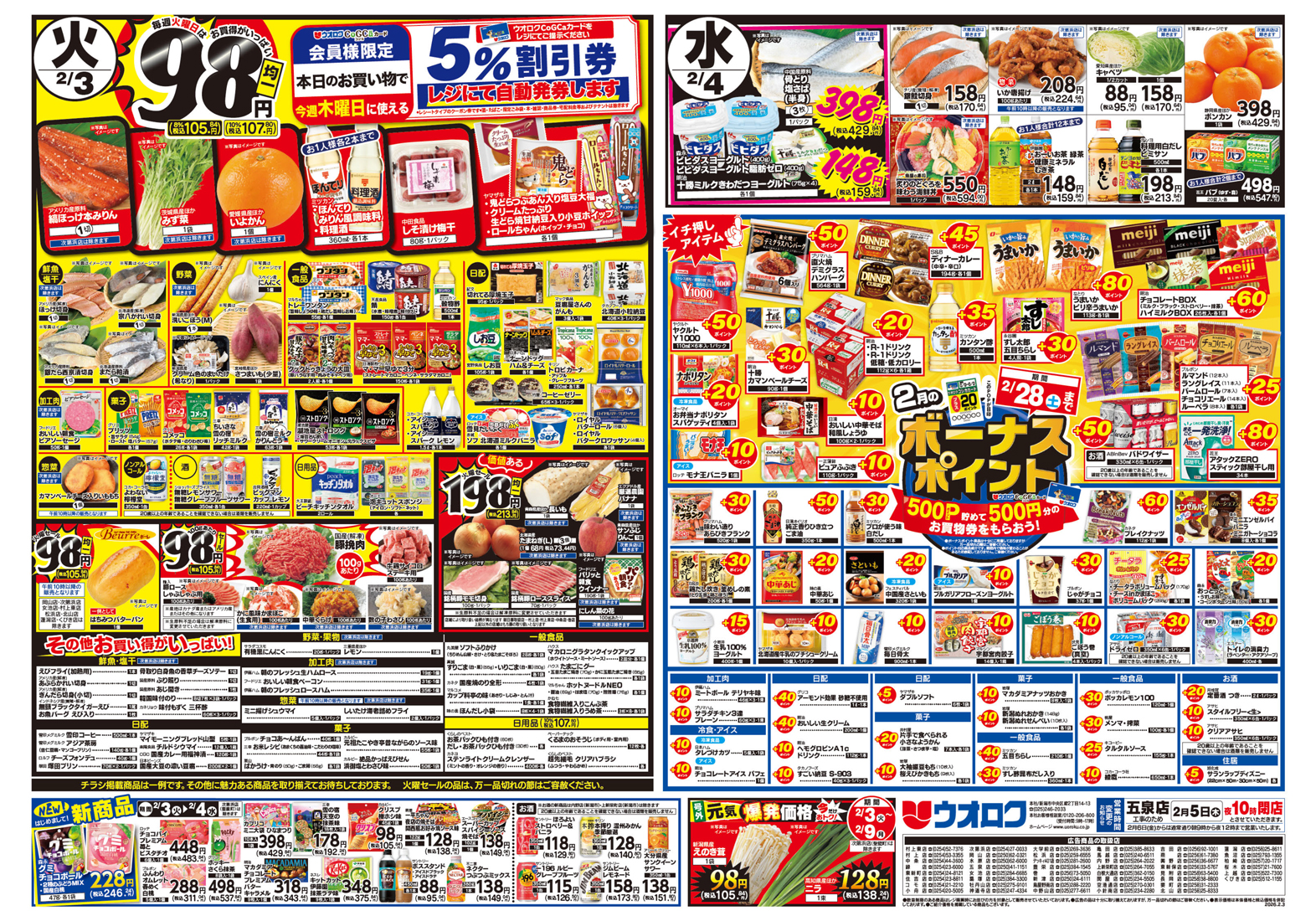 ウオロク 【ウオロクチラシ】今年はハーフサイズで節分 掲載期間:2026年2月3日〜2026年2月4日 上越中越新潟市下越 スーパーウオロク 画像をクリックして拡大 prev next セール・新店情報を見逃さない! ガタチラをホーム画面に追加して、 最新情報をすぐチェック▶追加方法はかんたん♪ 関連 恵方巻は色々食べたいから、ハーフサイズでちょうどいいわね!