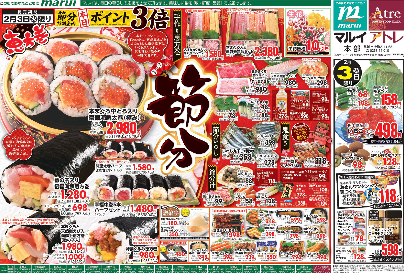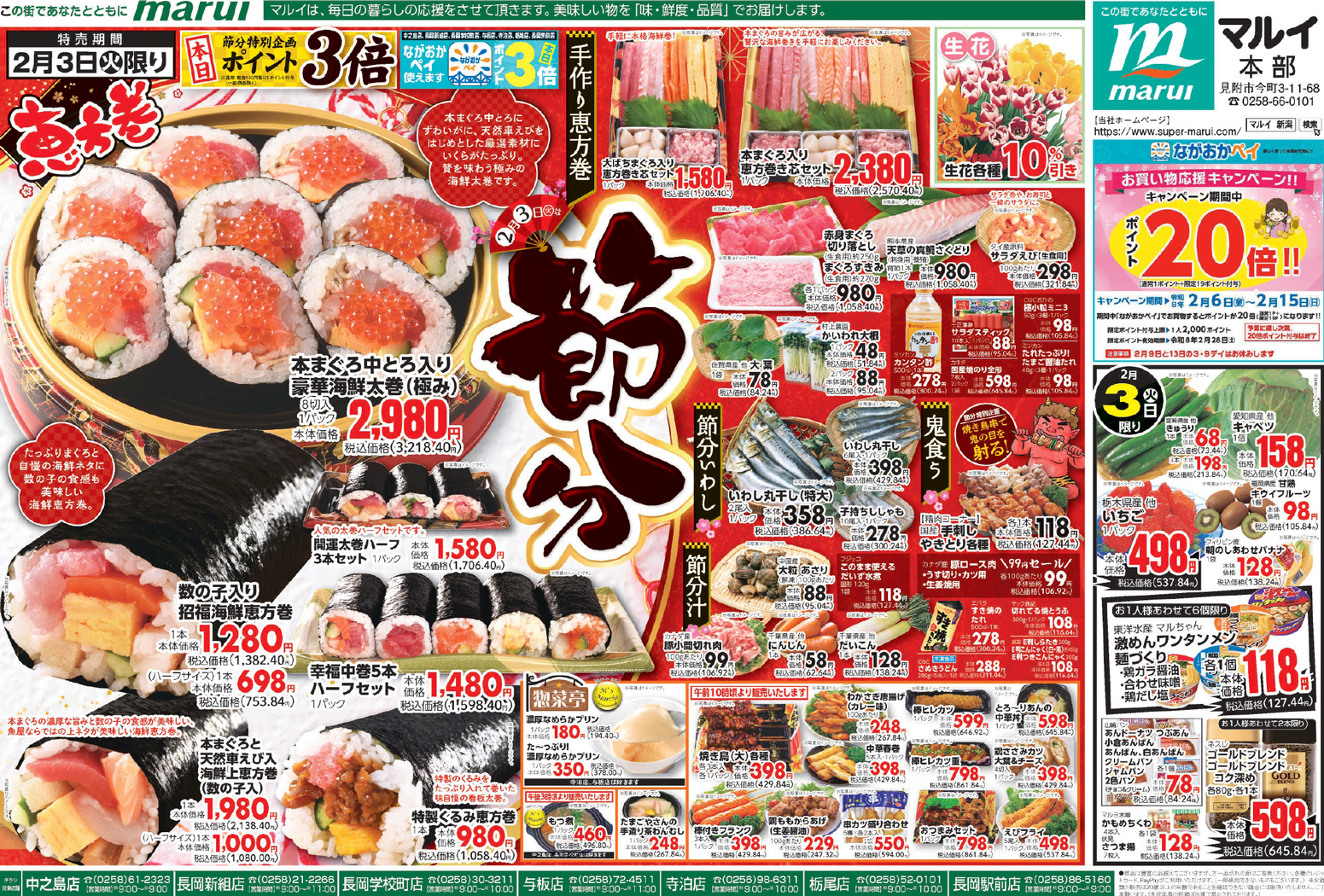 株式会社マルイ 【マルイチラシ】2月3日は節分 掲載期間:2026年2月3日〜2026年2月6日 中越新潟市下越 スーパーマルイ 目次 各店 女池店・寺尾台店・小針店 中之島店・長岡新組店・長岡学校町店・与板店・寺泊店・栃尾店・長岡駅前店 各店 画像をクリックして拡大 prev next 女池店・寺尾台店・小針店 画像をクリックして拡大 prev next 中之島店・長岡新組店・長岡学校町店・与板店・寺泊店・栃尾店・長岡駅前店 画像をクリックして拡大 prev next セール・新店情報を見逃さない! ガタチラをホーム画面に追加して、 最新情報をすぐチェック▶追加方法はかんたん♪ 関連 いくらたっぷりの恵方巻、おいしそう!