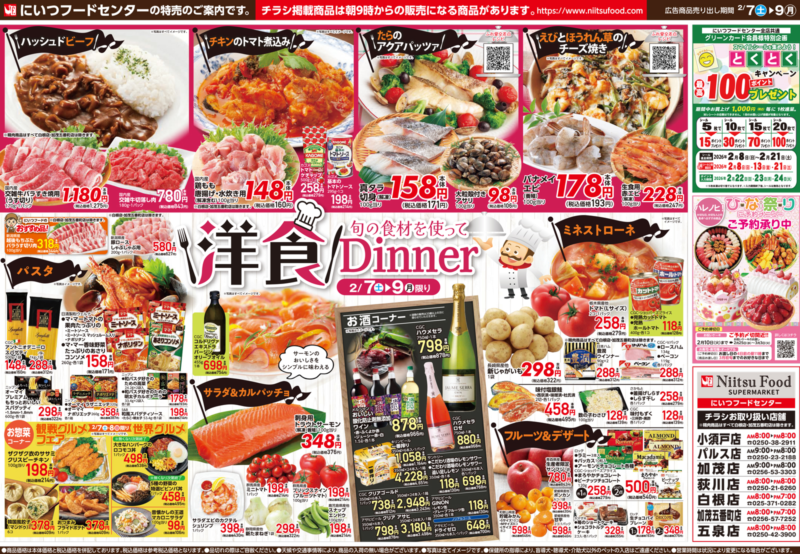 にいつフードセンター 【にいつフードセンターチラシ】洋食Dinner 掲載期間:2026年2月7日〜2026年2月9日 中越新潟市下越 スーパーにいつフードセンター 画像をクリックして拡大 prev next セール・新店情報を見逃さない! ガタチラをホーム画面に追加して、 最新情報をすぐチェック▶追加方法はかんたん♪ 関連 ハッシュドビーフ食べたいな~♪