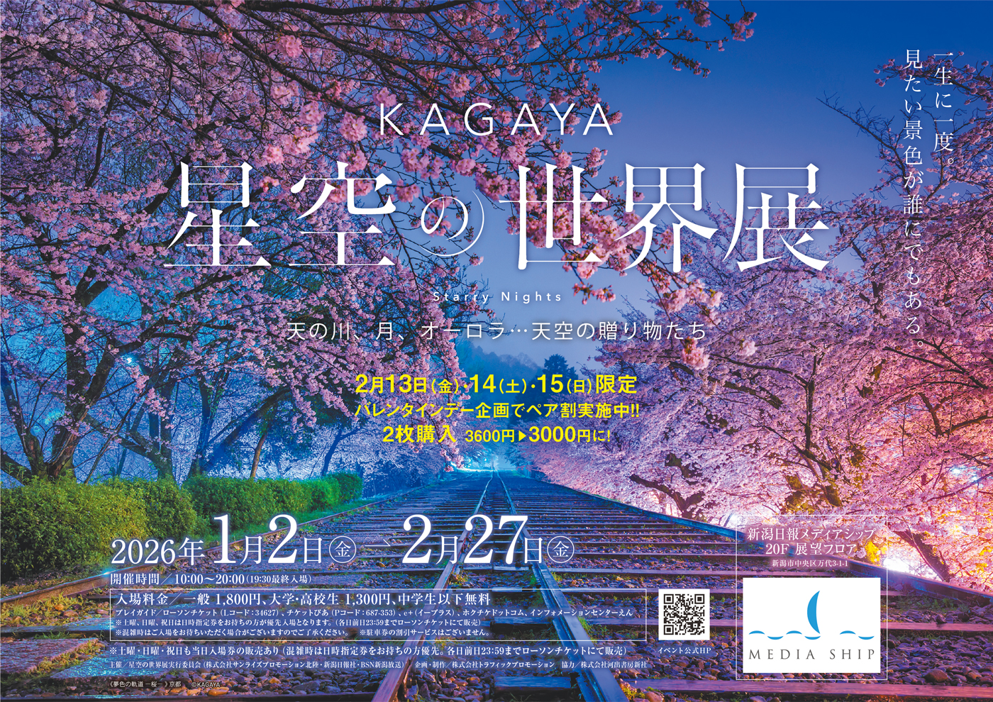 KAGAYA 【KAGAYAチラシ】KAGAYA 星空の世界展 掲載期間:2026年2月13日〜2026年2月27日 新潟市 イベント 画像をクリックして拡大 prev next セール・新店情報を見逃さない! ガタチラをホーム画面に追加して、 最新情報をすぐチェック▶追加方法はかんたん♪ 関連 バレンタインデーのペア割で お得に見に行けるのね♪