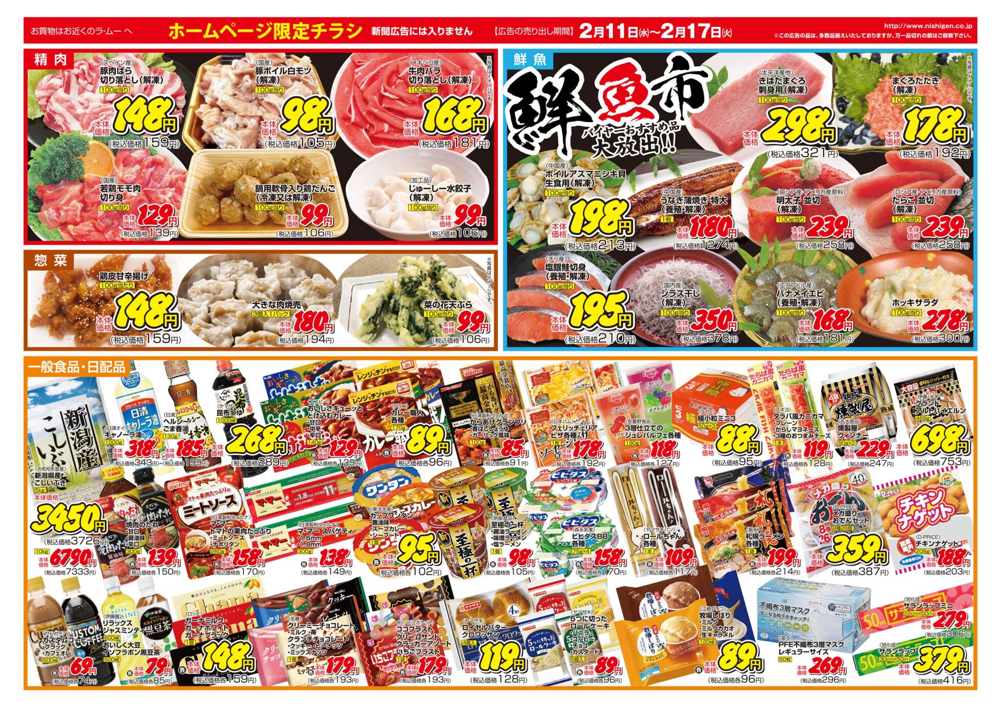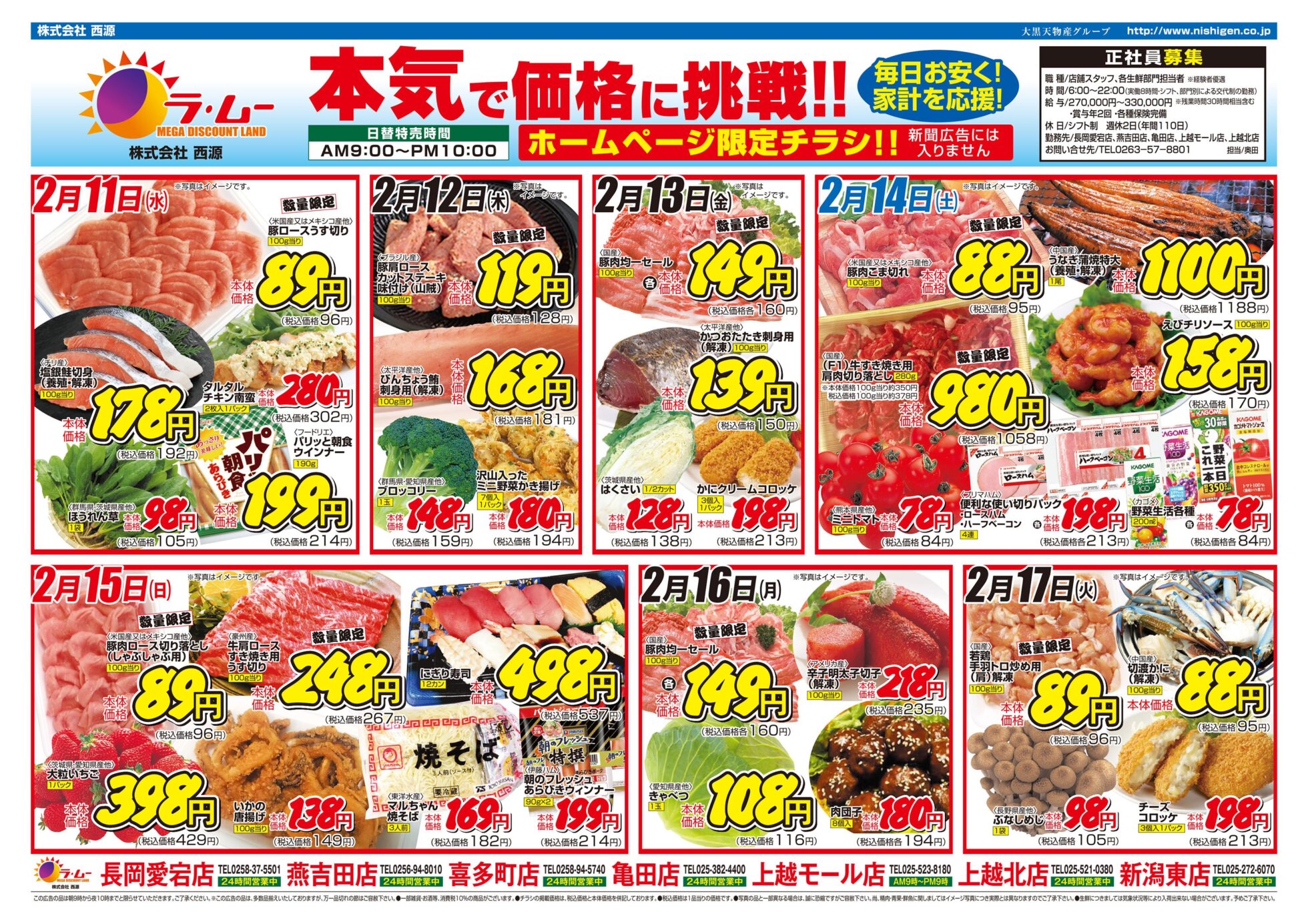 西源 【ラ・ムーチラシ】本気で価格に挑戦‼ 掲載期間:2026年2月11日〜2026年2月17日 上越中越新潟市下越 スーパーラ・ムー 画像をクリックして拡大 prev next セール・新店情報を見逃さない! ガタチラをホーム画面に追加して、 最新情報をすぐチェック▶追加方法はかんたん♪ 関連 豚のロース肉買いに行きたいわ♪
