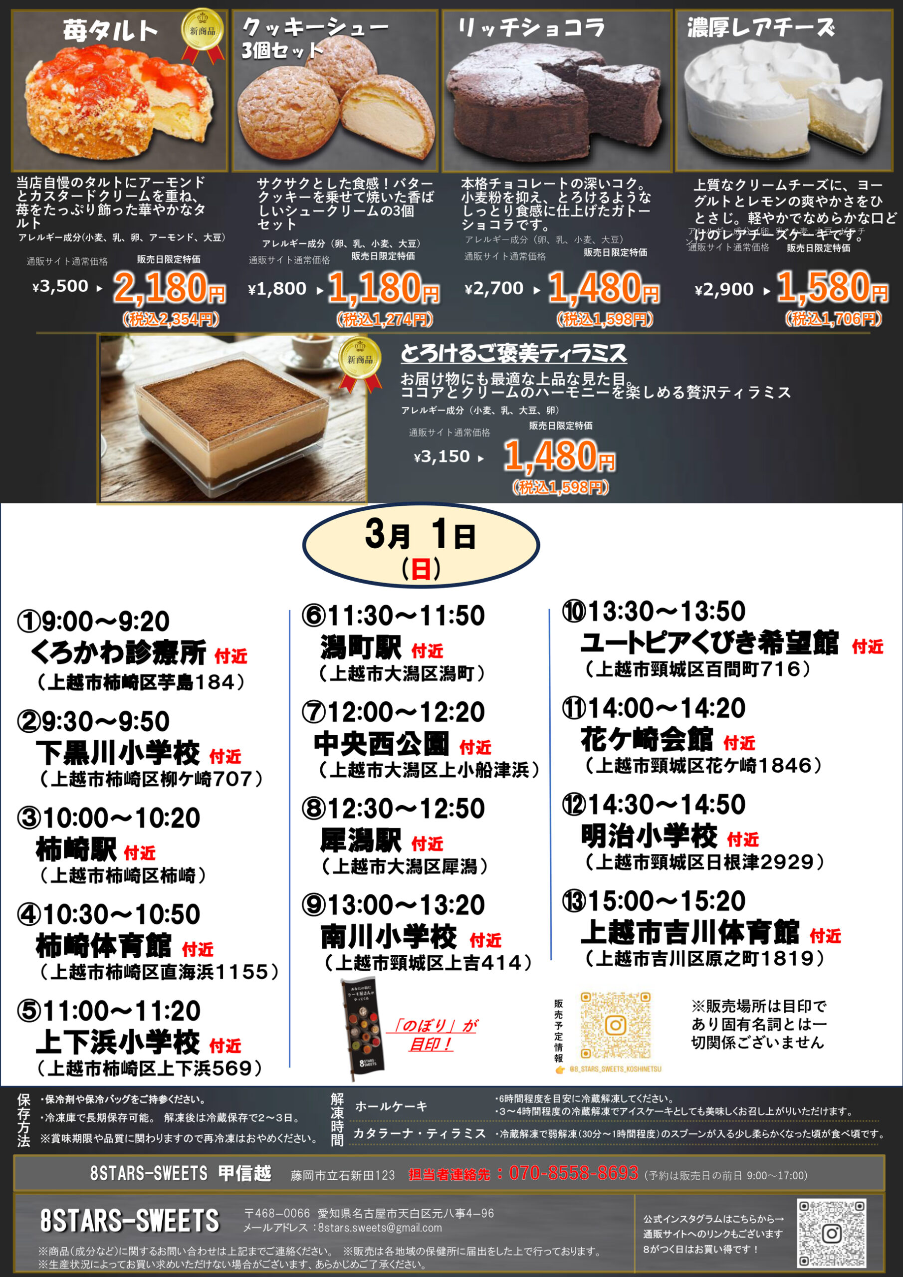 【8STARS-SWEETSチラシ】あなたの街にケーキ屋さんがやってくる3月1日限定移動販売