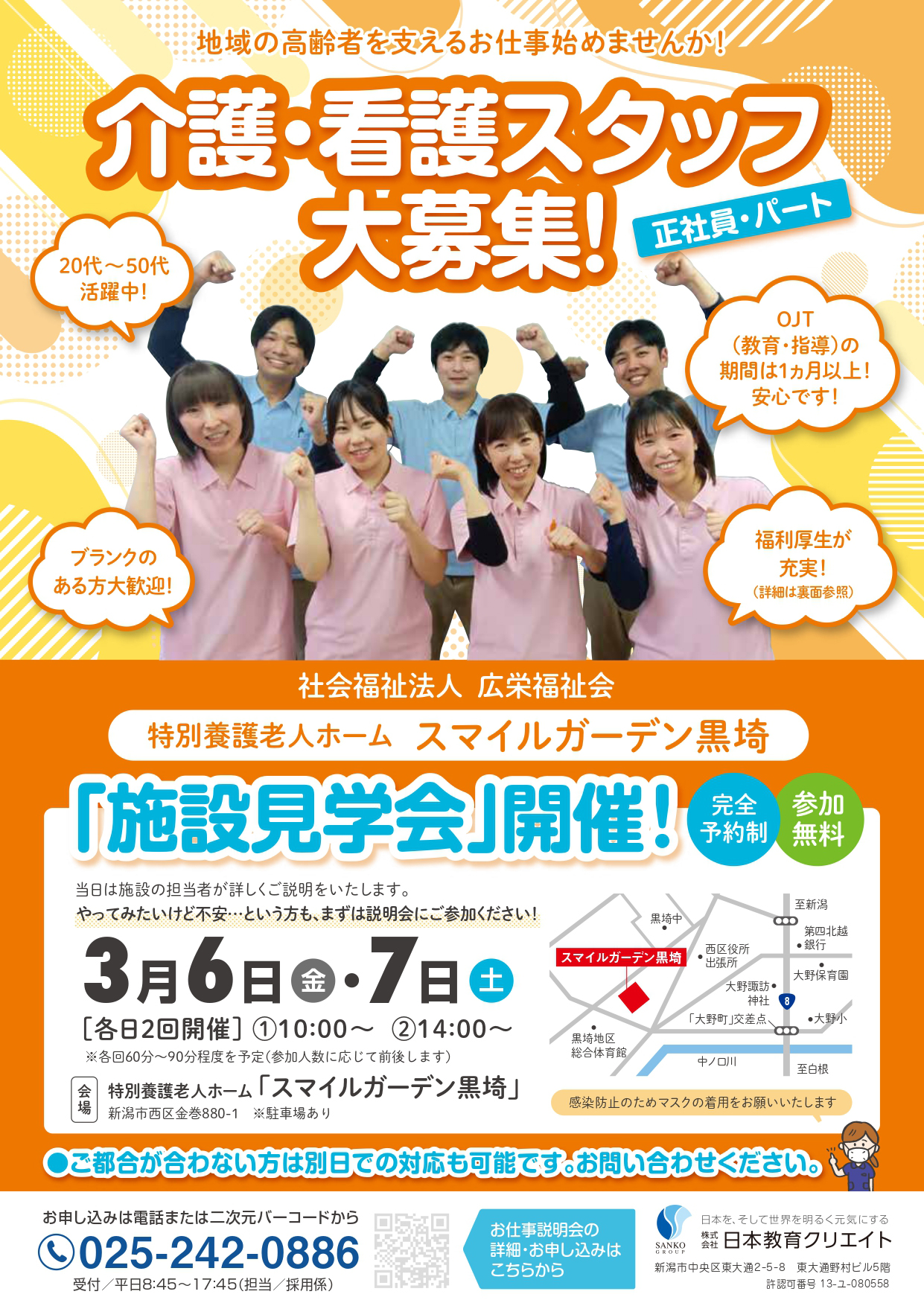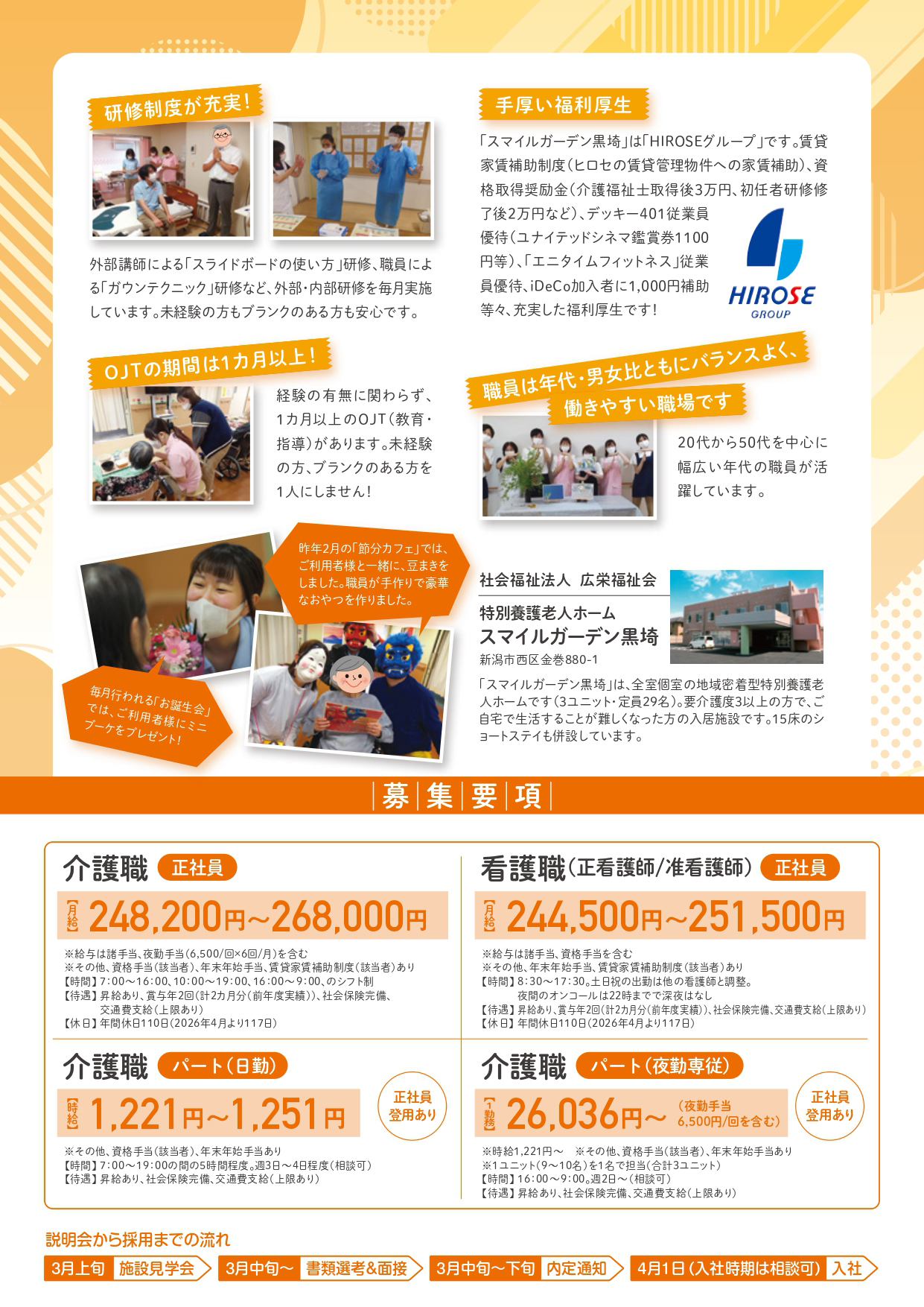 日本教育クリエイト 【スマイルガーデン黒埼チラシ】介護・看護スタッフ大募集! 掲載期間:2026年2月22日〜2026年3月7日 新潟市 求人 画像をクリックして拡大 prev next セール・新店情報を見逃さない! ガタチラをホーム画面に追加して、 最新情報をすぐチェック▶追加方法はかんたん♪ 関連 手厚い福利厚生うれしいわね~♪