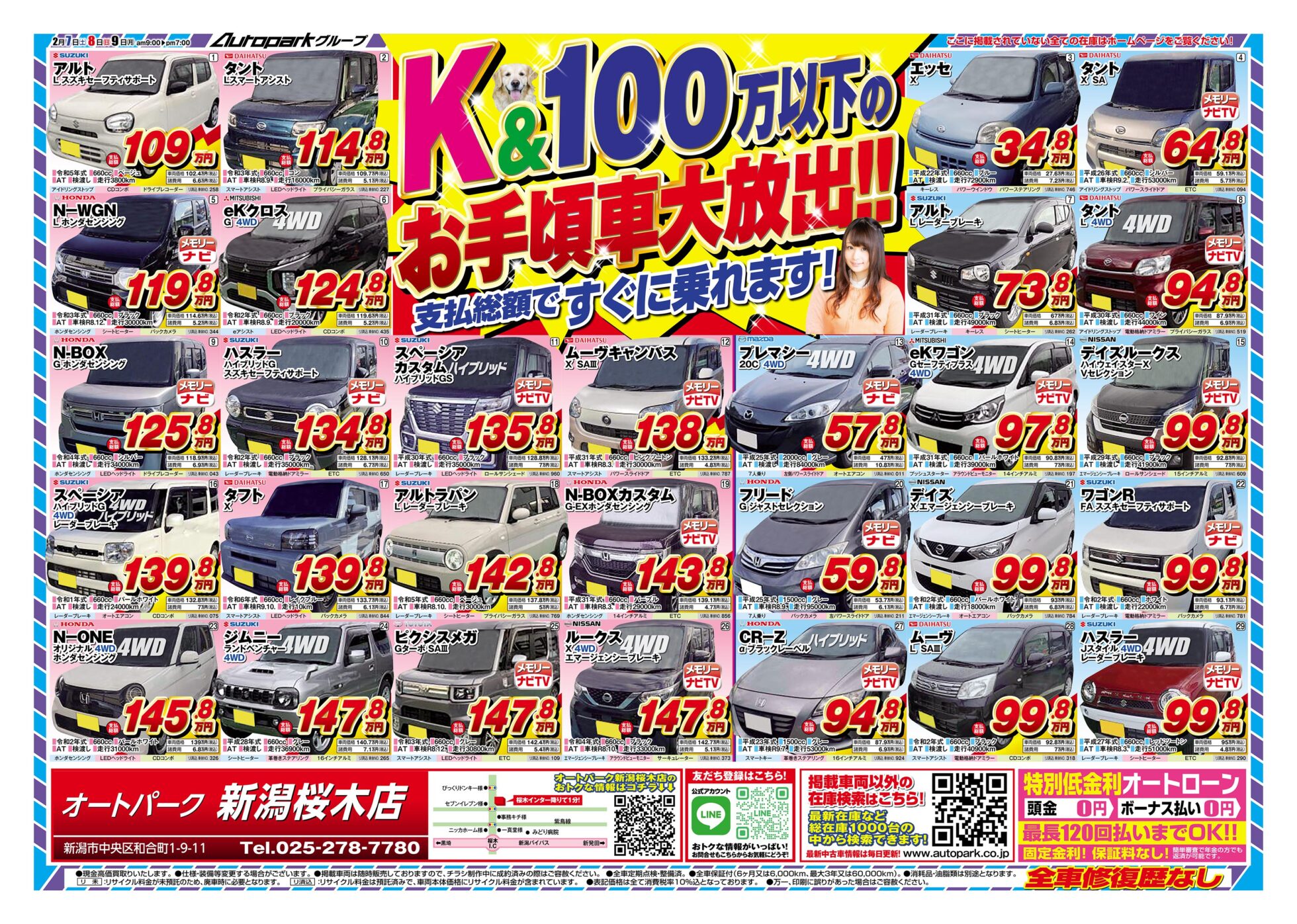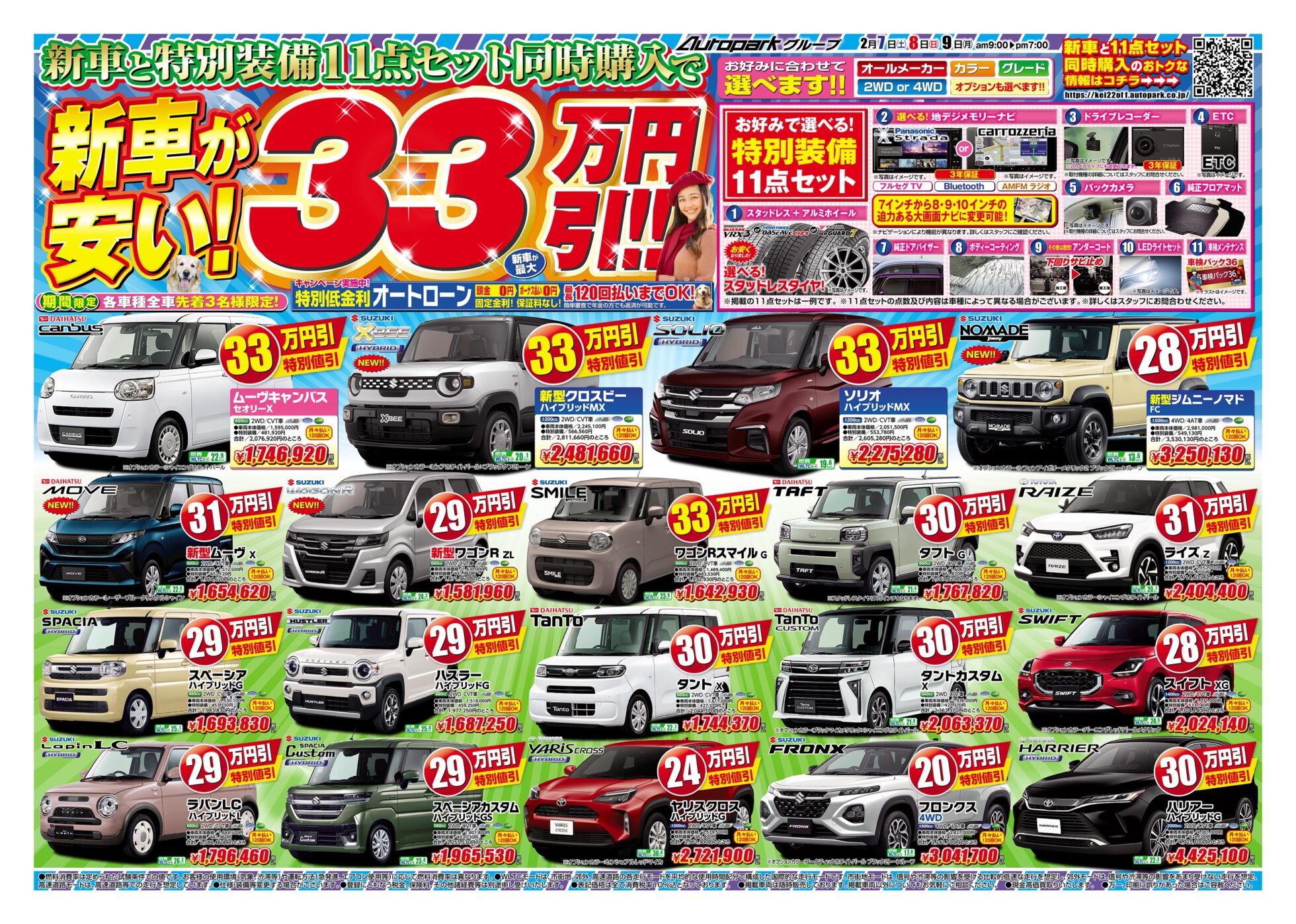 オートパーク新潟桜木店 【オートパーク新潟桜木店チラシ】新車が安い!33万円引!! 掲載期間:2026年2月7日〜2026年2月9日 新潟市 車・カー用品 画像をクリックして拡大 prev next セール・新店情報を見逃さない! ガタチラをホーム画面に追加して、 最新情報をすぐチェック▶追加方法はかんたん♪ 関連 新車がお得に買えるのは嬉しいわ~♪