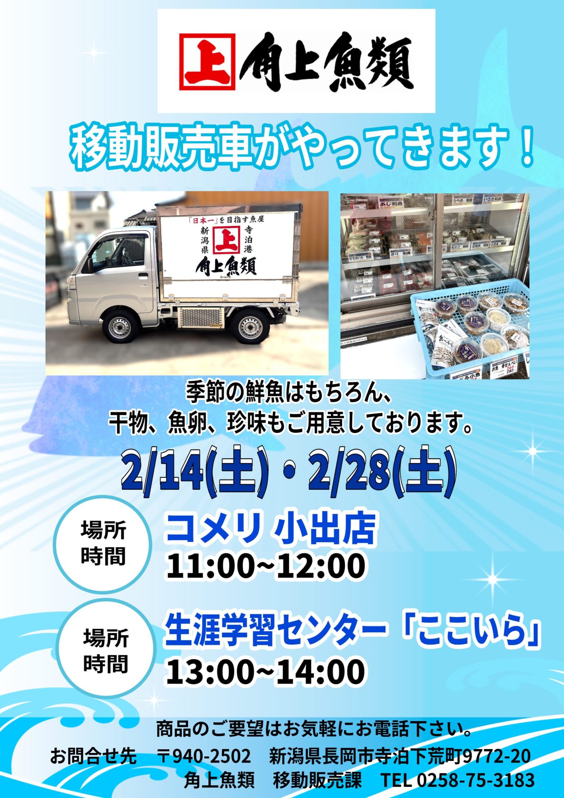【角上魚類チラシ】移動販売車 コメリ小出店/生涯学習センターここいら