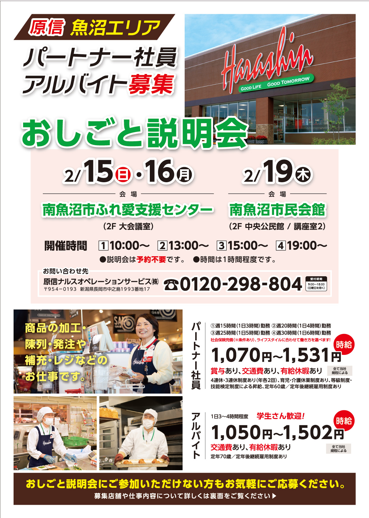 原信ナルス 【原信ナルス魚沼エリアチラシ】パートナー社員・アルバイト 募集<おしごと説明会> 掲載期間:2026年2月7日〜2026年2月19日 中越 スーパー原信ナルス求人 画像をクリックして拡大 prev next 対象店舗:十日町店・西小千谷店・小出東店・十日町北店・塩沢店・桜町店・川窪店・六日町店 セール・新店情報を見逃さない! ガタチラをホーム画面に追加して、 最新情報をすぐチェック▶追加方法はかんたん♪ 関連 私も働きたいわ!