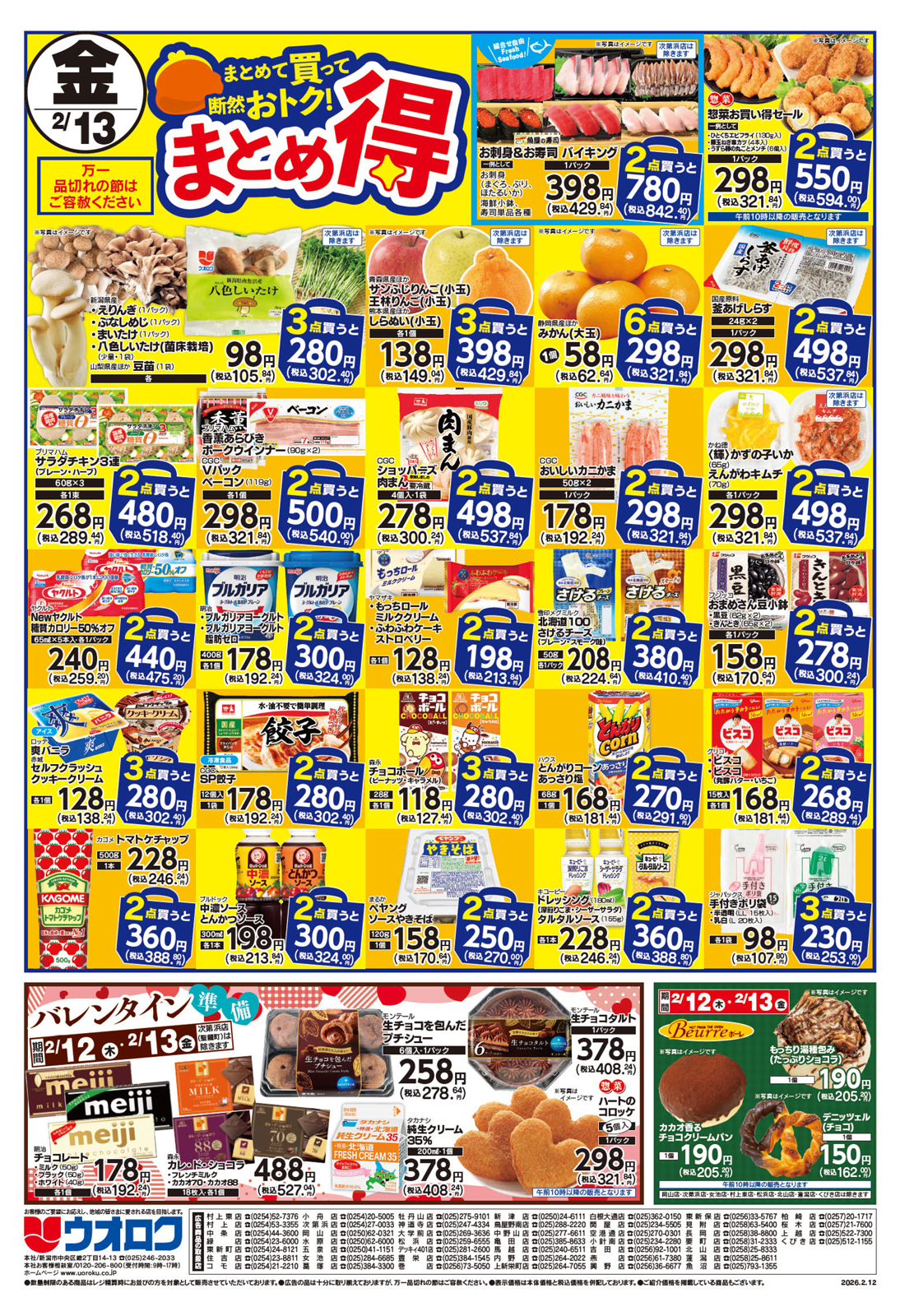 ウオロク 【ウオロクチラシ】マル得セール 掲載期間:2026年2月12日〜2026年2月13日 上越中越新潟市下越 スーパーウオロク 画像をクリックして拡大 prev next 対象:全店 セール・新店情報を見逃さない! ガタチラをホーム画面に追加して、 最新情報をすぐチェック▶追加方法はかんたん♪ 関連 まとめてお得に買い物しましょう!