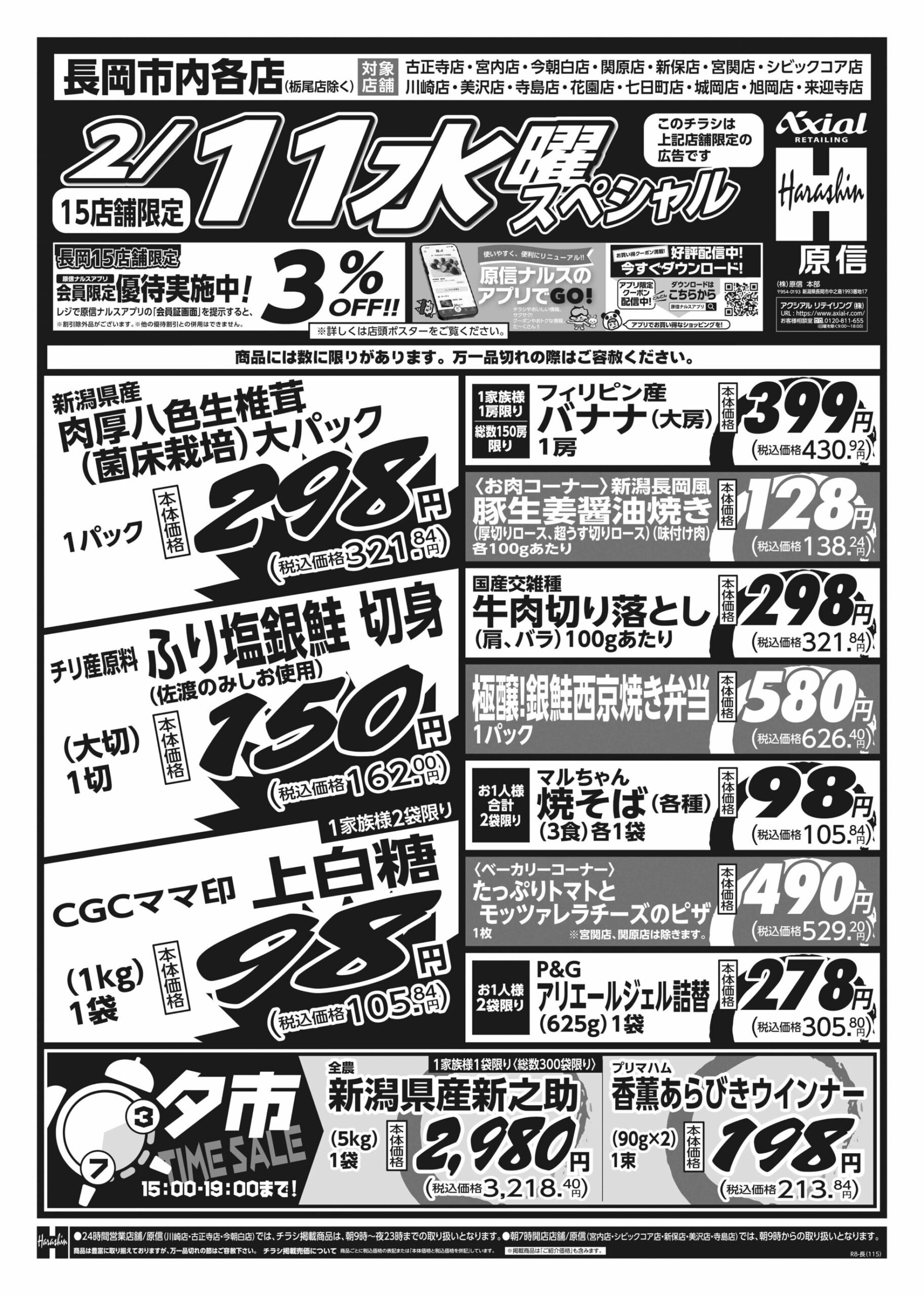 原信ナルス 【原信ナルス長岡市内店チラシ】火曜スペシャル/水曜スペシャル 掲載期間:2026年2月10日〜2026年2月11日 中越 スーパー原信ナルス 画像をクリックして拡大 prev next 対象:古正寺店・宮内店・今朝白店・関原店・新保店・宮関店・シビックコア店・川崎店・美沢店・寺島店・花園店・七日町店・城岡店・旭岡店・来迎寺店 セール・新店情報を見逃さない! ガタチラをホーム画面に追加して、 最新情報をすぐチェック▶追加方法はかんたん♪ 関連 11日は砂糖がお買い得ね!