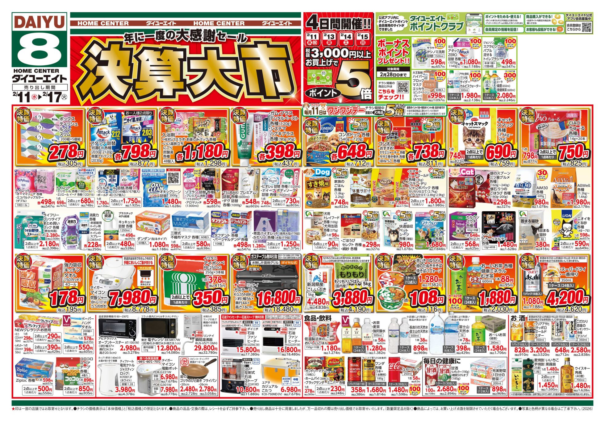 ダイユーエイト 【ダイユーエイトチラシ】決算大市 掲載期間:2026年2月11日〜2026年2月17日 下越 ホームセンター 画像をクリックして拡大 prev next セール・新店情報を見逃さない! ガタチラをホーム画面に追加して、 最新情報をすぐチェック▶追加方法はかんたん♪ 関連 お買い得品がたくさんね!