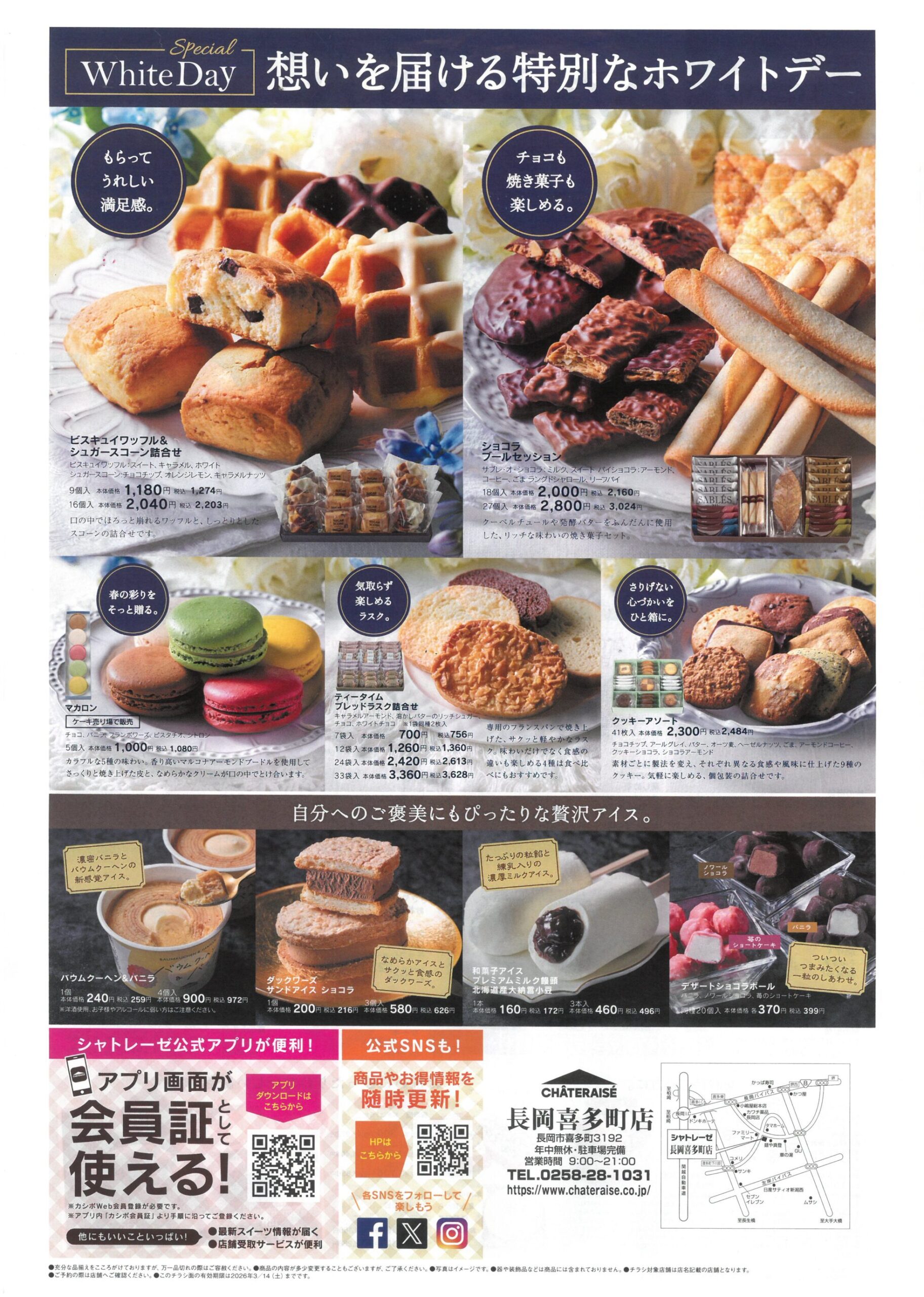 シャトレーゼ長岡喜多町店 【シャトレーゼ長岡喜多町店チラシ】ひなまつり/ホワイトデー 掲載期間:2026年2月13日〜2026年3月3日 中越 グルメ 画像をクリックして拡大 prev next セール・新店情報を見逃さない! ガタチラをホーム画面に追加して、 最新情報をすぐチェック▶追加方法はかんたん♪ 関連 ひなまつりのケーキはどれにしようかな? どれもおいしそうで迷っちゃう!