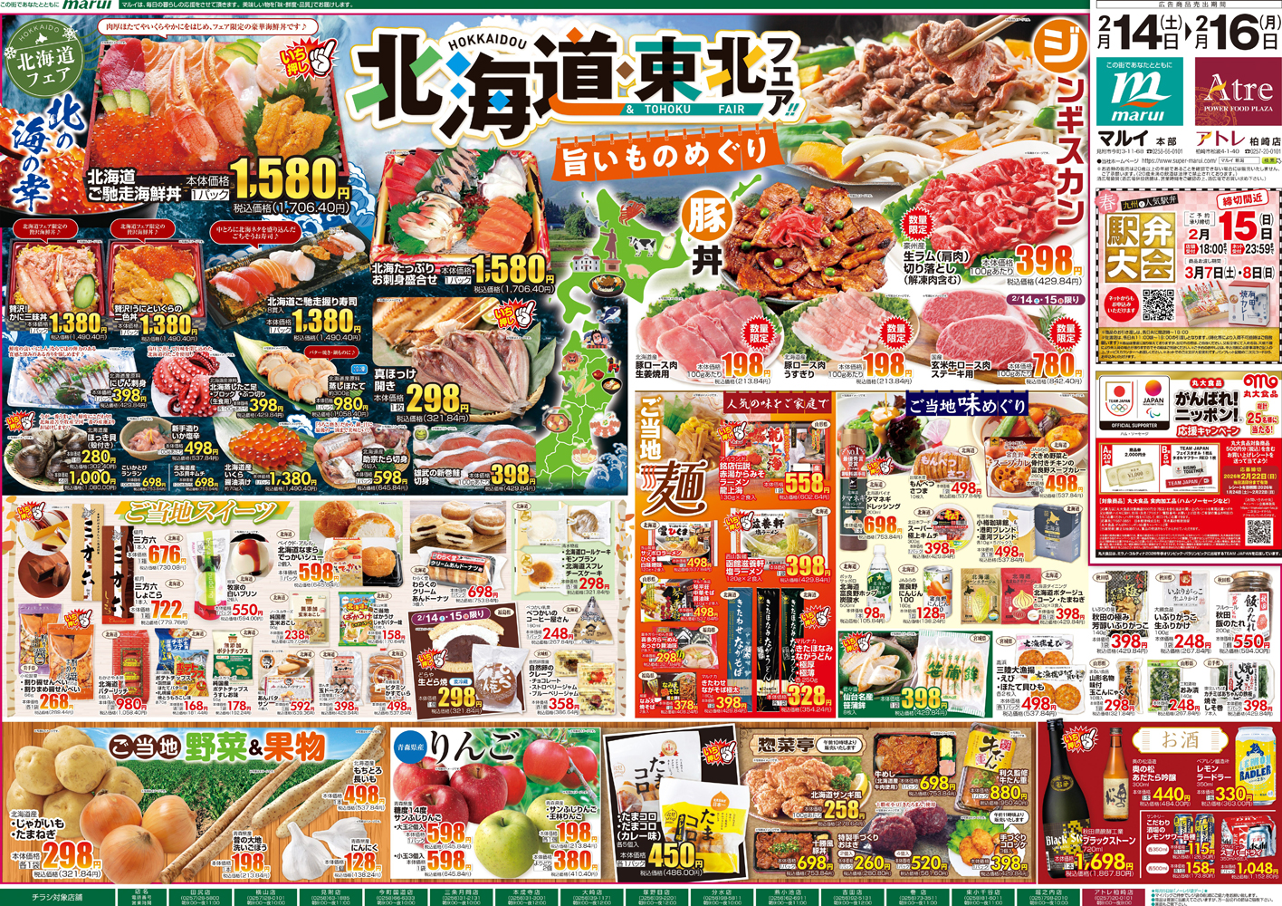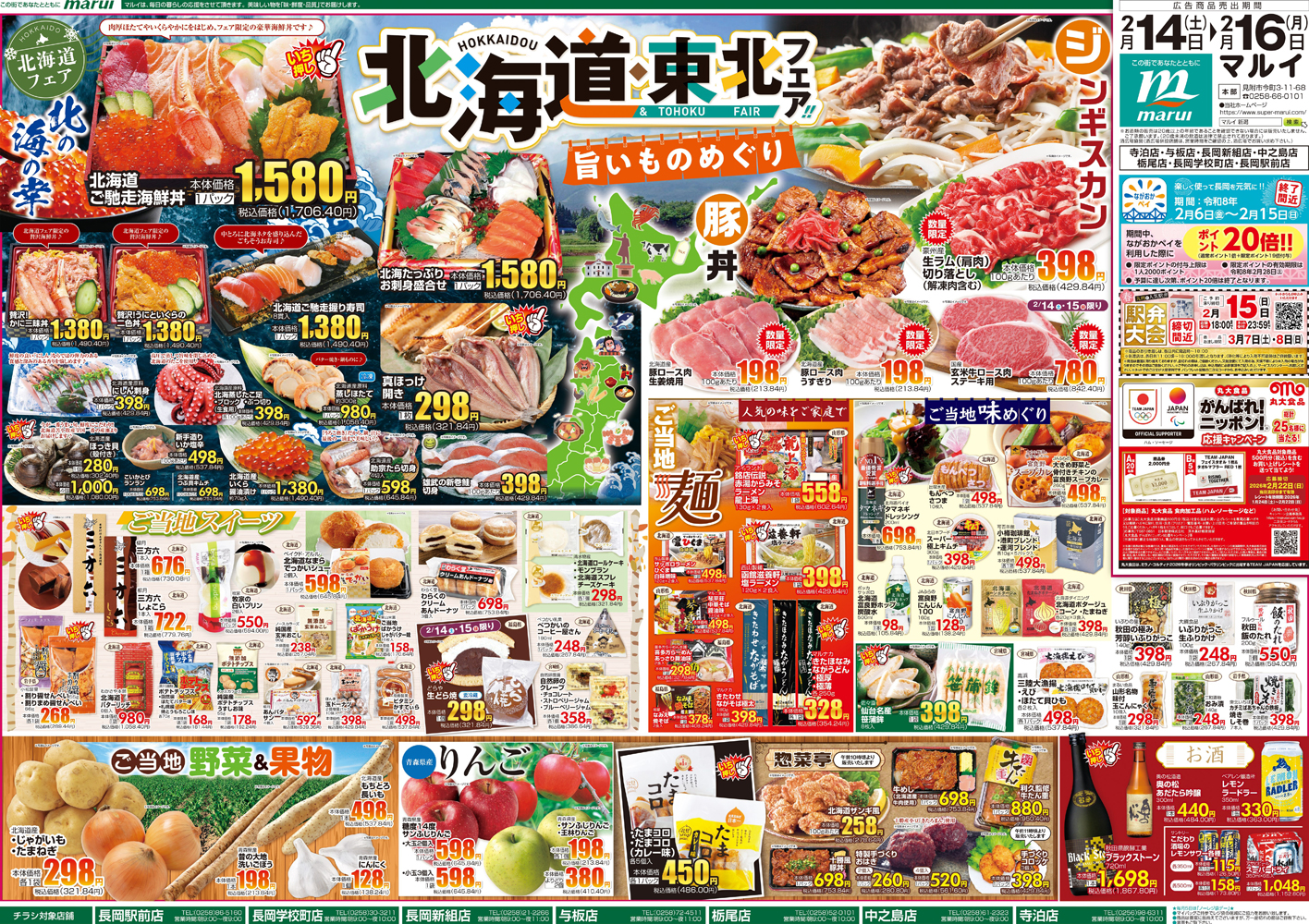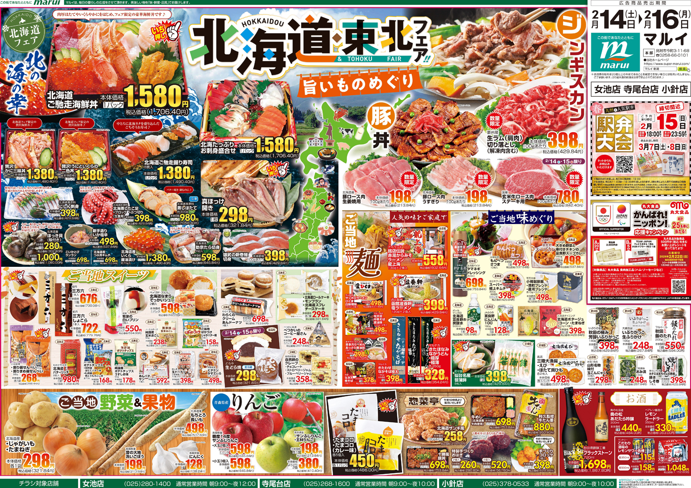 株式会社マルイ 【マルイチラシ】北海道・東北フェア‼旨いものめぐり 掲載期間:2026年2月14日〜2026年2月16日 中越新潟市下越 スーパーマルイ 目次 各店 女池店・寺尾台店・小針店 寺泊店・与板店・長岡新組店・中之島店・栃尾店・長岡学校町店・長岡駅前店 各店 画像をクリックして拡大 prev next 女池店・寺尾台店・小針店 画像をクリックして拡大 prev next 寺泊店・与板店・長岡新組店・中之島店・栃尾店・長岡学校町店・長岡駅前店 画像をクリックして拡大 prev next セール・新店情報を見逃さない! ガタチラをホーム画面に追加して、 最新情報をすぐチェック▶追加方法はかんたん♪ 関連 北海道と東北のおいしいものを食べて、旅行気分ね!