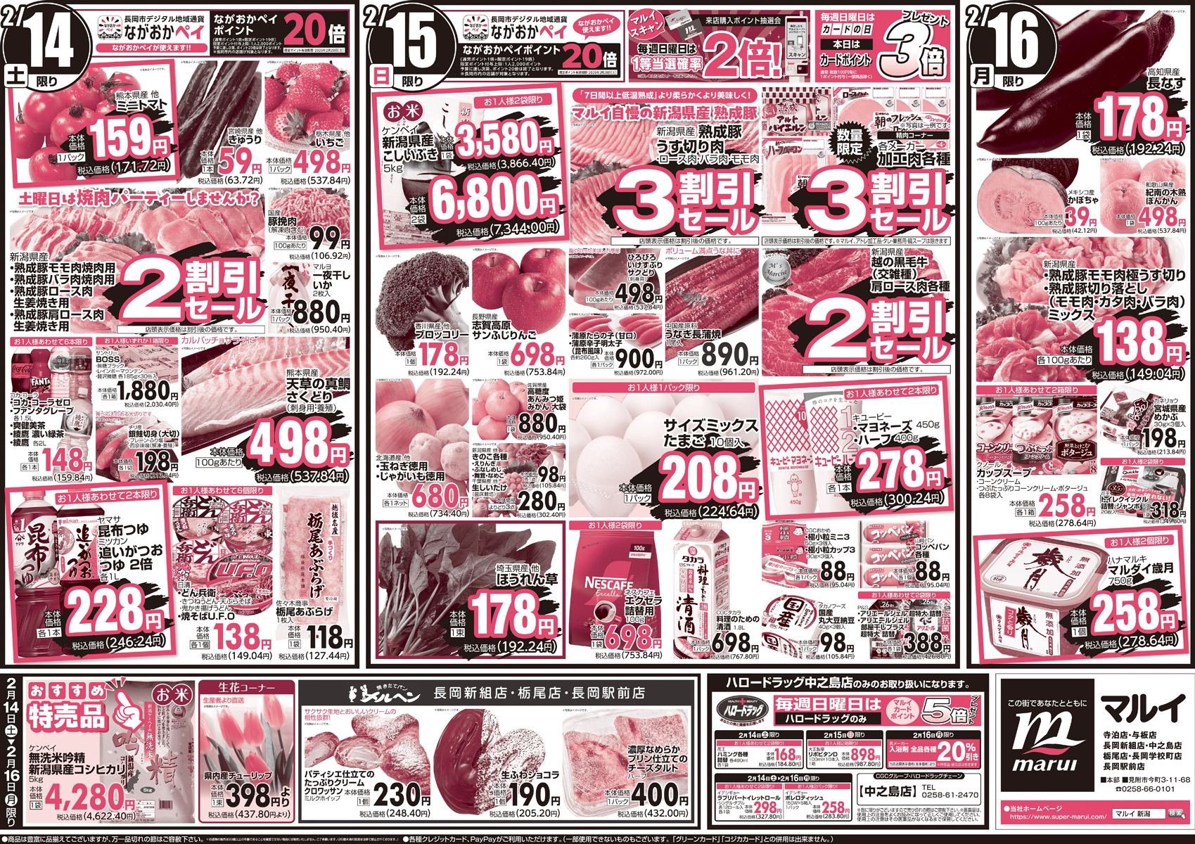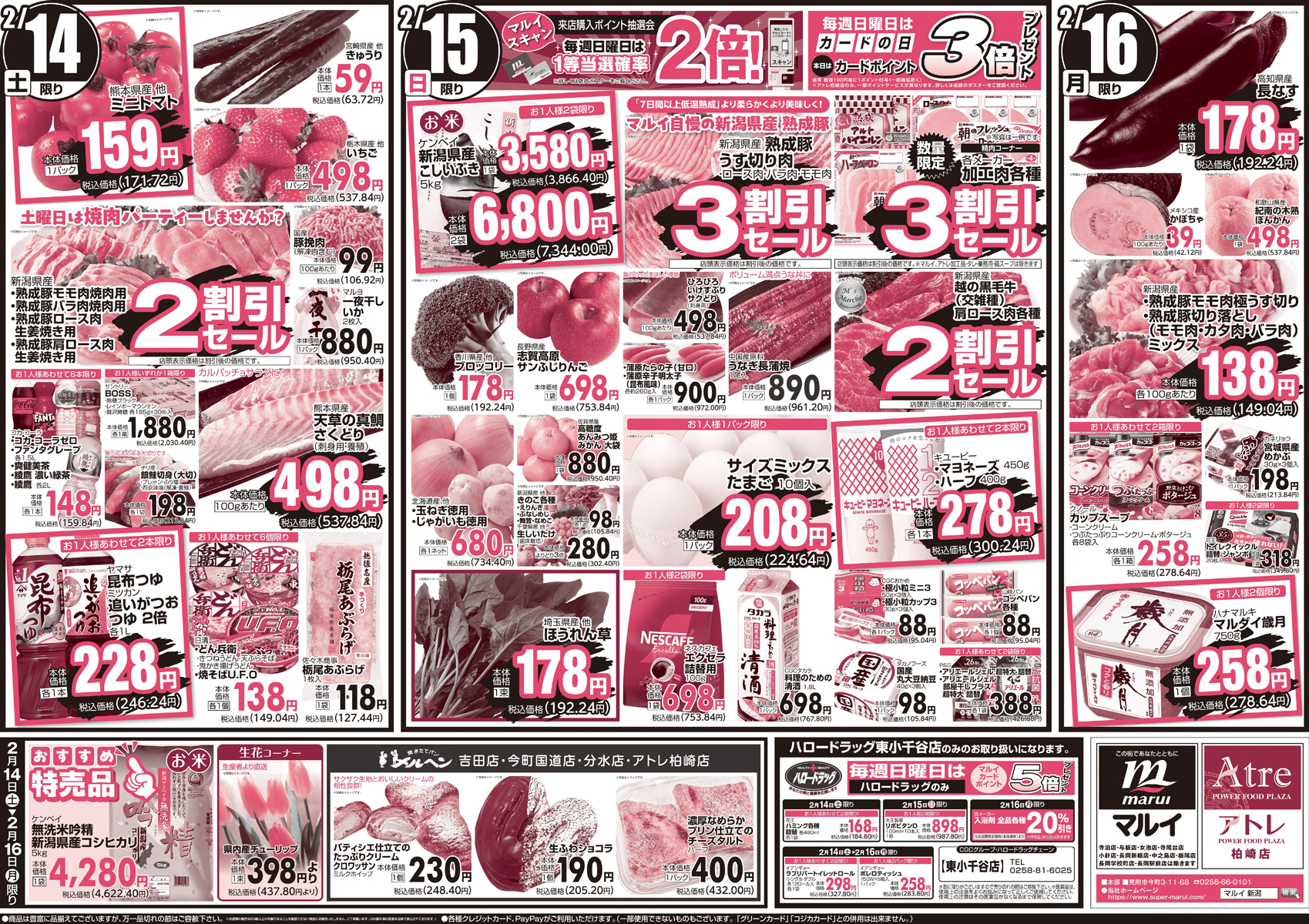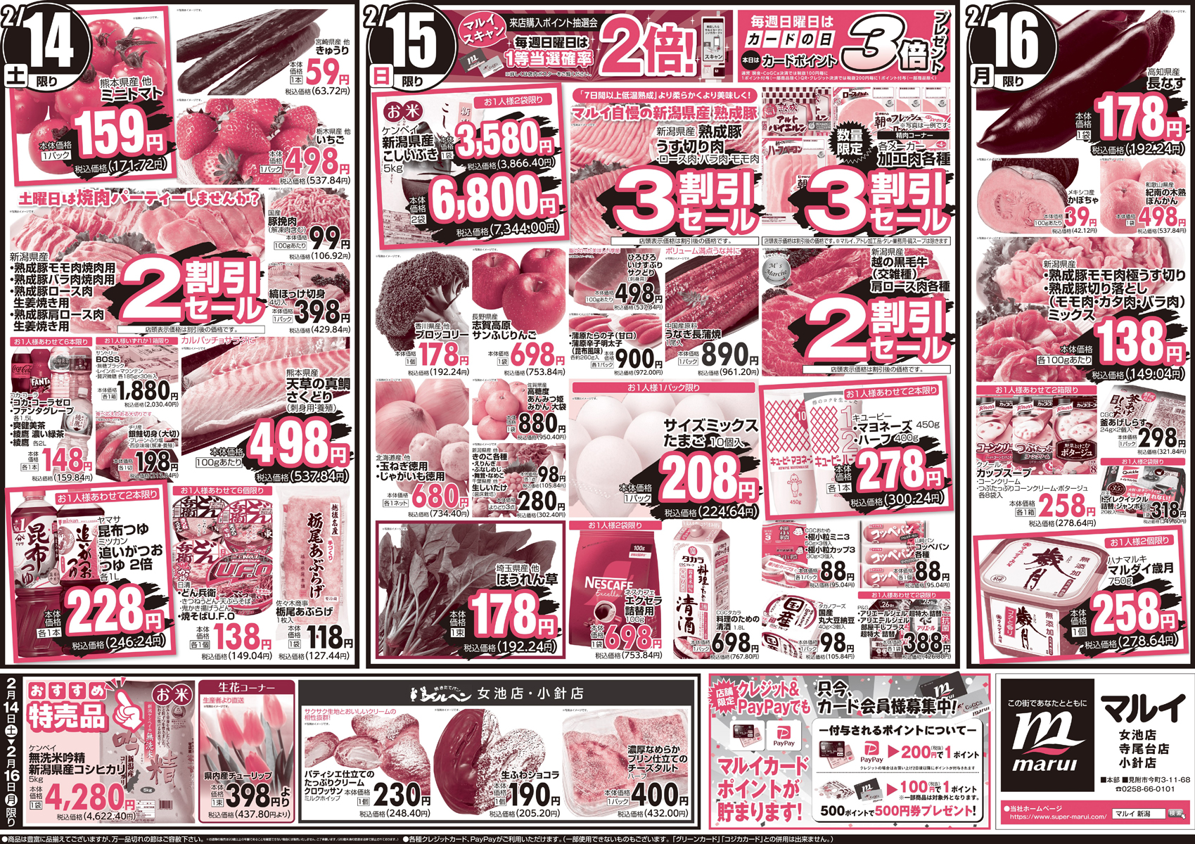 株式会社マルイ 【マルイチラシ】北海道・東北フェア‼旨いものめぐり 掲載期間:2026年2月14日〜2026年2月16日 中越新潟市下越 スーパーマルイ 目次 各店 女池店・寺尾台店・小針店 寺泊店・与板店・長岡新組店・中之島店・栃尾店・長岡学校町店・長岡駅前店 各店 画像をクリックして拡大 prev next 女池店・寺尾台店・小針店 画像をクリックして拡大 prev next 寺泊店・与板店・長岡新組店・中之島店・栃尾店・長岡学校町店・長岡駅前店 画像をクリックして拡大 prev next セール・新店情報を見逃さない! ガタチラをホーム画面に追加して、 最新情報をすぐチェック▶追加方法はかんたん♪ 関連 北海道と東北のおいしいものを食べて、旅行気分ね!
