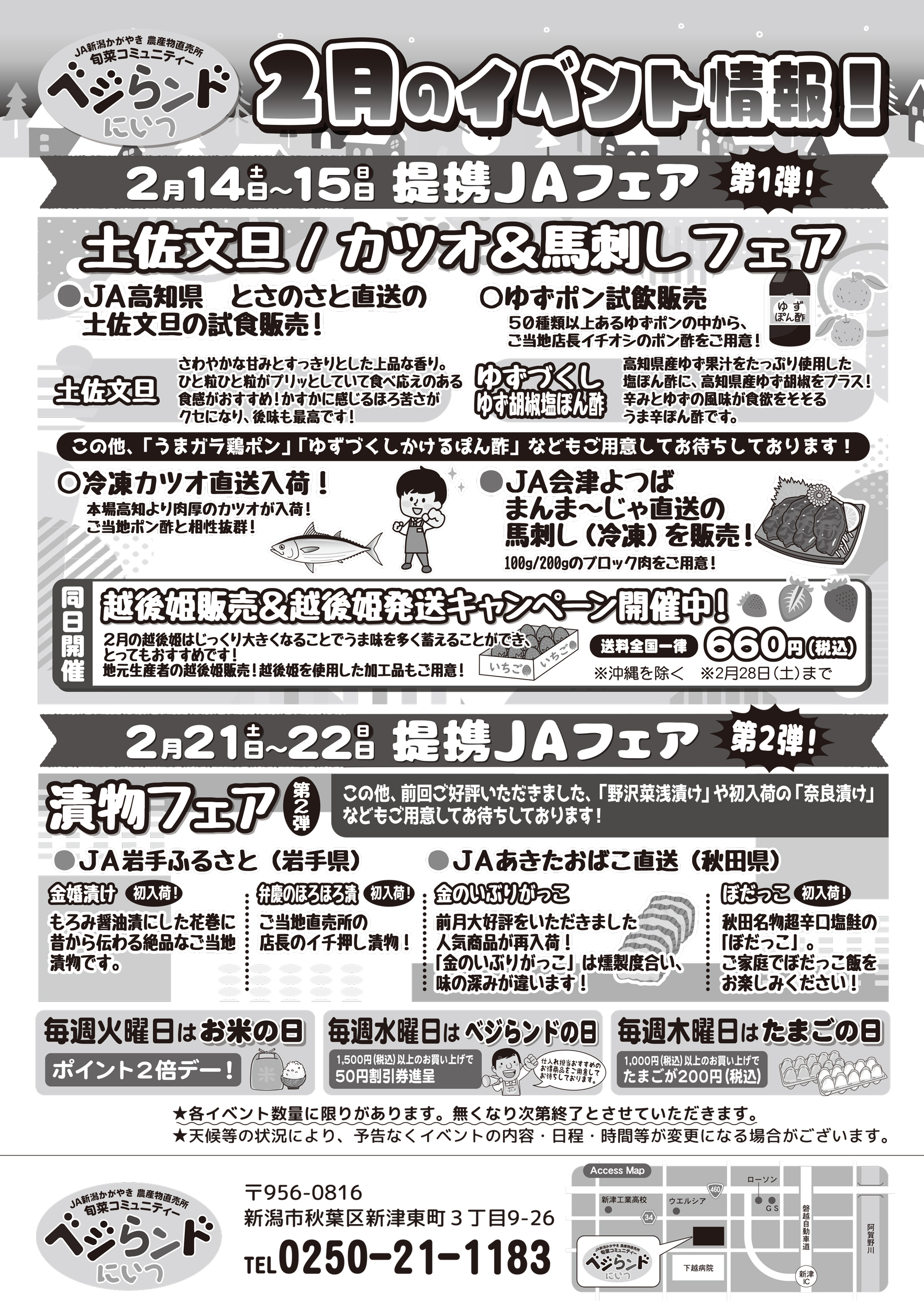 JA新潟かがやき 【ベジらンドにいつチラシ】2月のイベント情報! 掲載期間:2026年2月14日〜2026年2月28日 新潟市 生活サービス 画像をクリックして拡大 prev next セール・新店情報を見逃さない! ガタチラをホーム画面に追加して、 最新情報をすぐチェック▶追加方法はかんたん♪ 関連 馬刺しで一杯やりたいな♪