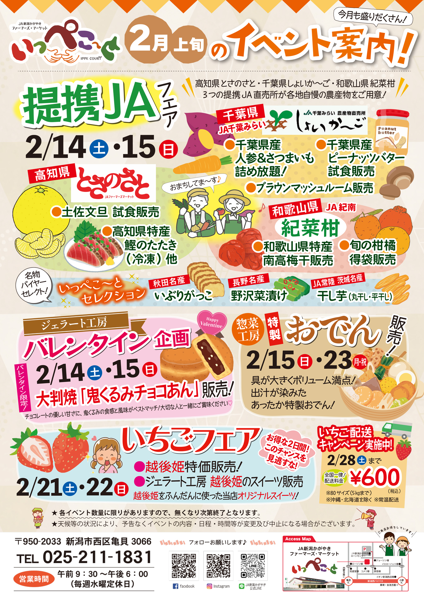 JA新潟かがやき 【いっぺこ~とチラシ】2月上旬のイベント案内! 掲載期間:2026年2月14日〜2026年2月28日 新潟市 生活サービス 画像をクリックして拡大 prev next セール・新店情報を見逃さない! ガタチラをホーム画面に追加して、 最新情報をすぐチェック▶追加方法はかんたん♪ 関連 おいしいそうな企画が盛り沢山ね!