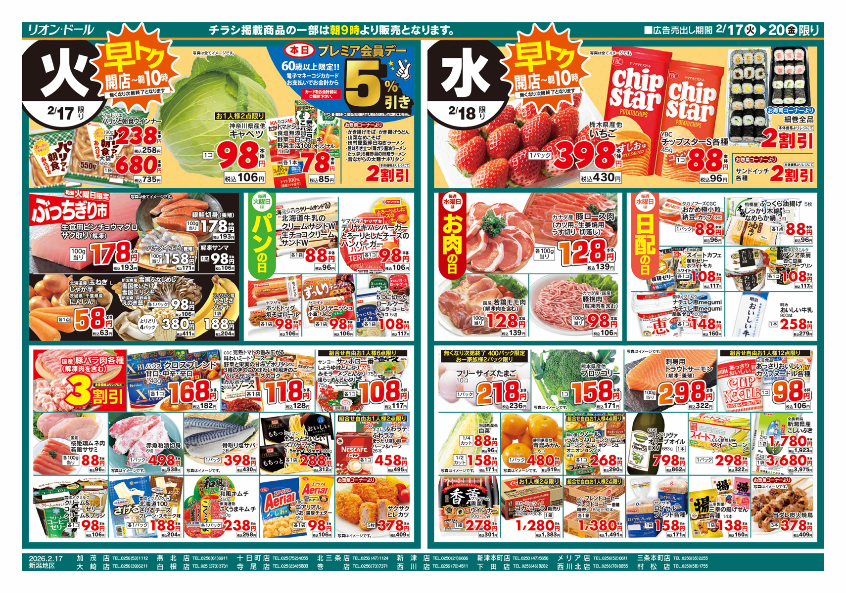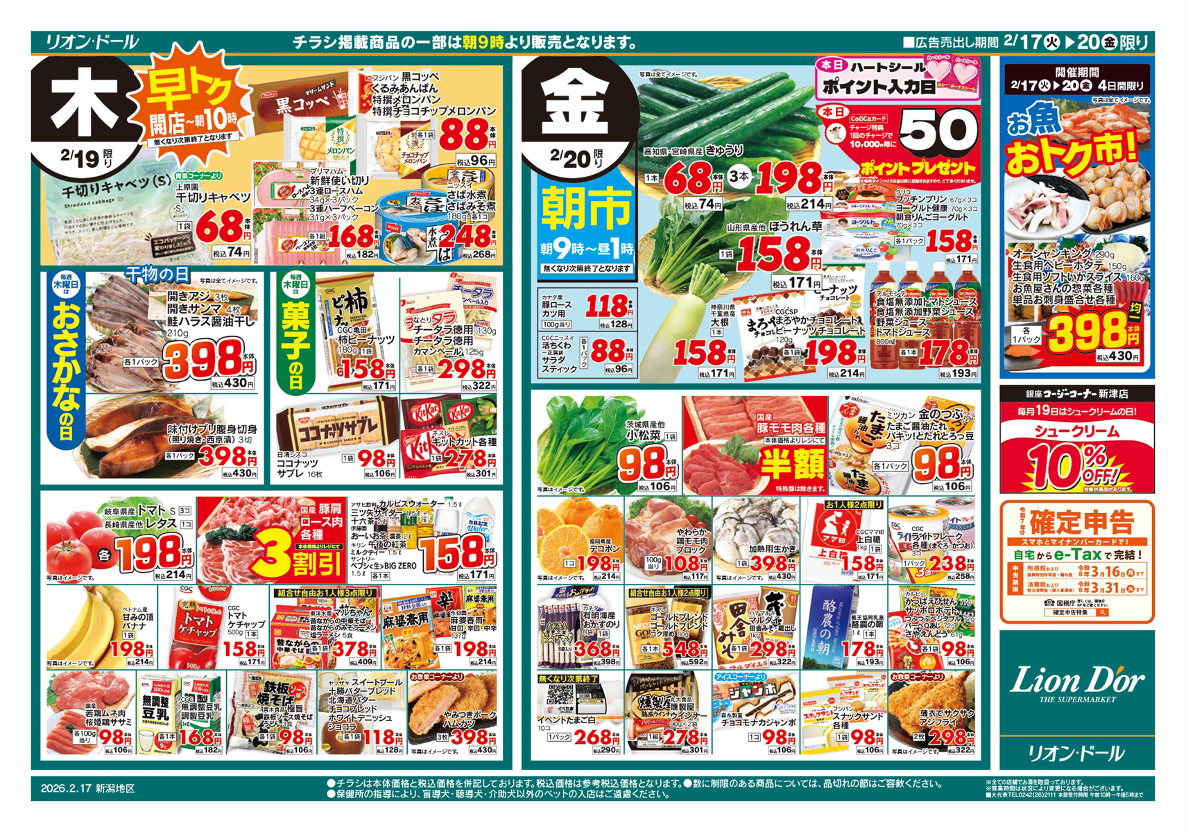 株)リオン・ドールコーポレーション 【リオン・ドールチラシ】早トク 掲載期間:2026年2月17日〜2026年2月19日 中越新潟市下越 スーパーリオン・ドール 画像をクリックして拡大 prev next 「リオン・ドール」のホームページはこちらから セール・新店情報を見逃さない! ガタチラをホーム画面に追加して、 最新情報をすぐチェック▶追加方法はかんたん♪ 関連 開店時間に合わせて行くとお得ね!