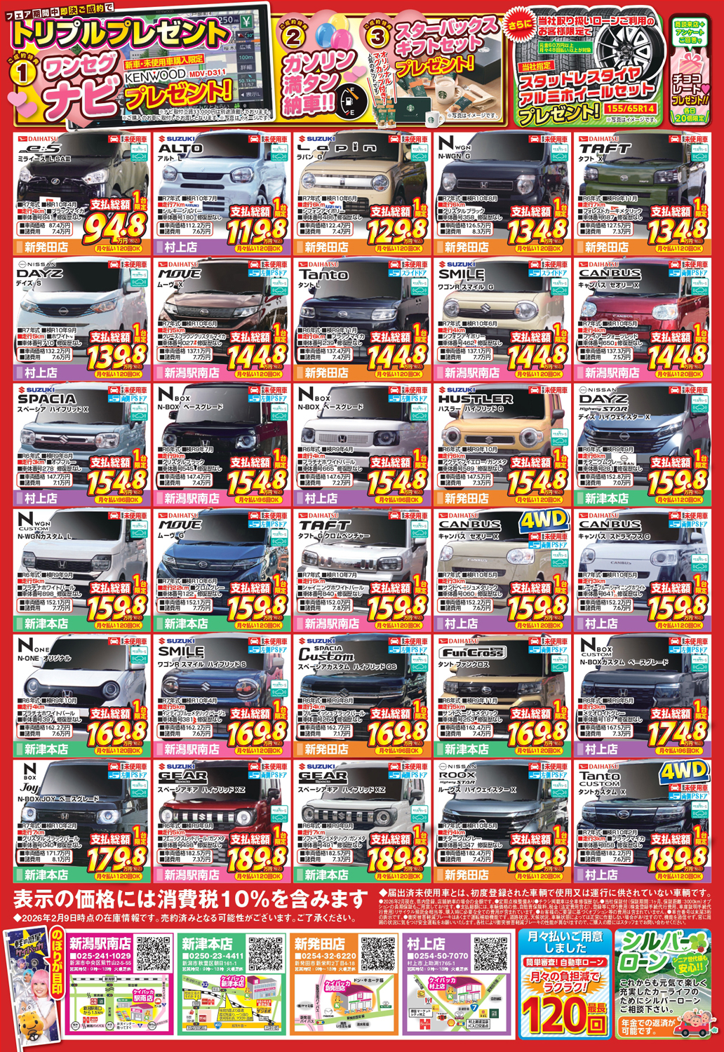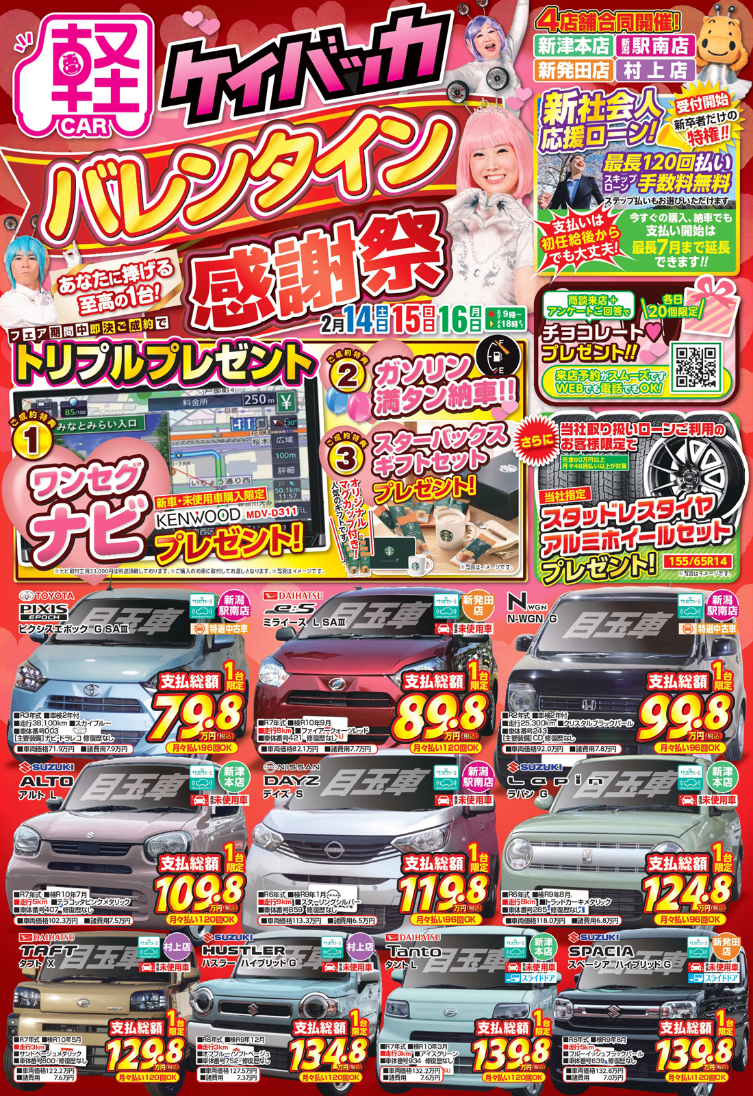 川内自動車 【ケイバッカチラシ】バレンタイン感謝祭 掲載期間:2026年2月14日〜2026年2月16日 新潟市下越 車・カー用品 画像をクリックして拡大 prev next セール・新店情報を見逃さない! ガタチラをホーム画面に追加して、 最新情報をすぐチェック▶追加方法はかんたん♪ 関連 チョコレートのプレゼントがあるんですって♡